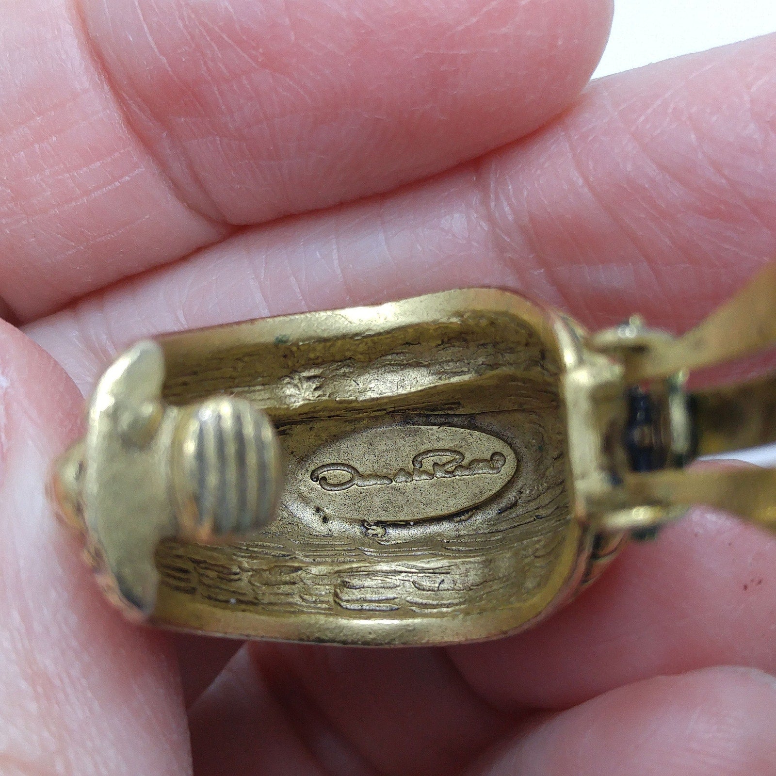 This is a stunning pair of Oscar de la Renta hammered gold plated clip earrings from the 1980s. Featuring a bold domed design with textured hammered gold finish and rope-like edging, these earrings are the perfect statement accessory. Each earring is signed on the inside and on the clip backs, reflecting the high-quality craftsmanship of Oscar de la Renta’s iconic designs.
