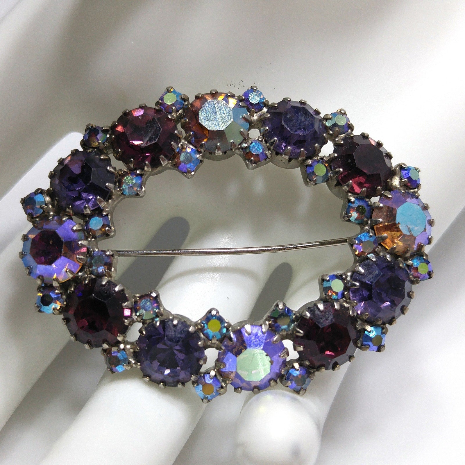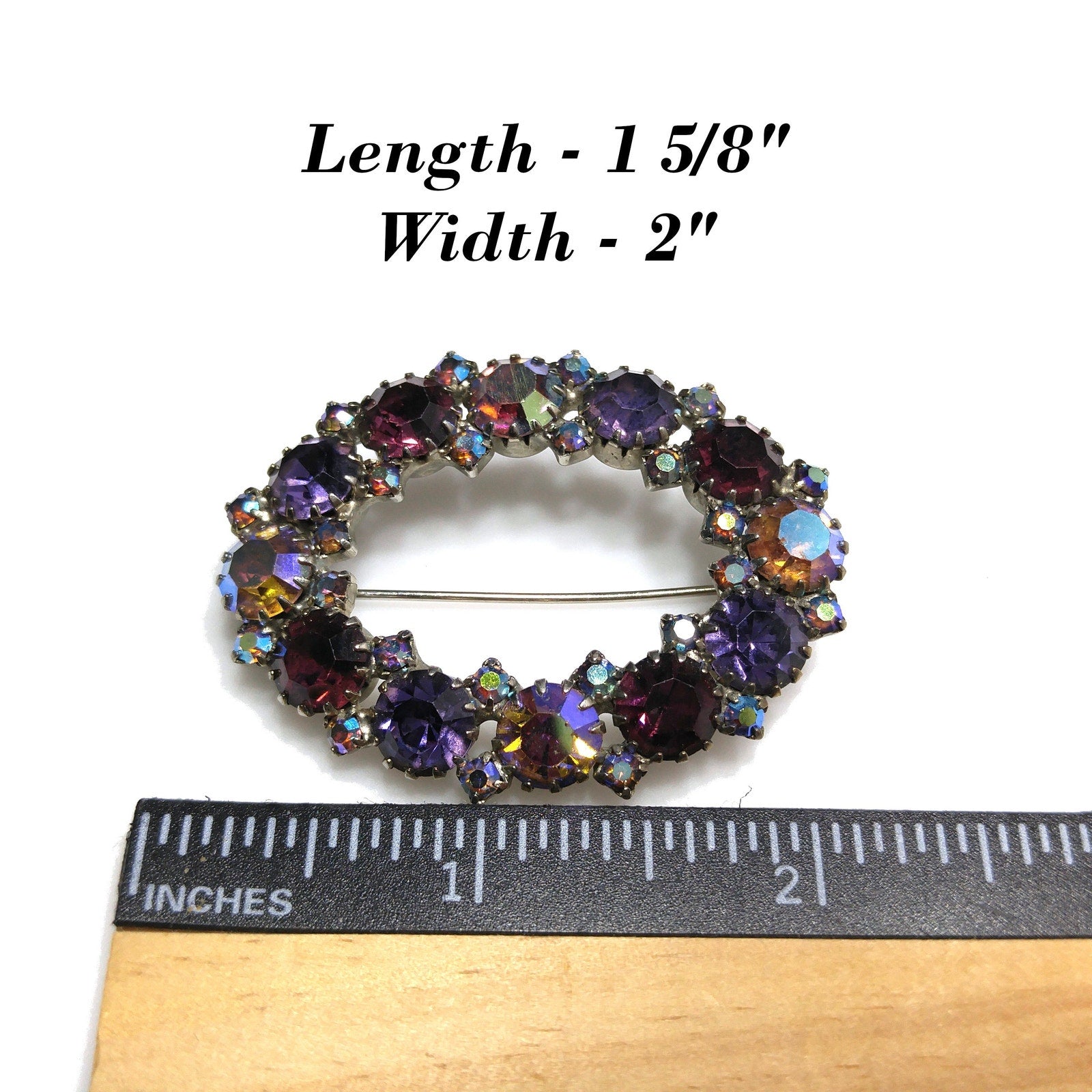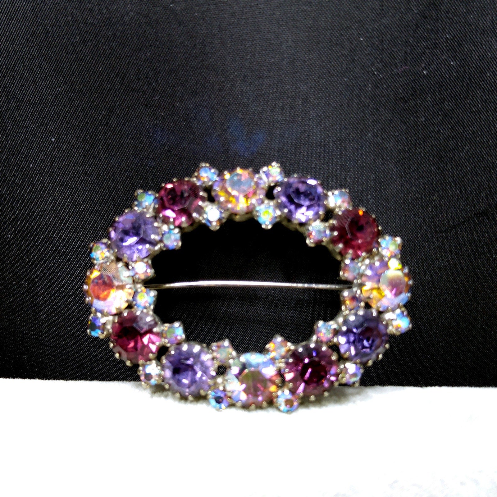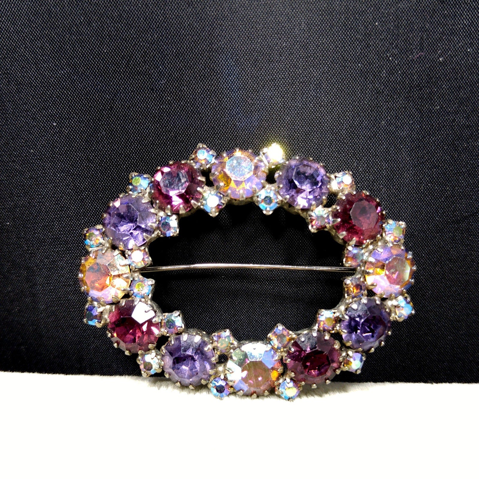 *Description: This is a beautiful oval purple aurora borealis lavender crystal rhinestone brooch on a rhodium plated backing. This brooch is not signed but probably another piece in the set was signed as this is designer beautiful. The rhinestones are dog-toothed prong set. The pin is a little bent from pushing it through thick cloth. Gorgeous brooch. This would be a great addition to your vintage jewelry collection or make a great vintage gift!