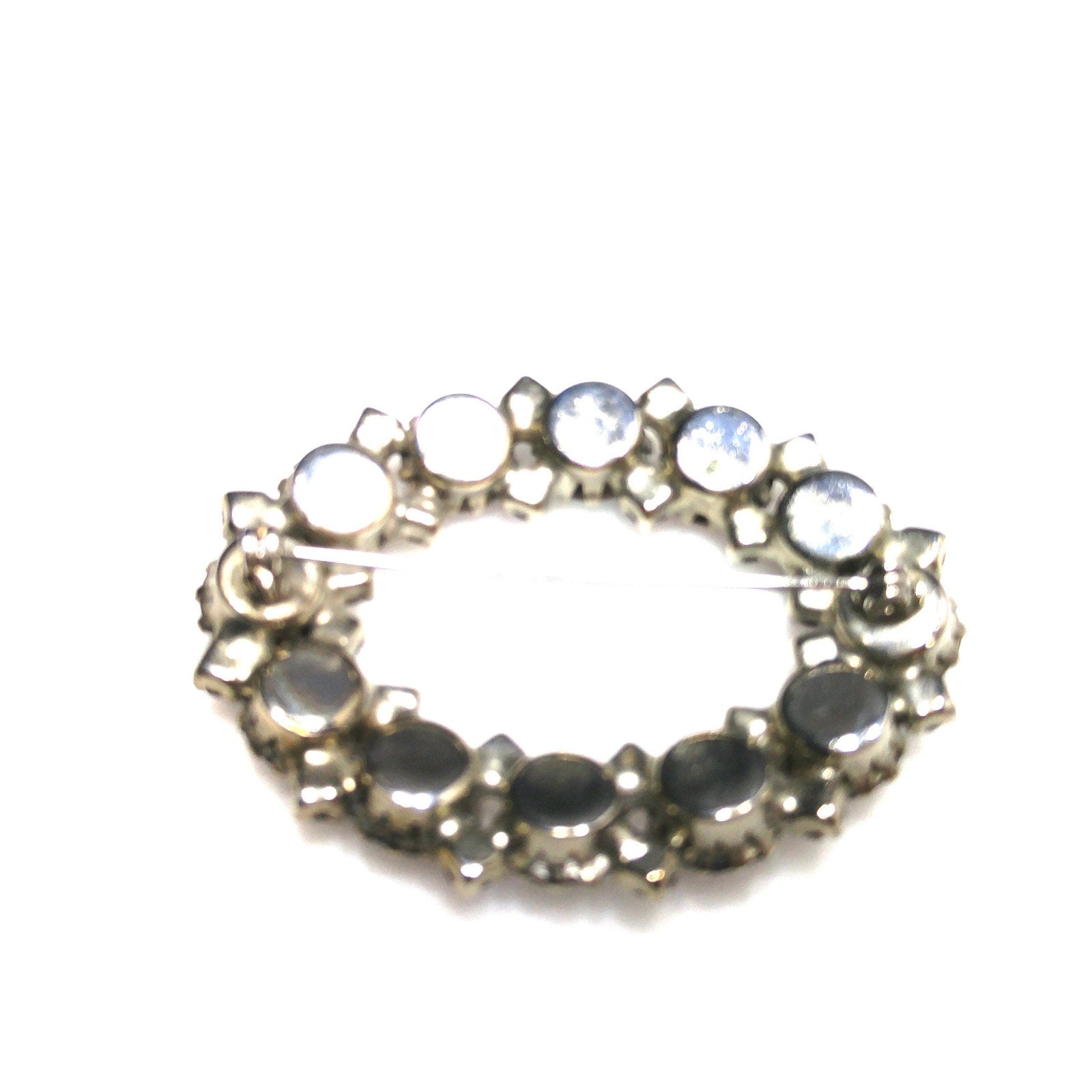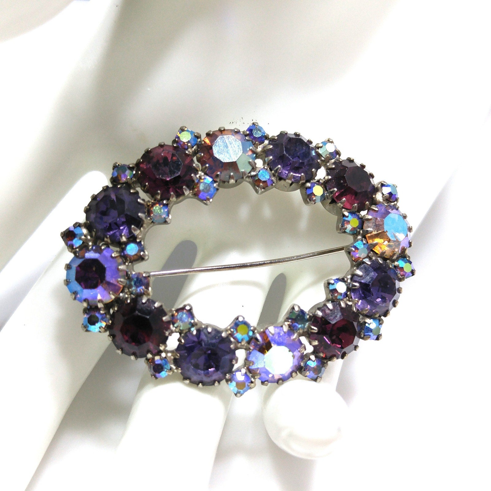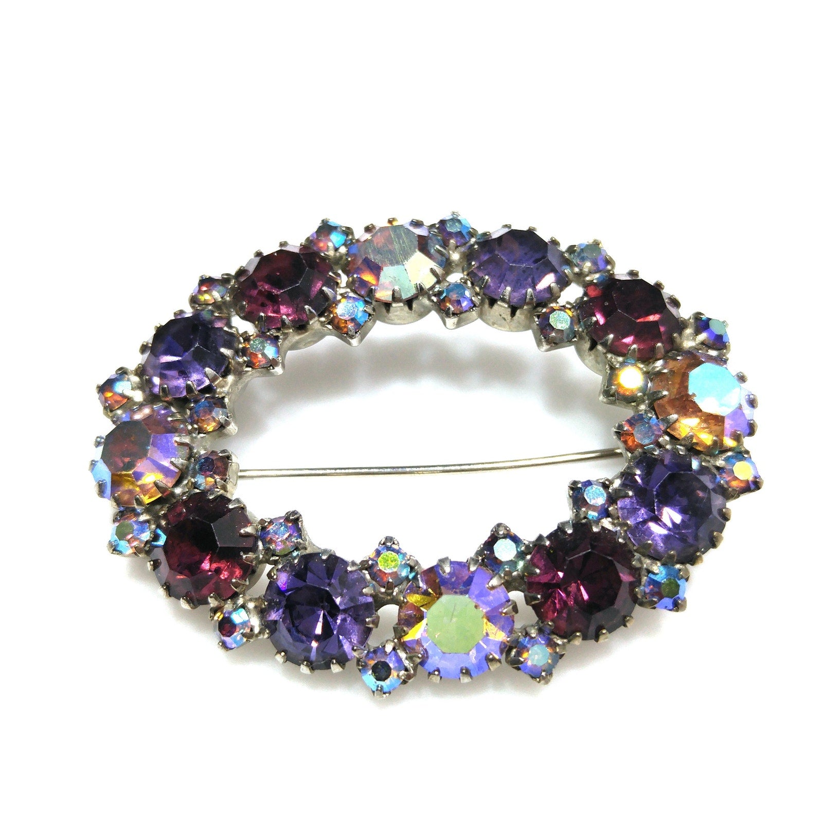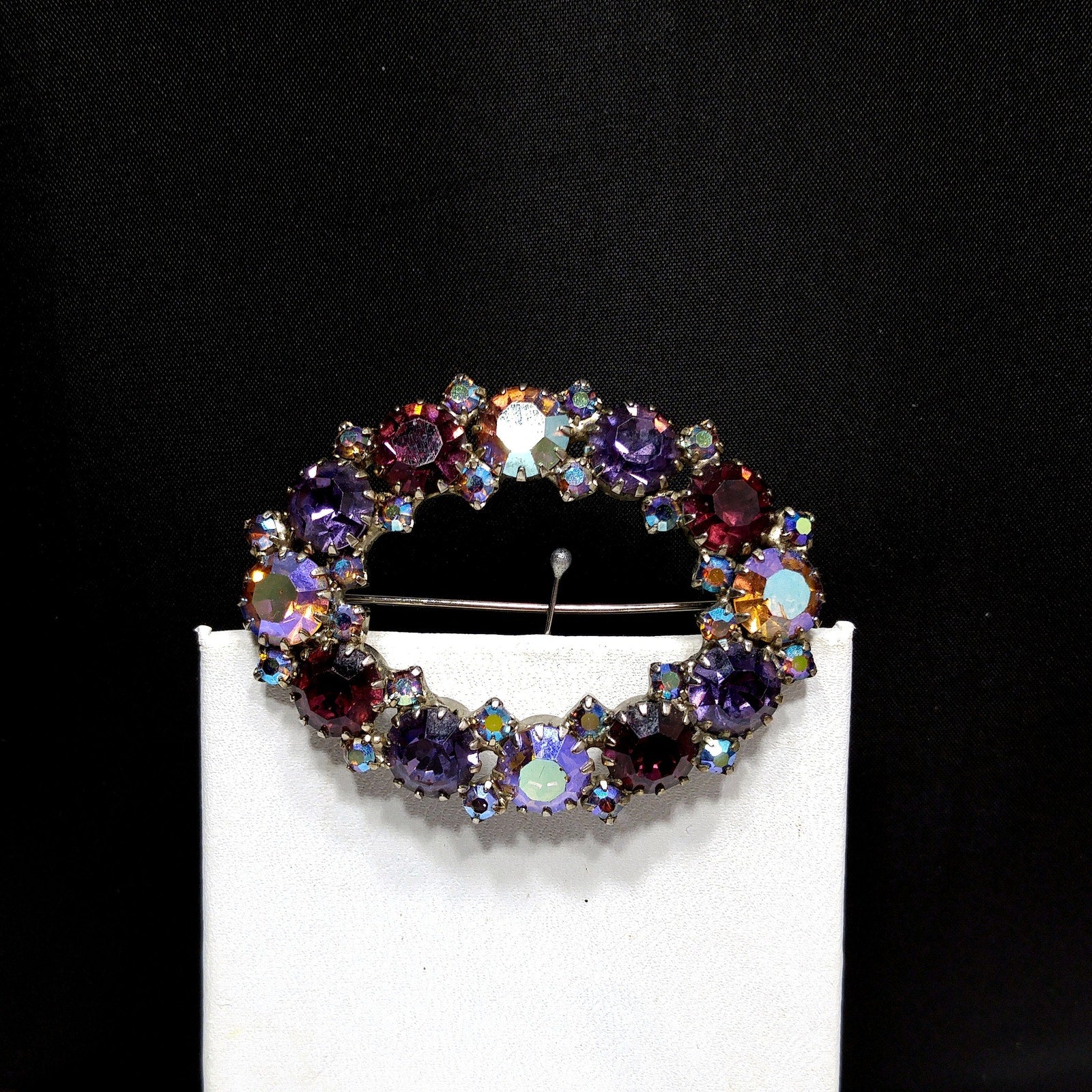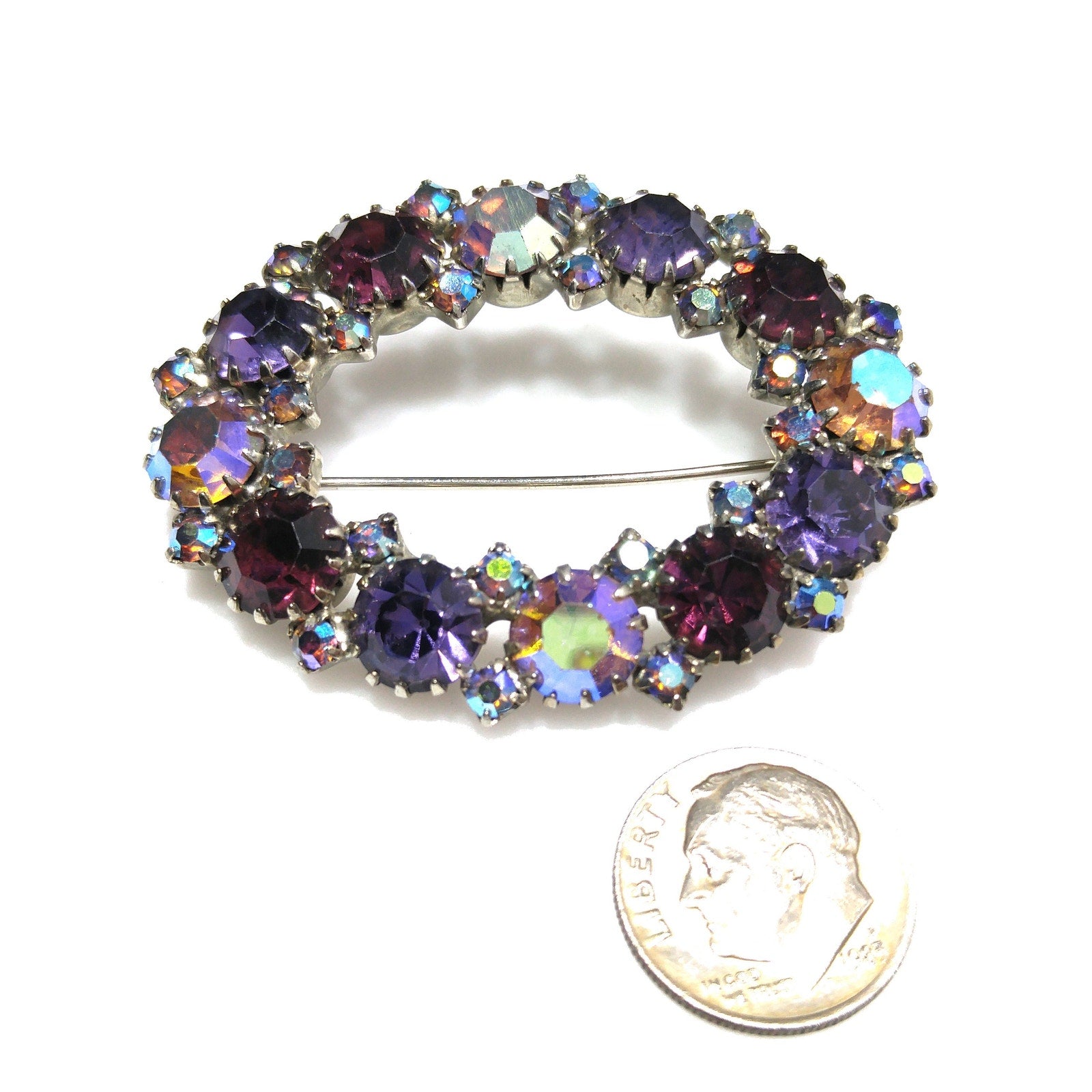*Description: This is a beautiful oval purple aurora borealis lavender crystal rhinestone brooch on a rhodium plated backing. This brooch is not signed but probably another piece in the set was signed as this is designer beautiful. The rhinestones are dog-toothed prong set. The pin is a little bent from pushing it through thick cloth. Gorgeous brooch. This would be a great addition to your vintage jewelry collection or make a great vintage gift!