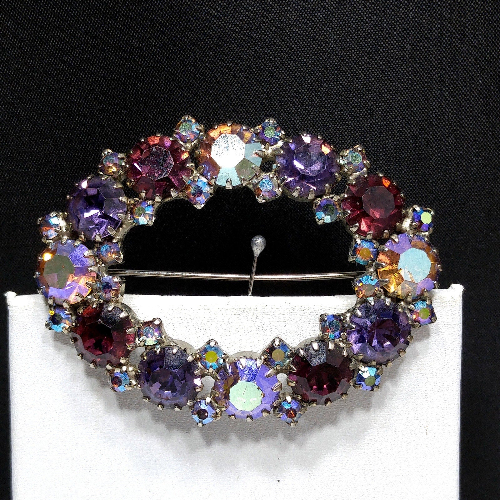 Oval Purple Aurora Borealis Lavender Rhinestone Brooch, Dog-toothed Prong Set, 1960s Vintage Jewelry