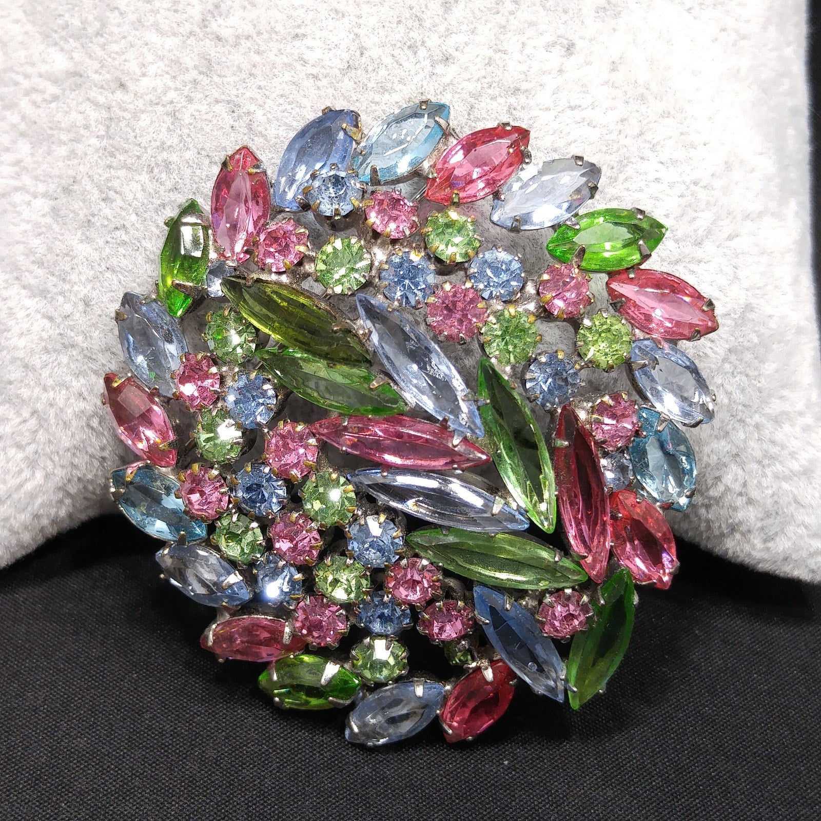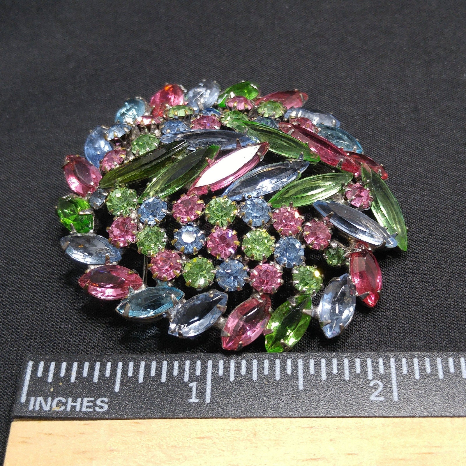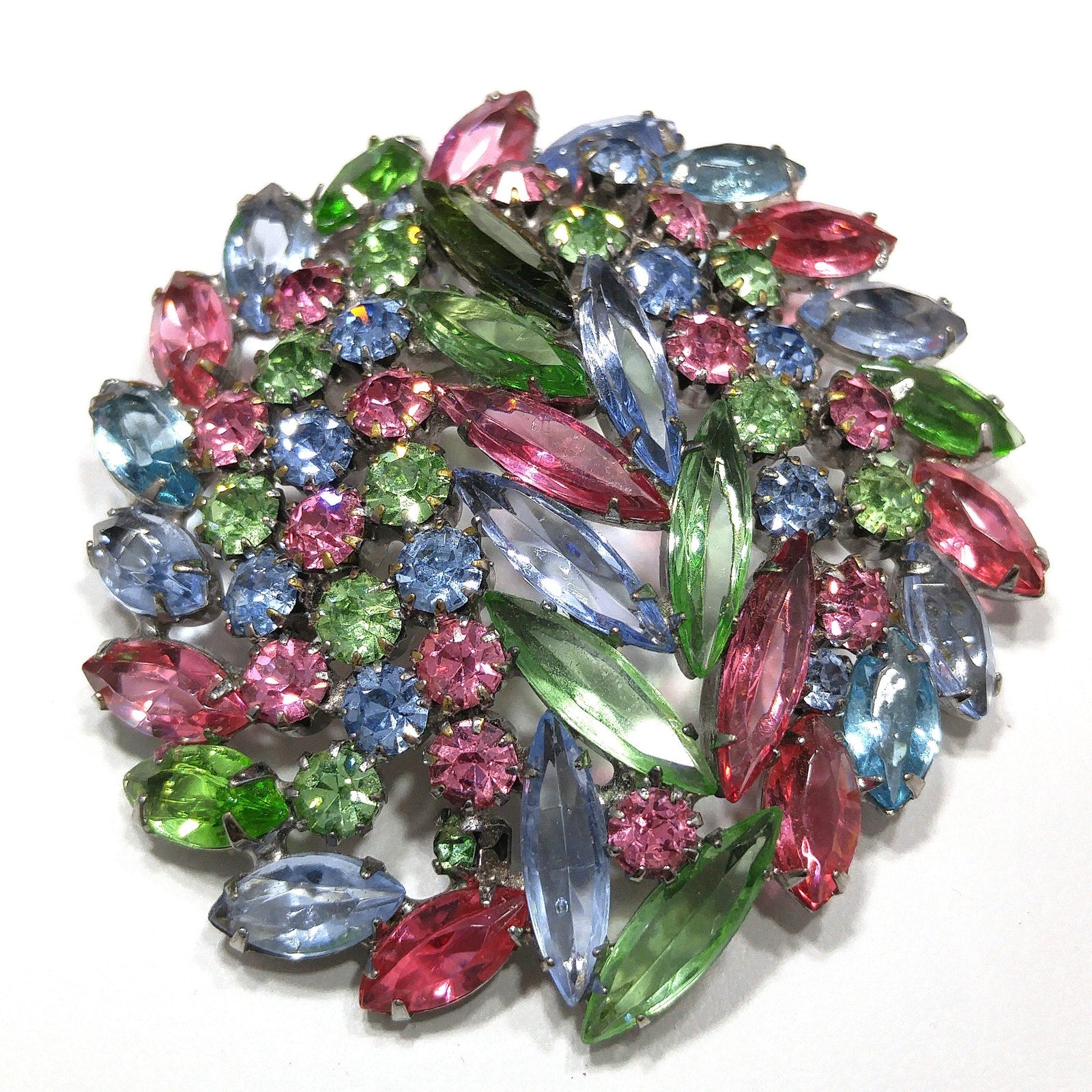*Description: This is a beautiful crystal brooch with rhinestones in pastel colors: blue, green, and pink, on a rhodium plated backing from the 1960s. The rhinestones are Austrian or Czech and many are open back to let the light shine through. The brooch is slightly raised toward the center and has a floral design. This would be a great addition to your vintage jewelry collection or make a great vintage gift!