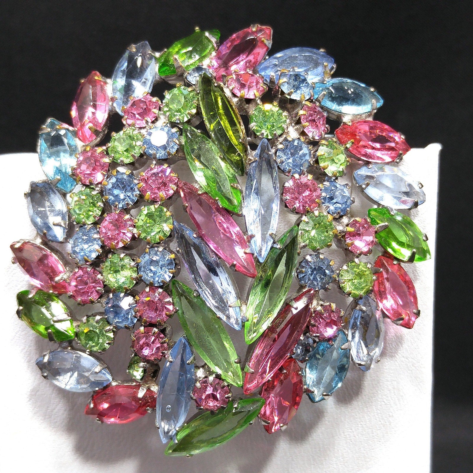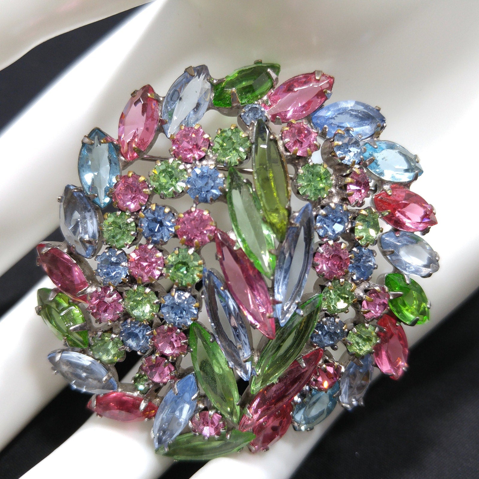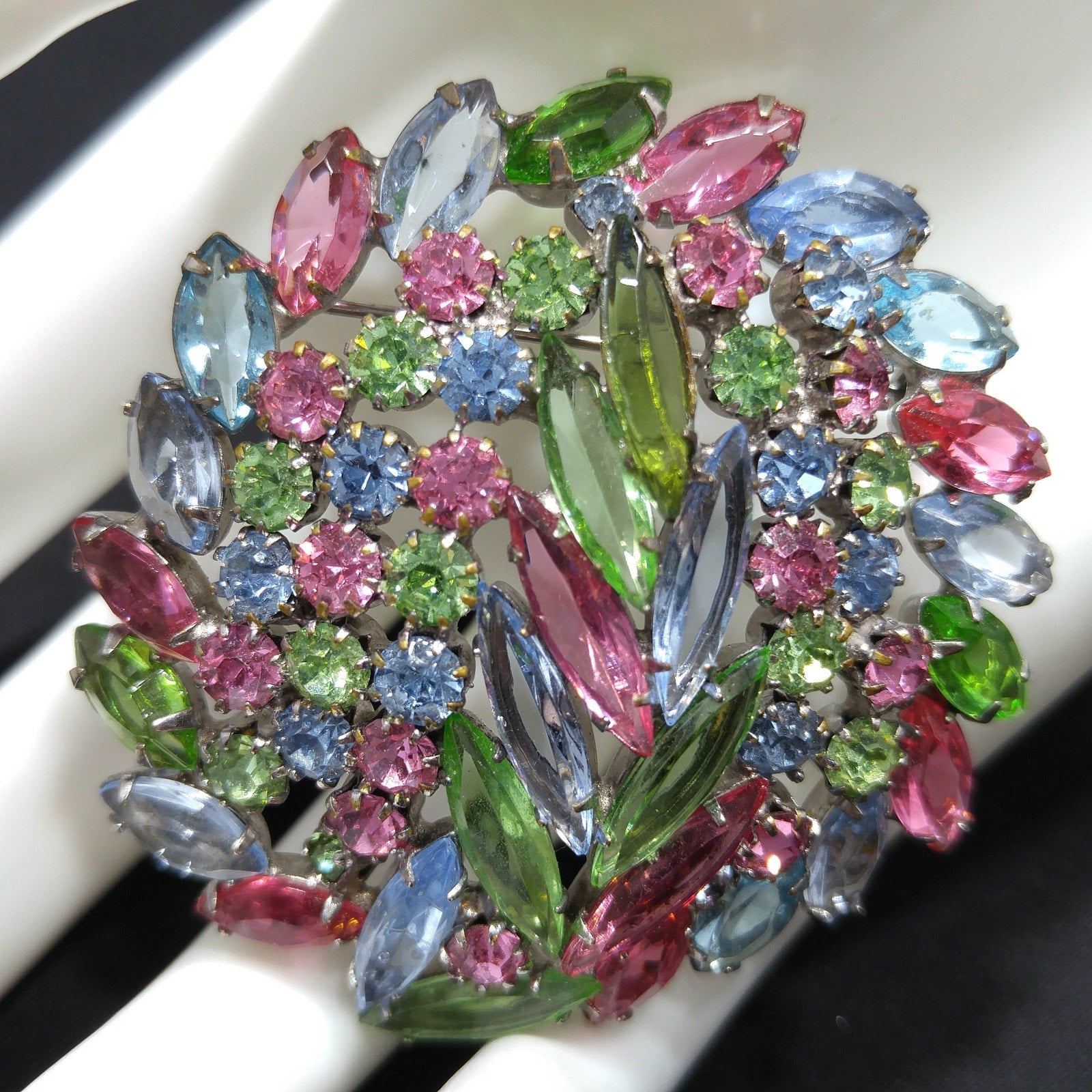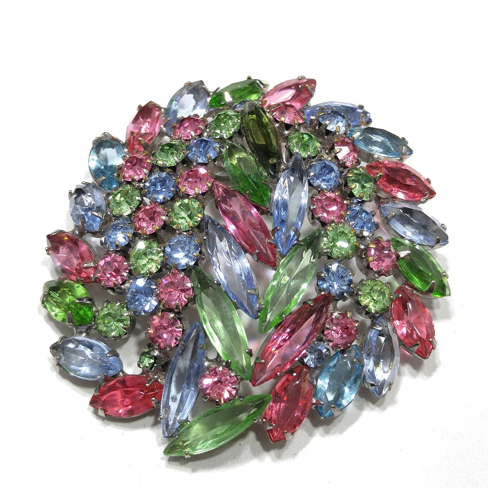 *Description: This is a beautiful crystal brooch with rhinestones in pastel colors: blue, green, and pink, on a rhodium plated backing from the 1960s. The rhinestones are Austrian or Czech and many are open back to let the light shine through. The brooch is slightly raised toward the center and has a floral design. This would be a great addition to your vintage jewelry collection or make a great vintage gift!