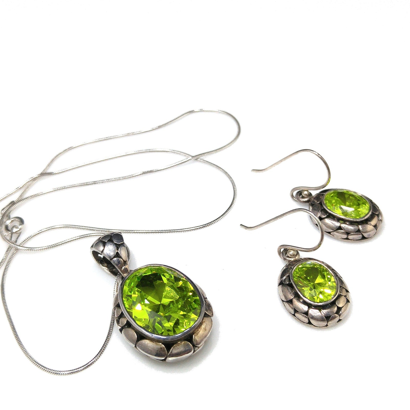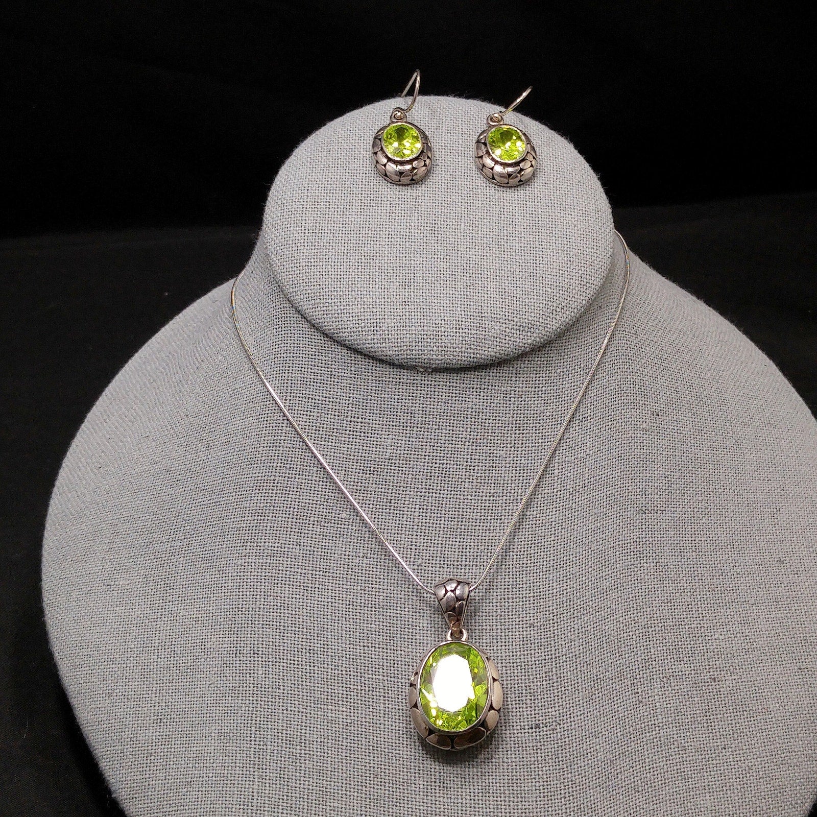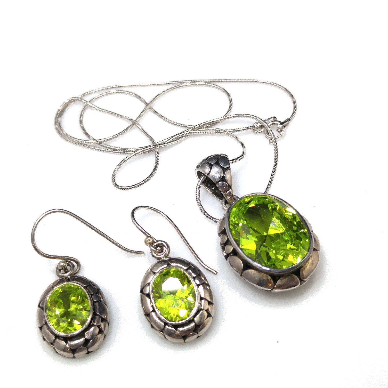 *Description: This is a beautiful peridot green cubic zirconia silver pendant necklace and pierced earrings set from the 1990s. The small snake chain holds a beautiful pendant with the large bail which matches the CZ earrings. The chain is marked 925 Italy. The pendant and earrings are not marked, however, I did individually test them and they tested as silver. I also tested the gemstone which fell into the cubic zirconia range. Due to the large bail on the pendant, it could easily be worn on a larger chain for a different look. This is a gorgeous set and would be perfect for an August birthday or anyone who loves green. This would also be a great addition to your vintage jewelry collection or make a great vintage gift!