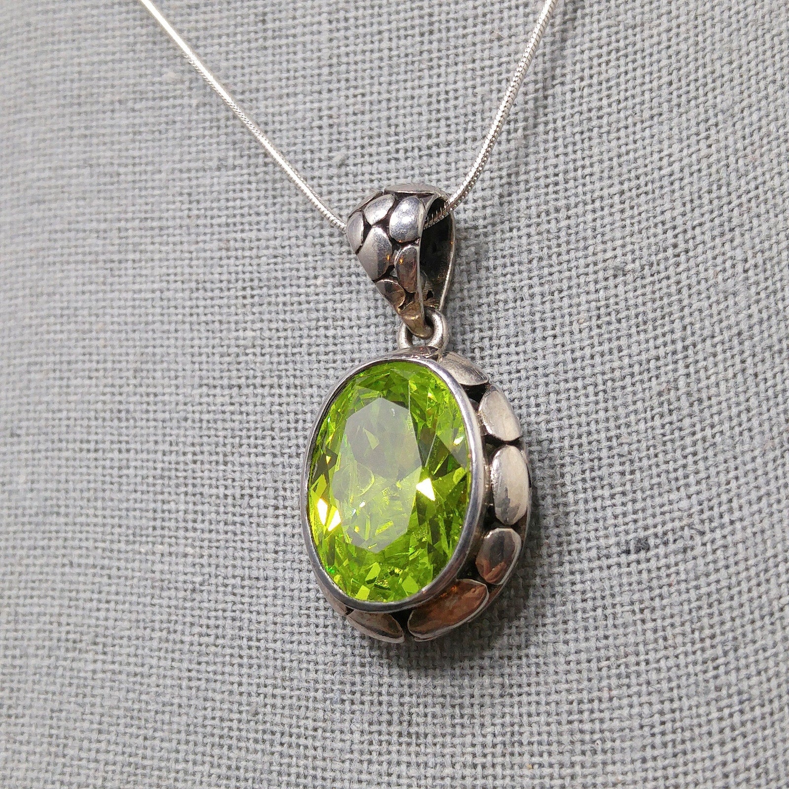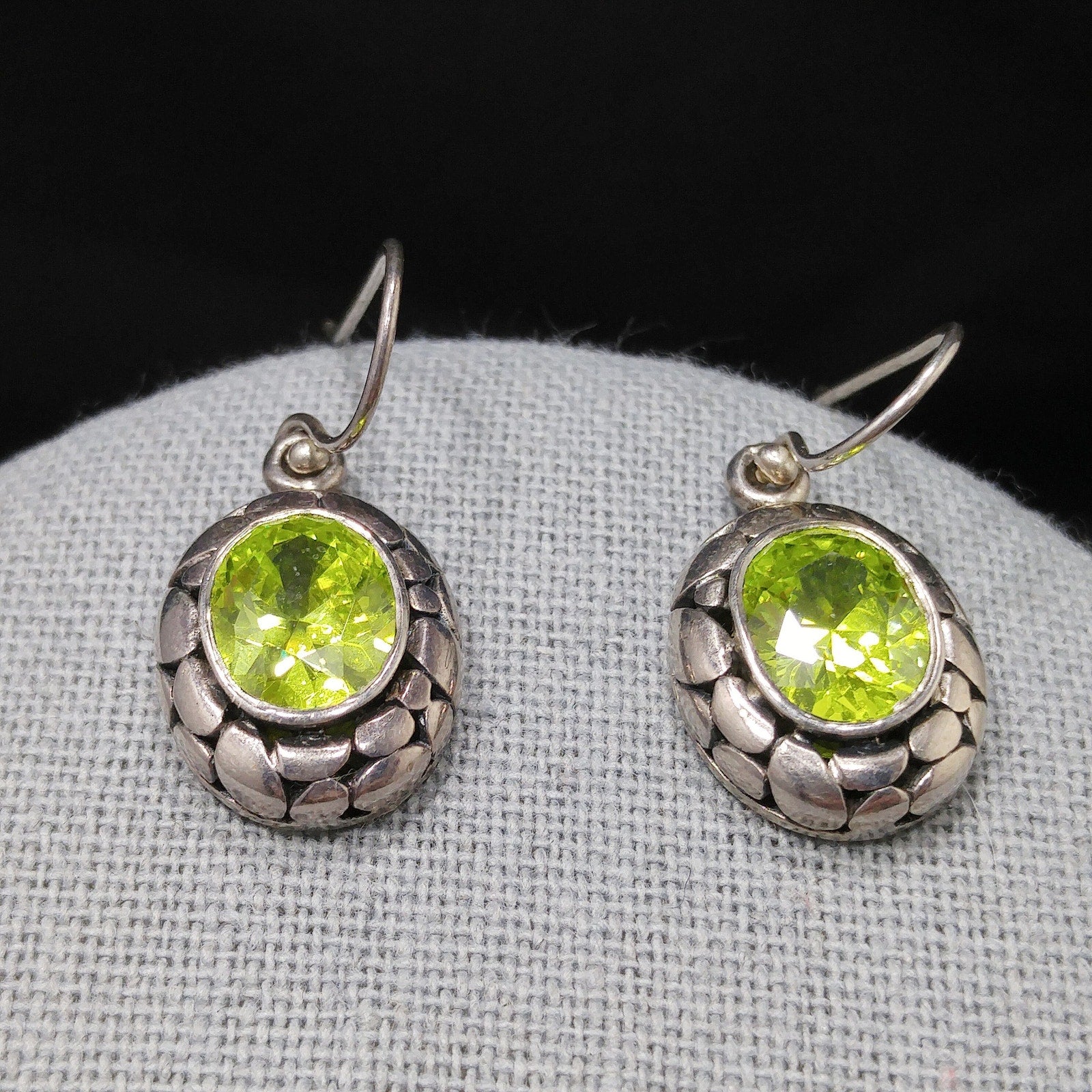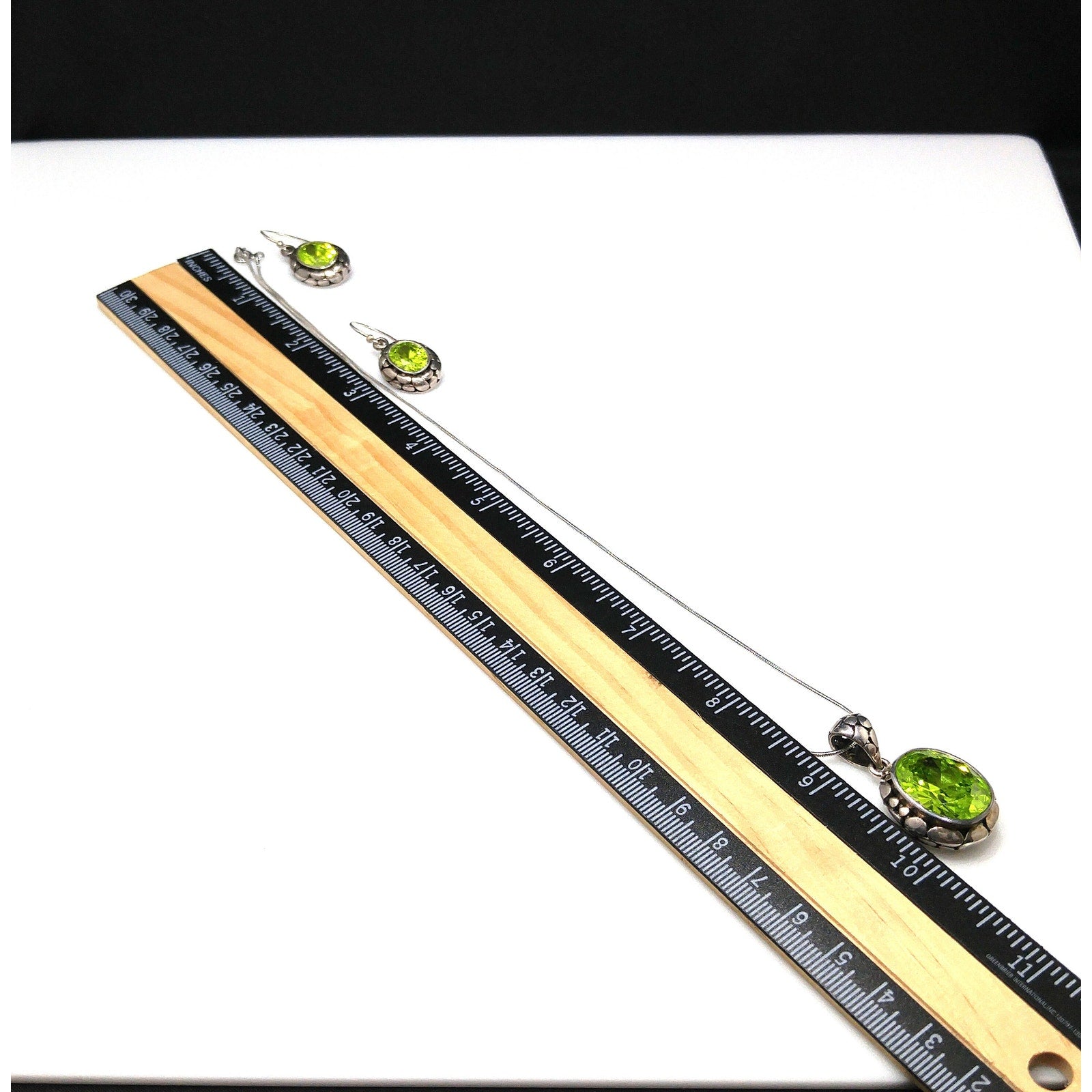 *Description: This is a beautiful peridot green cubic zirconia silver pendant necklace and pierced earrings set from the 1990s. The small snake chain holds a beautiful pendant with the large bail which matches the CZ earrings. The chain is marked 925 Italy. The pendant and earrings are not marked, however, I did individually test them and they tested as silver. I also tested the gemstone which fell into the cubic zirconia range. Due to the large bail on the pendant, it could easily be worn on a larger chain for a different look. This is a gorgeous set and would be perfect for an August birthday or anyone who loves green. This would also be a great addition to your vintage jewelry collection or make a great vintage gift!