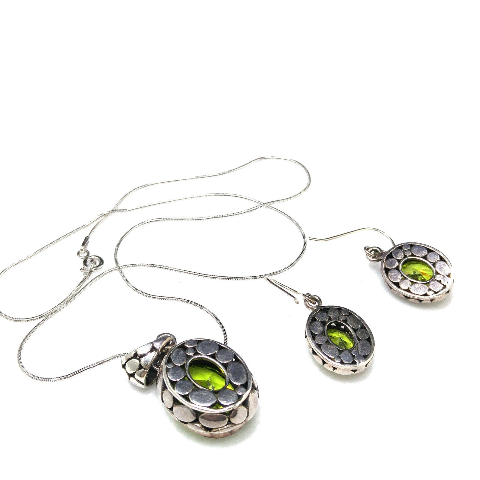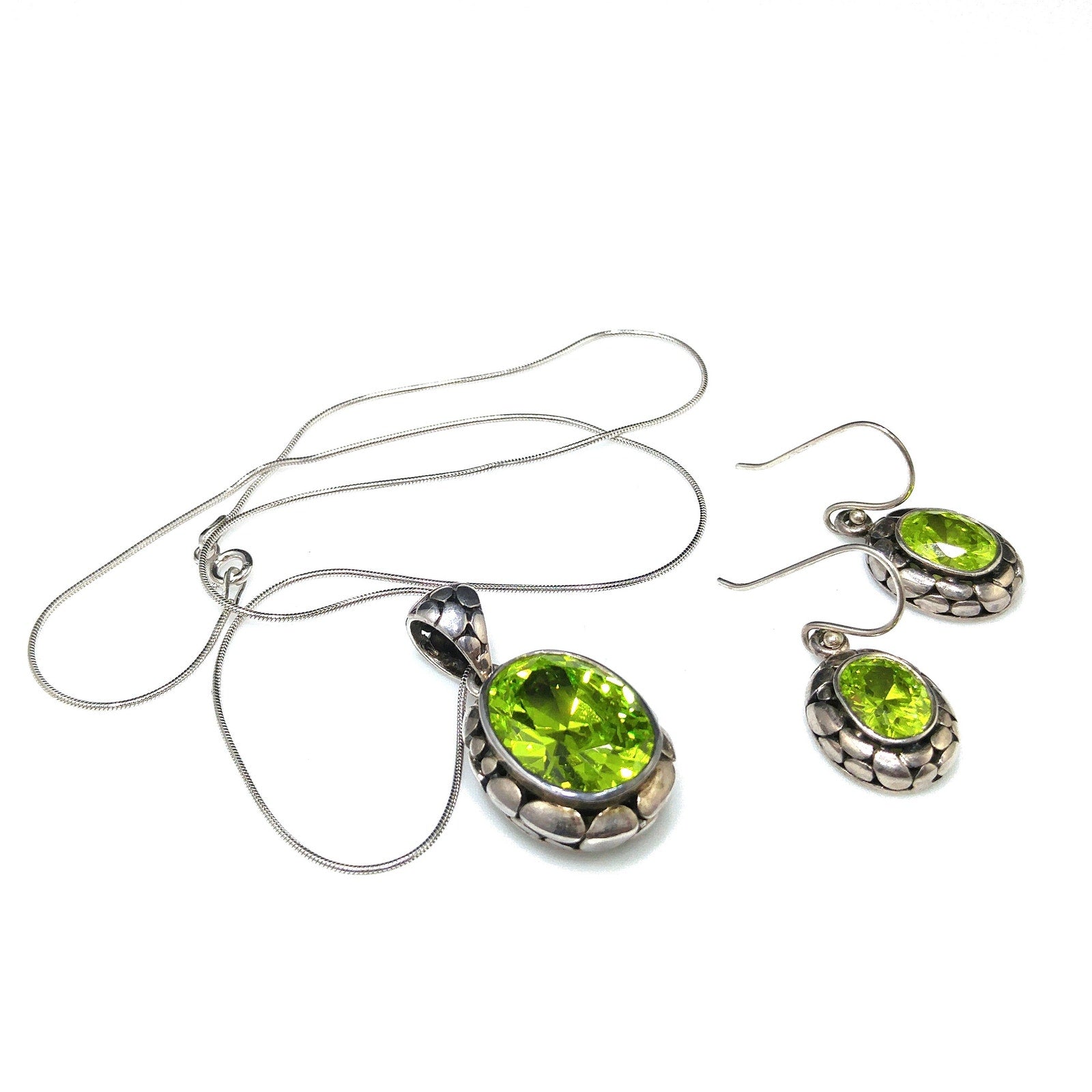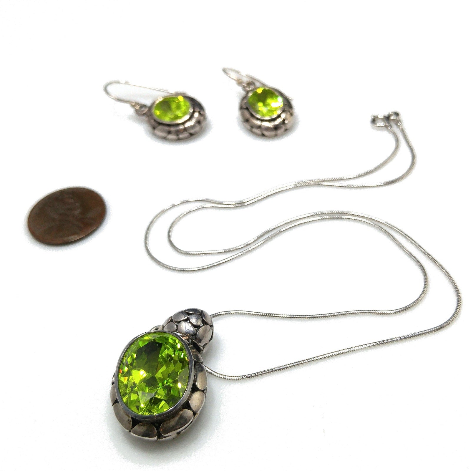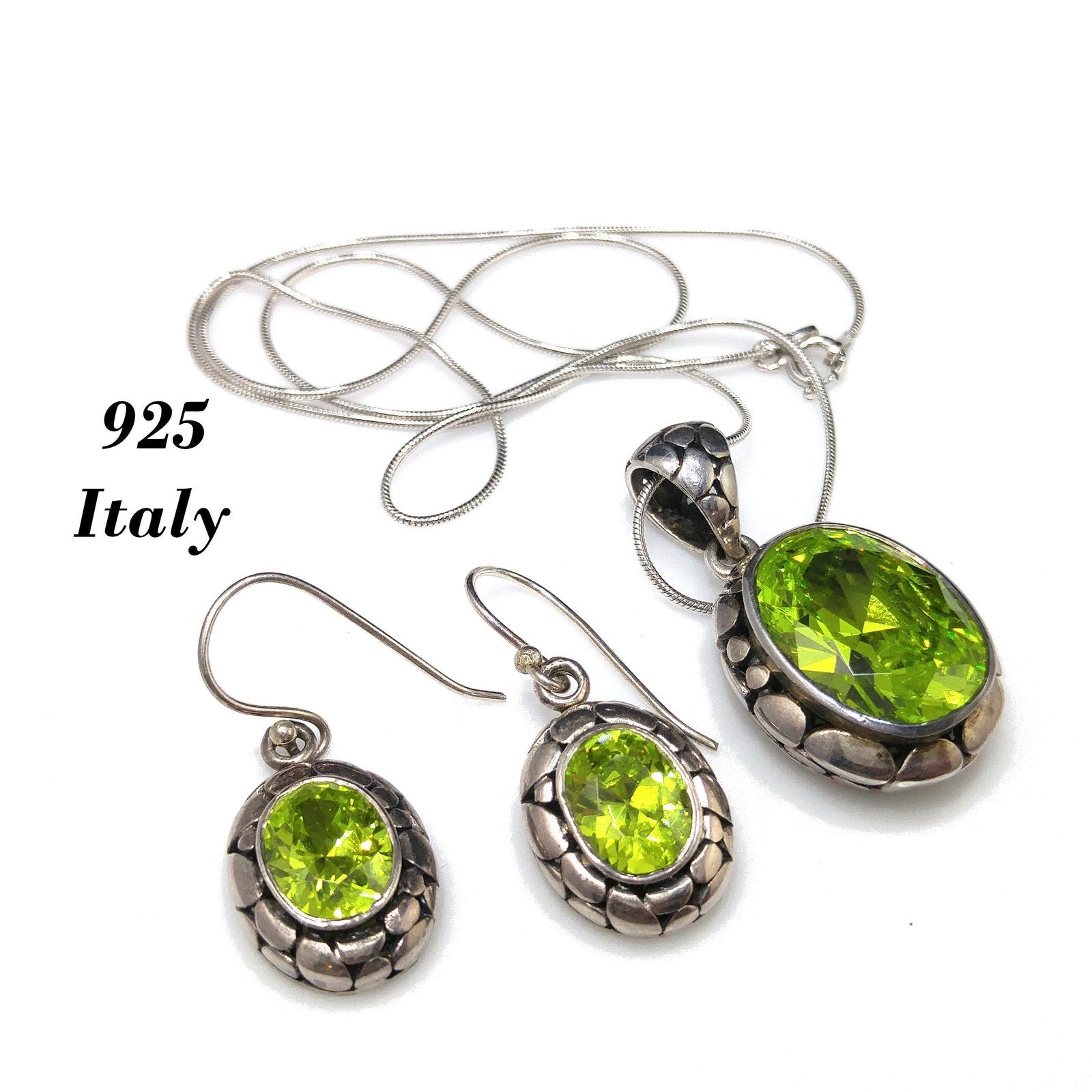 Peridot CZ Silver Necklace & Earrings Set, Italy Snake Chain, 1990s Vintage Jewelry