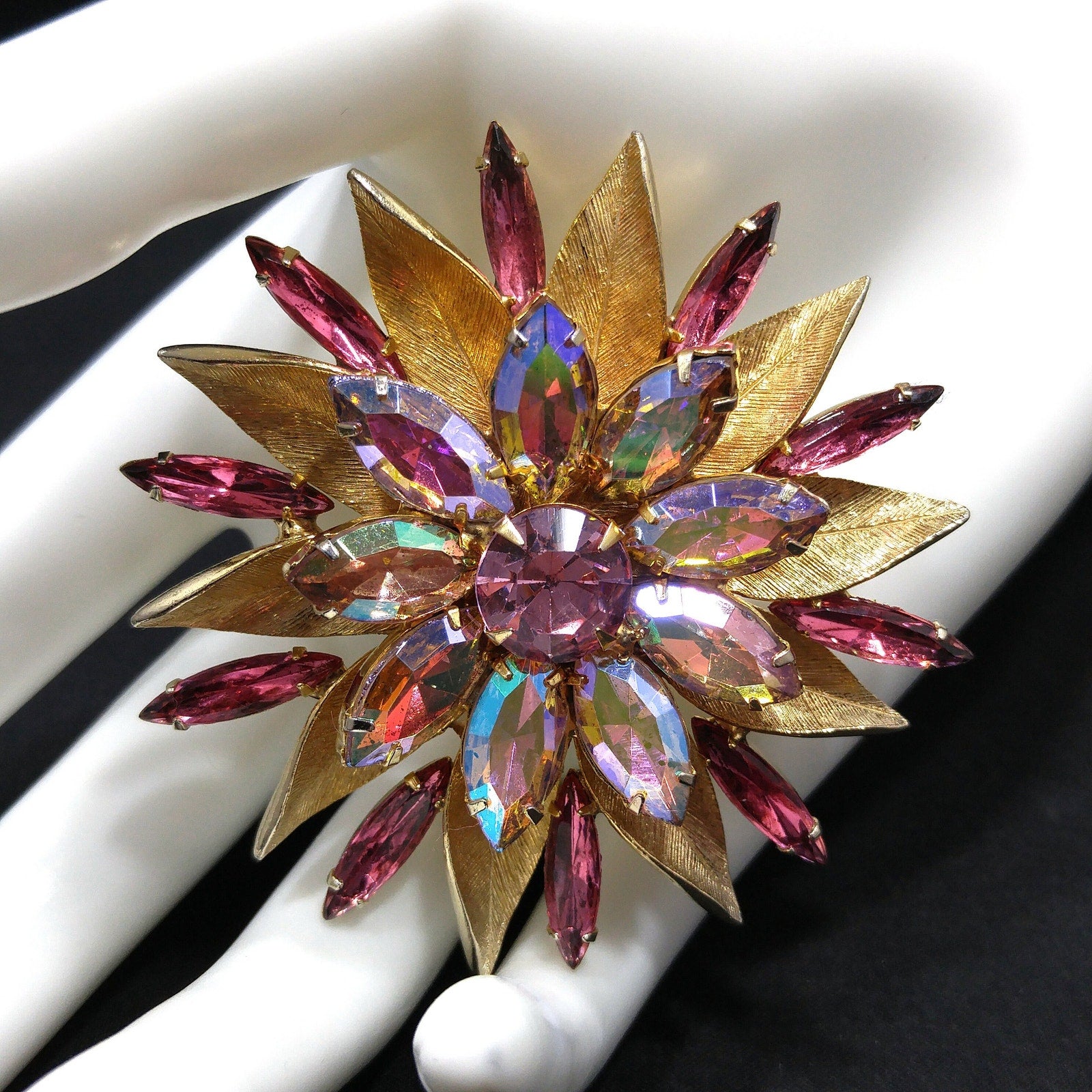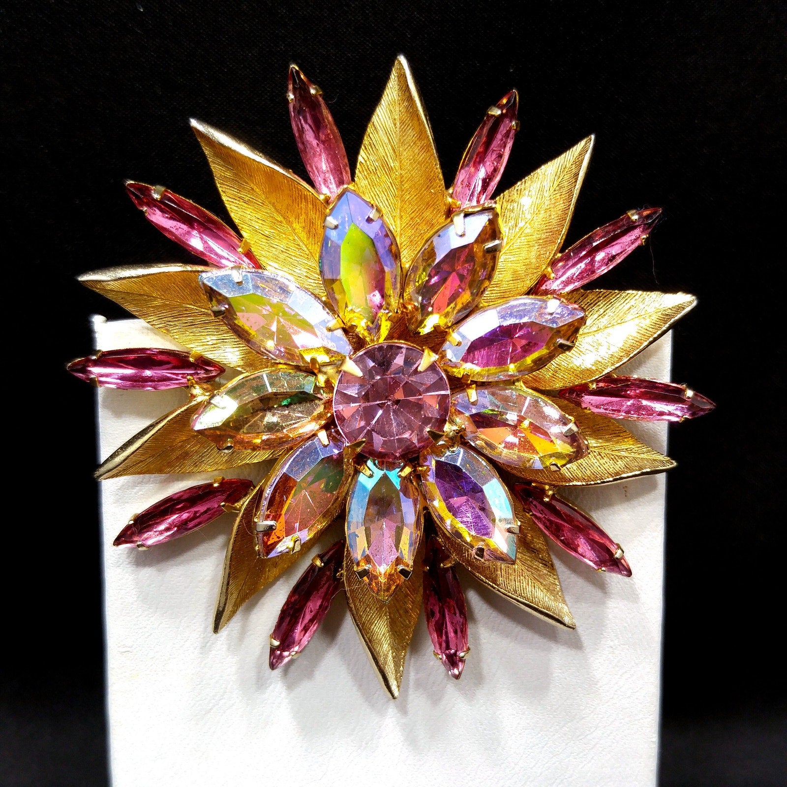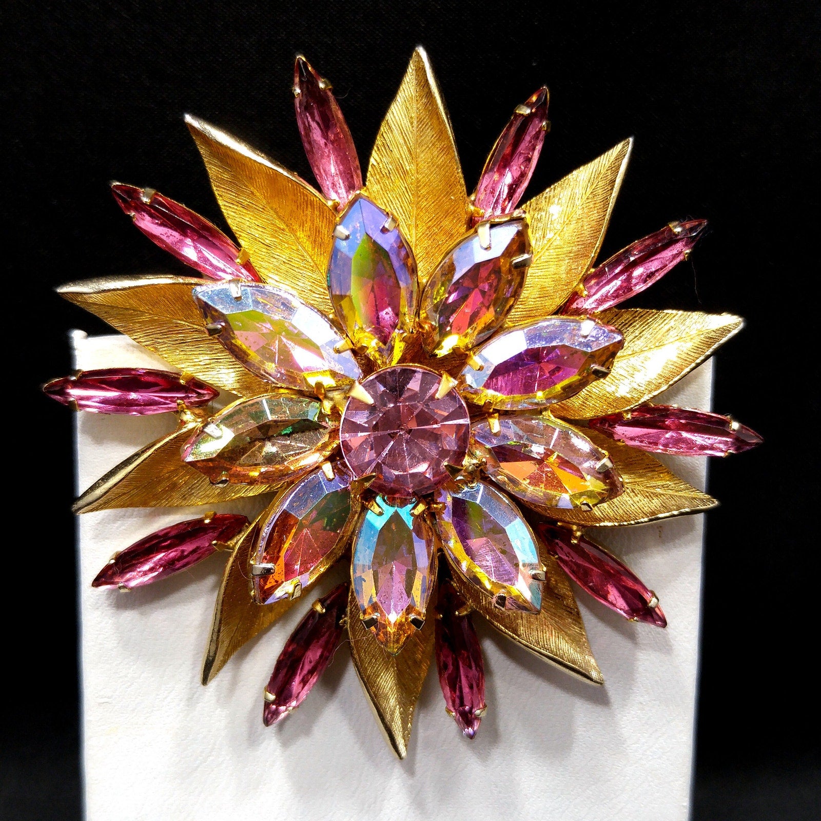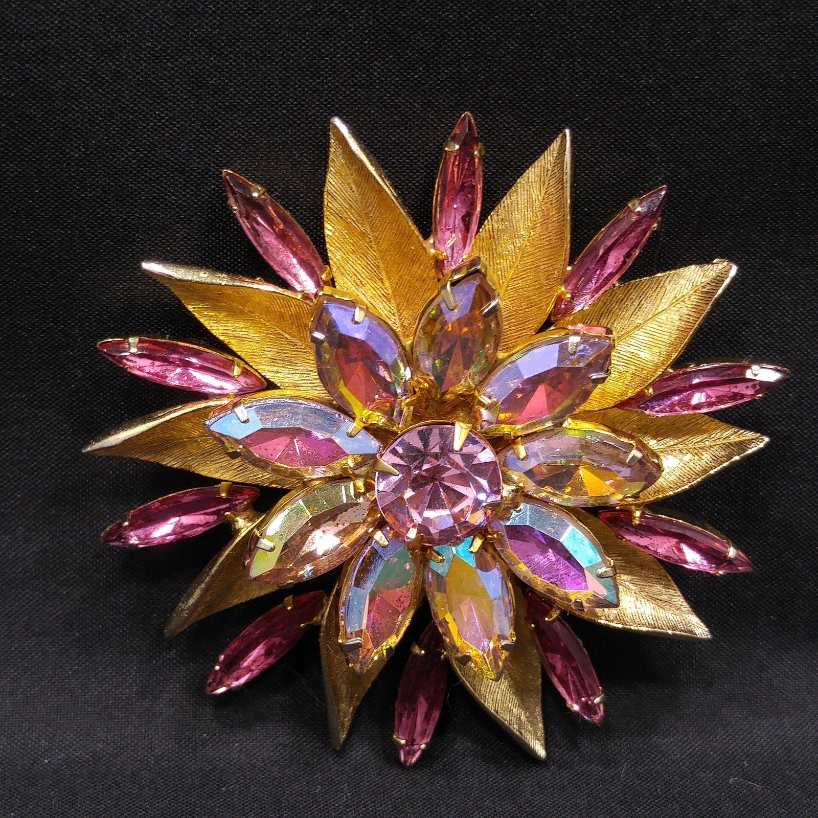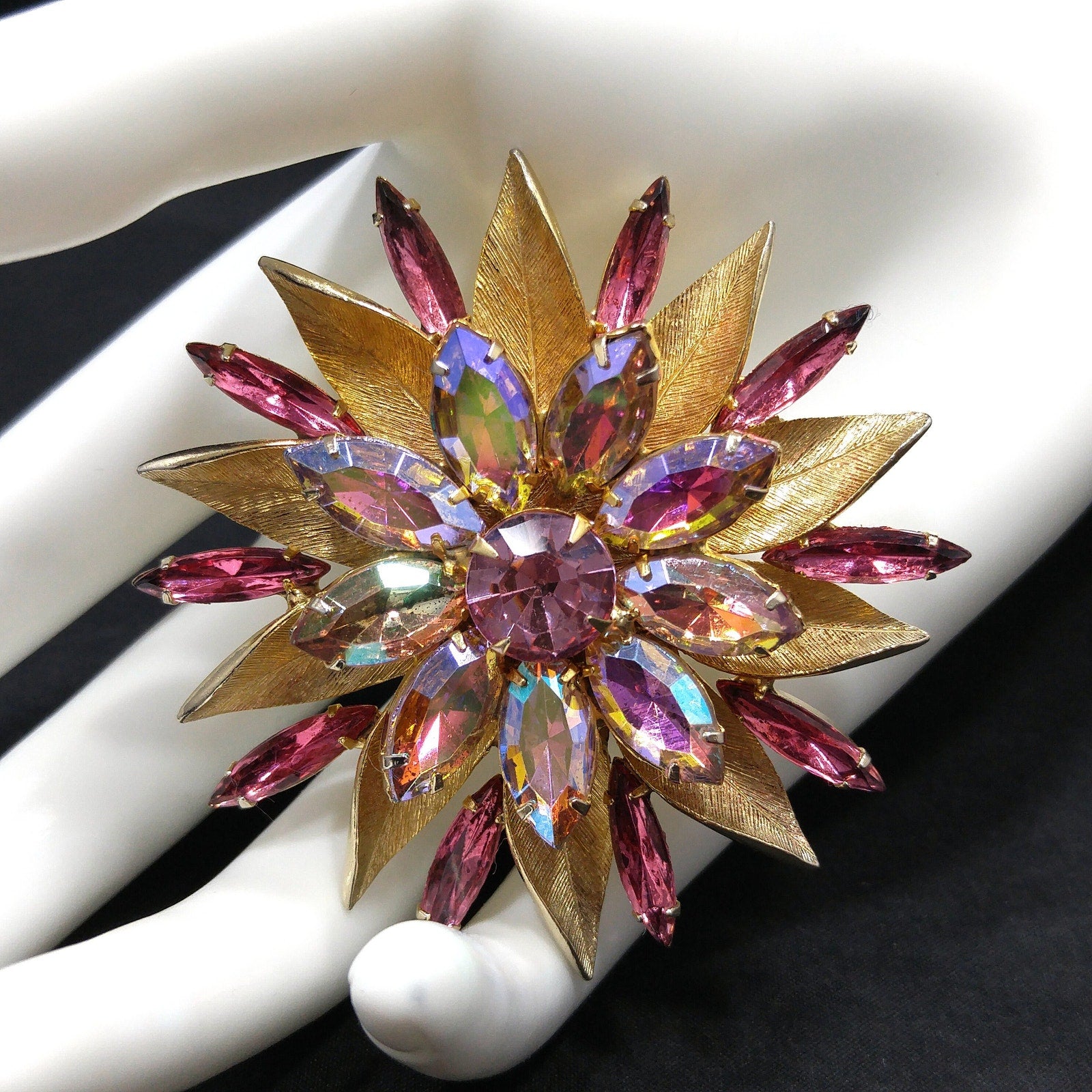 *Description: This pink rhinestone two layered flower brooch with light, dark, and aurora borealis pink rhinestones on a gold plated backing from the 1960s. The brooch is full of sparkle. Each rhinestone is in place and prong set. This would be a great addition to your vintage jewelry collection or make a great vintage gift!