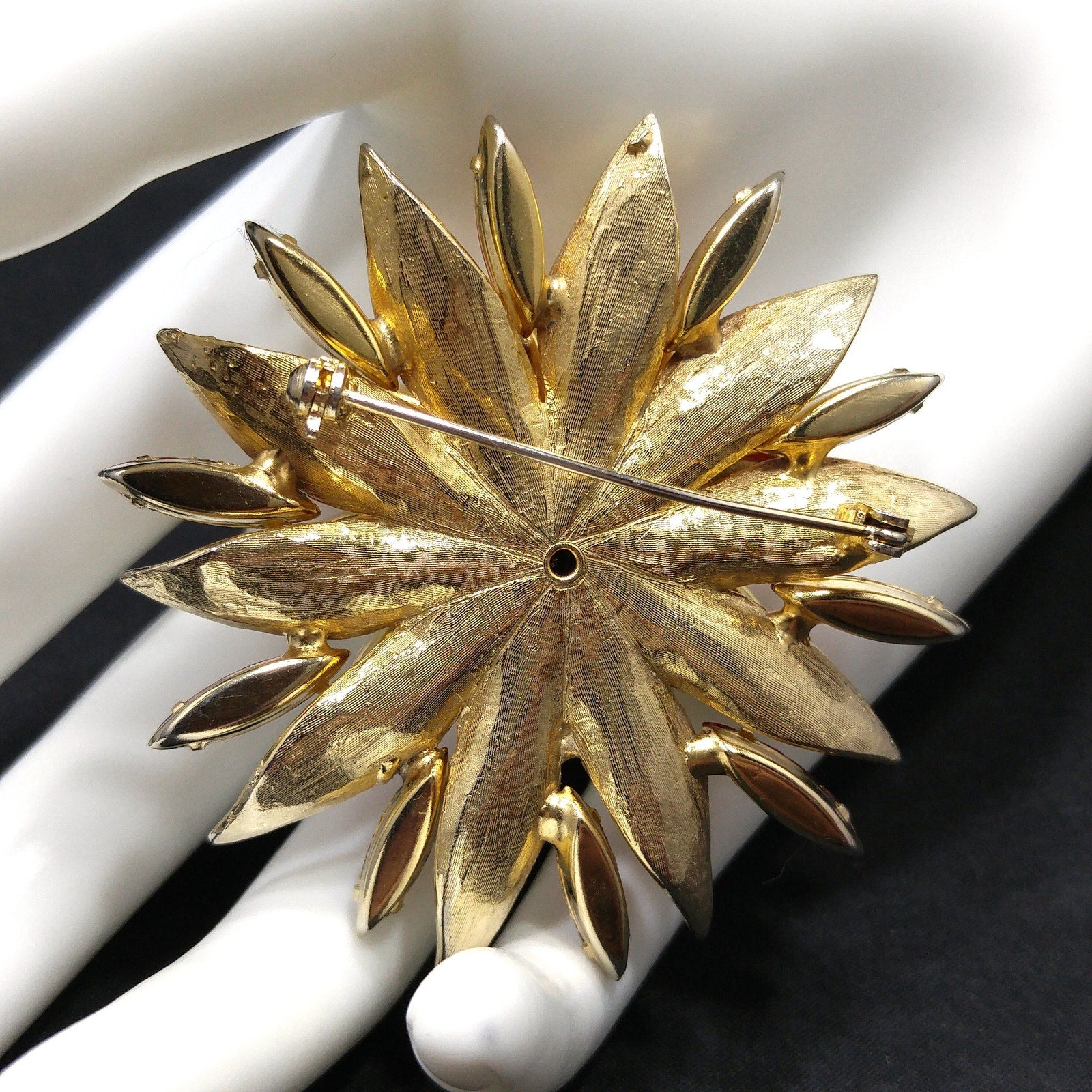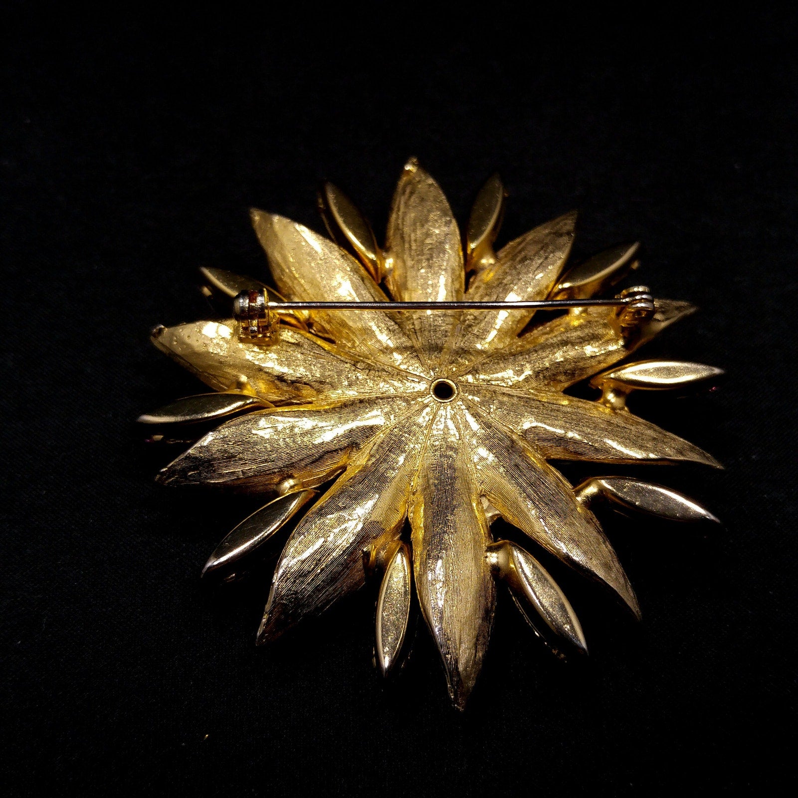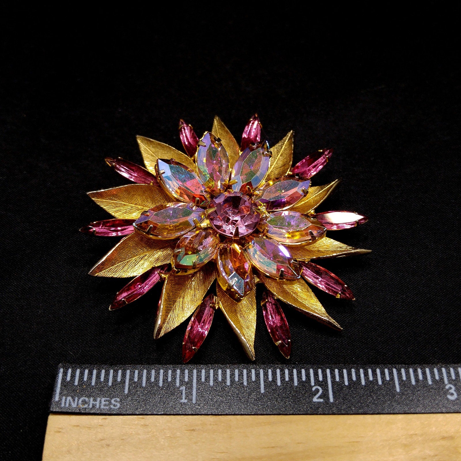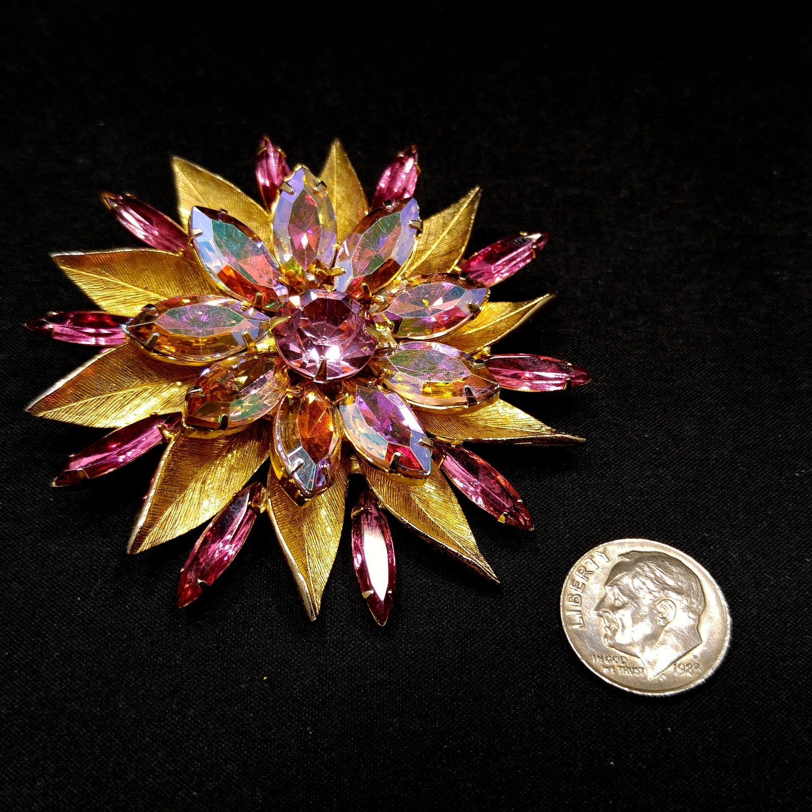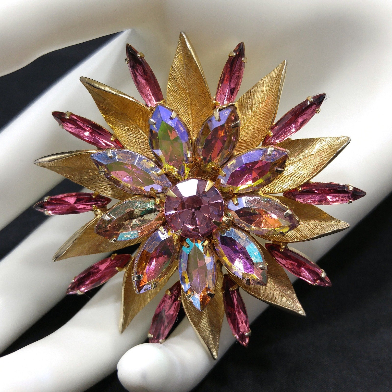 *Description: This pink rhinestone two layered flower brooch with light, dark, and aurora borealis pink rhinestones on a gold plated backing from the 1960s. The brooch is full of sparkle. Each rhinestone is in place and prong set. This would be a great addition to your vintage jewelry collection or make a great vintage gift!