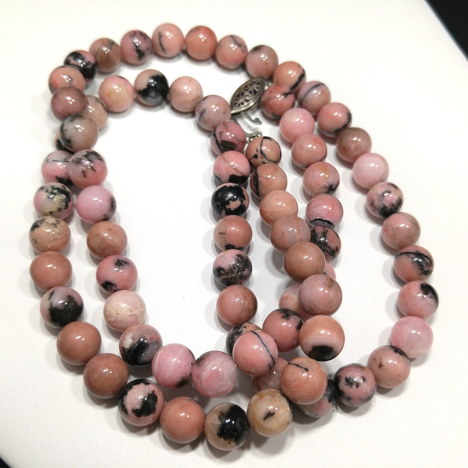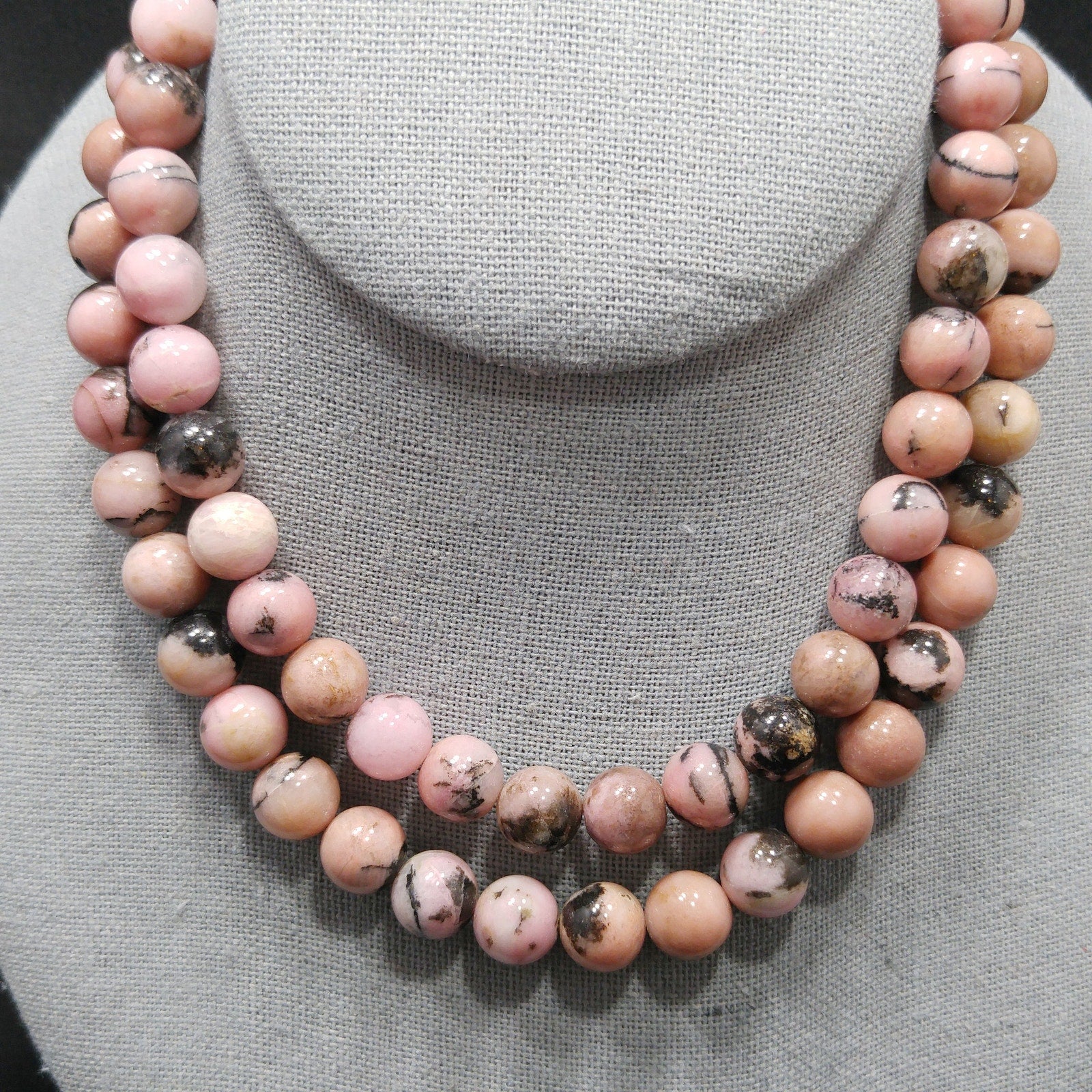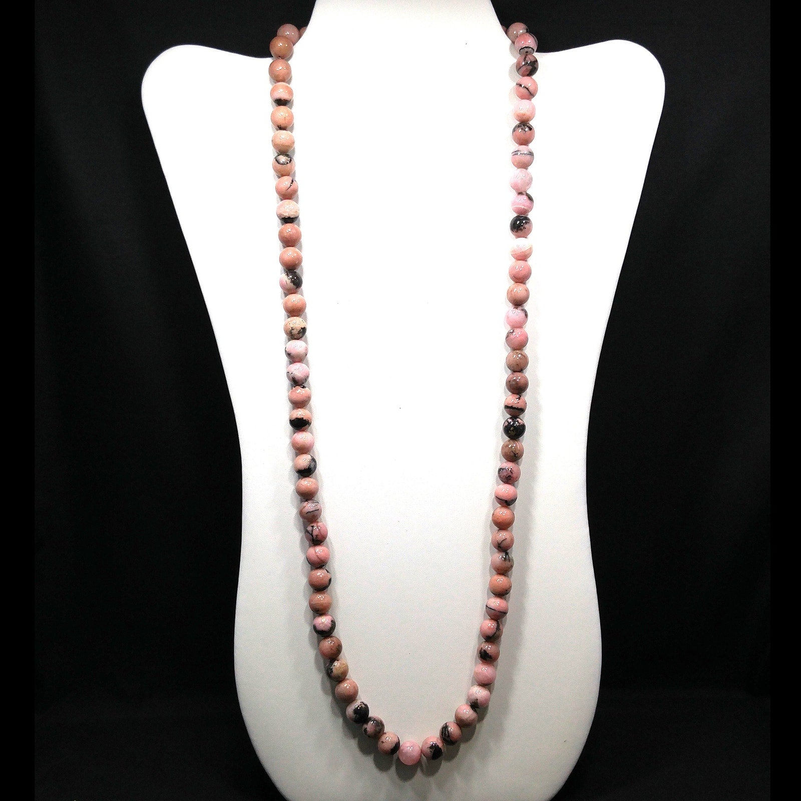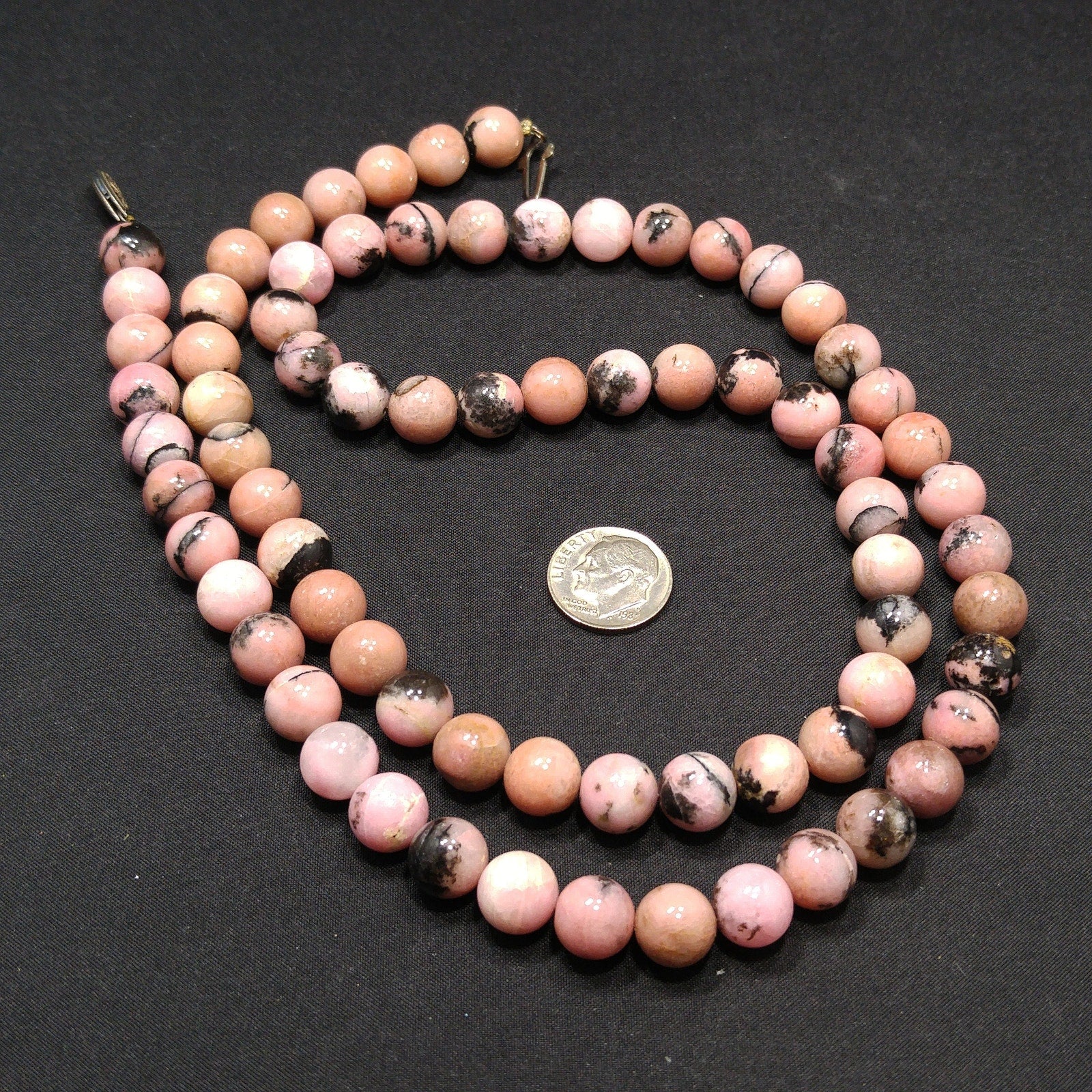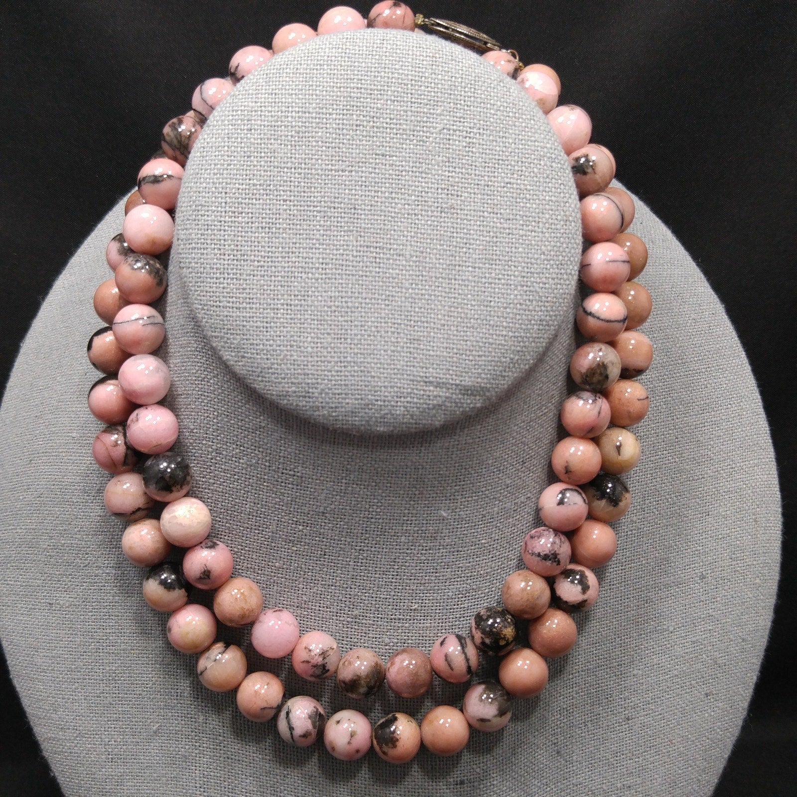 *Description: This is a beautiful pink & black gemstone beaded necklace from the 1970s. I believe the gemstone is Rhodonite. I tested it on the Presidium Gemtester and it tested at Quartz. The necklace weighs 3.9 Ounces due to the gemstone beads. It is a beautiful pink tone with splashes or spots of black. It has a clasp so that you could wrap the necklace around twice and have a two strand choker.