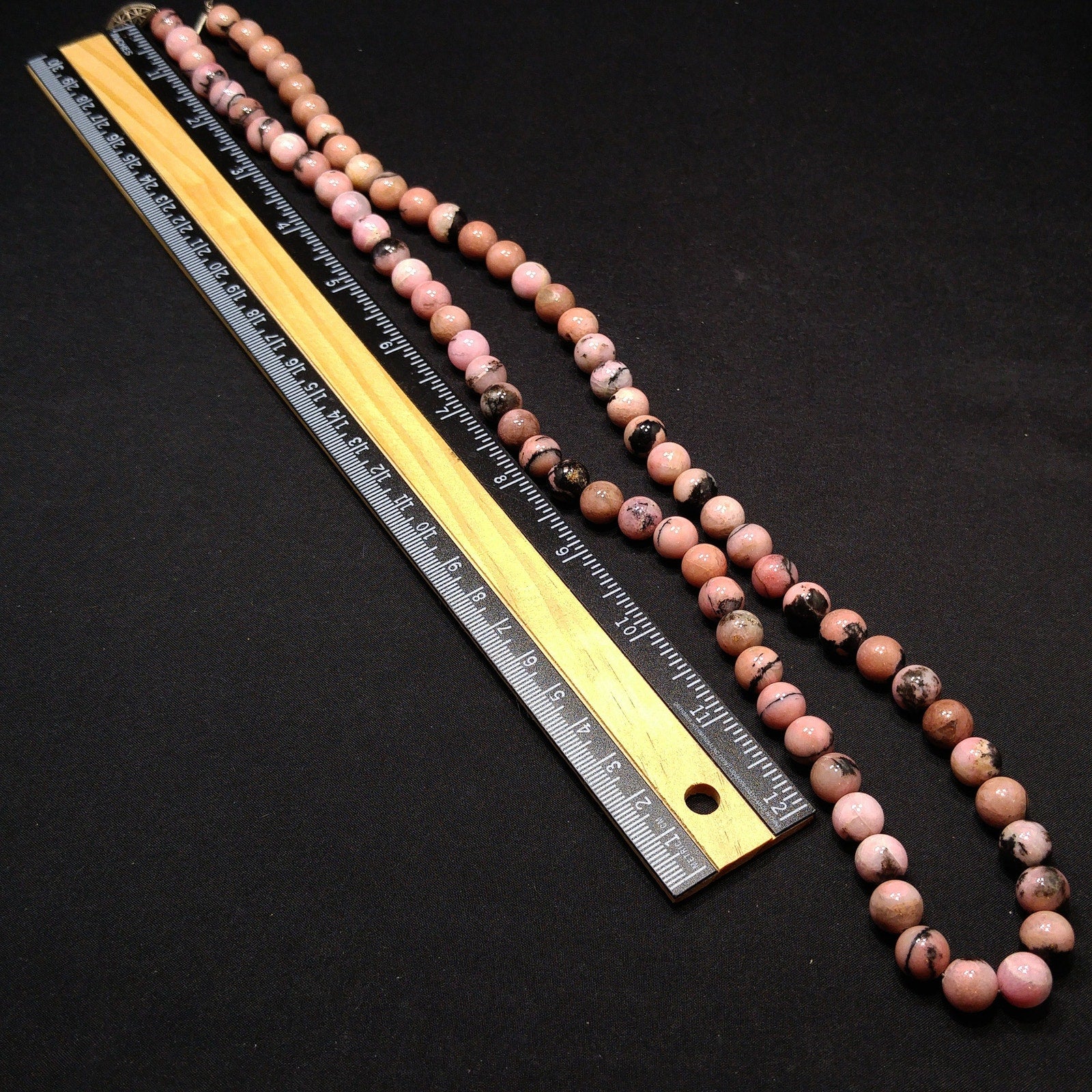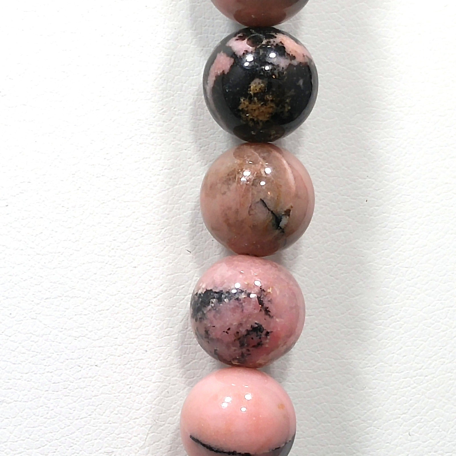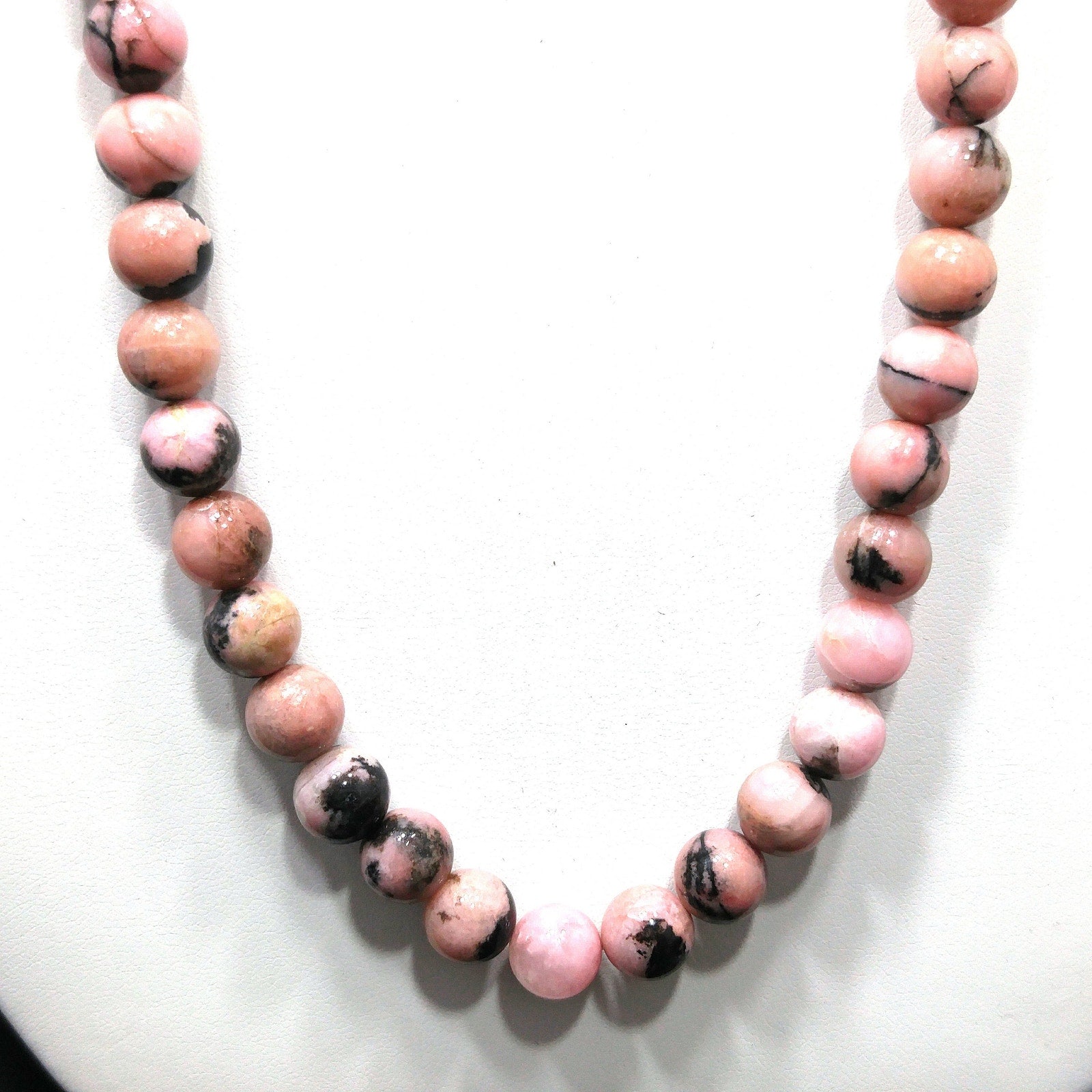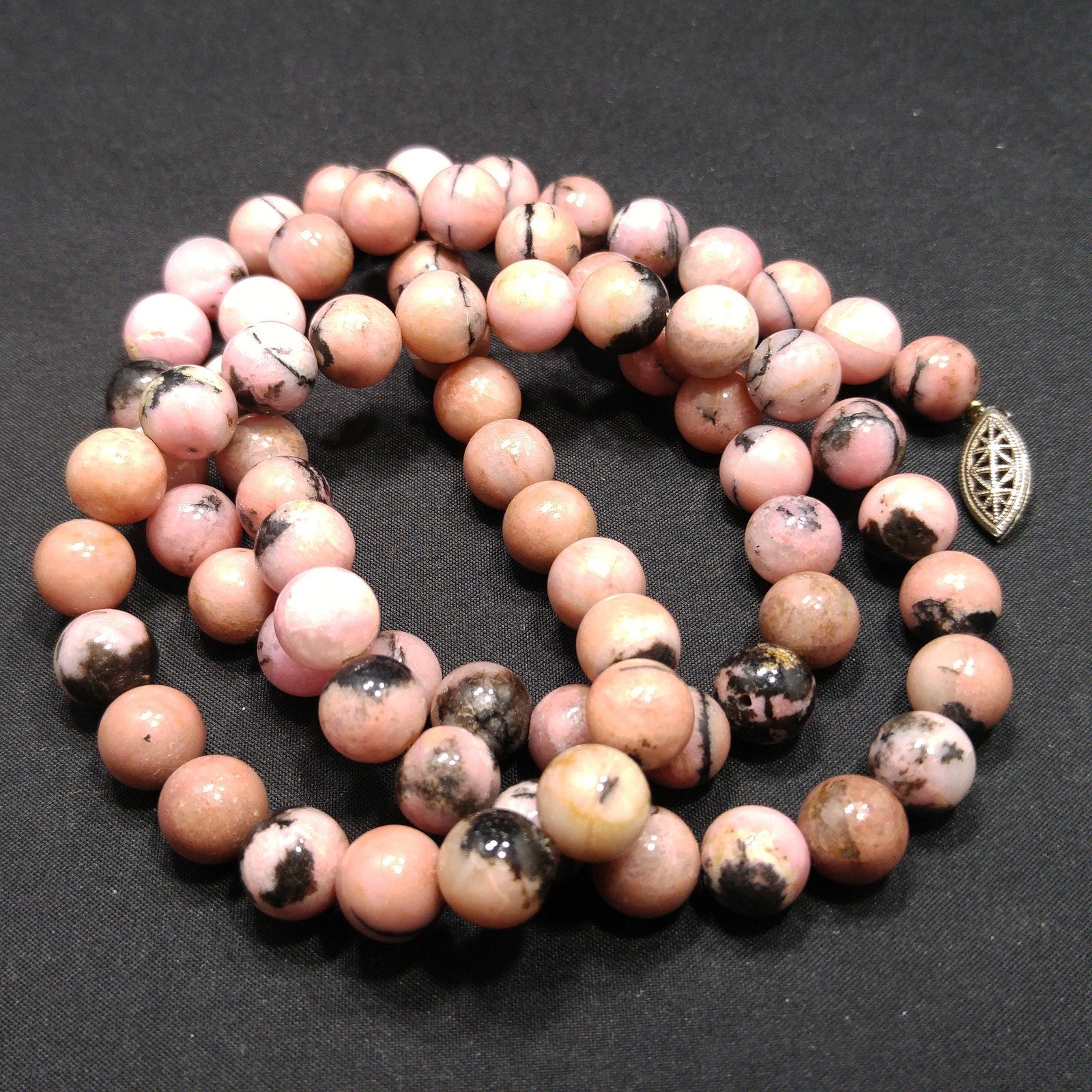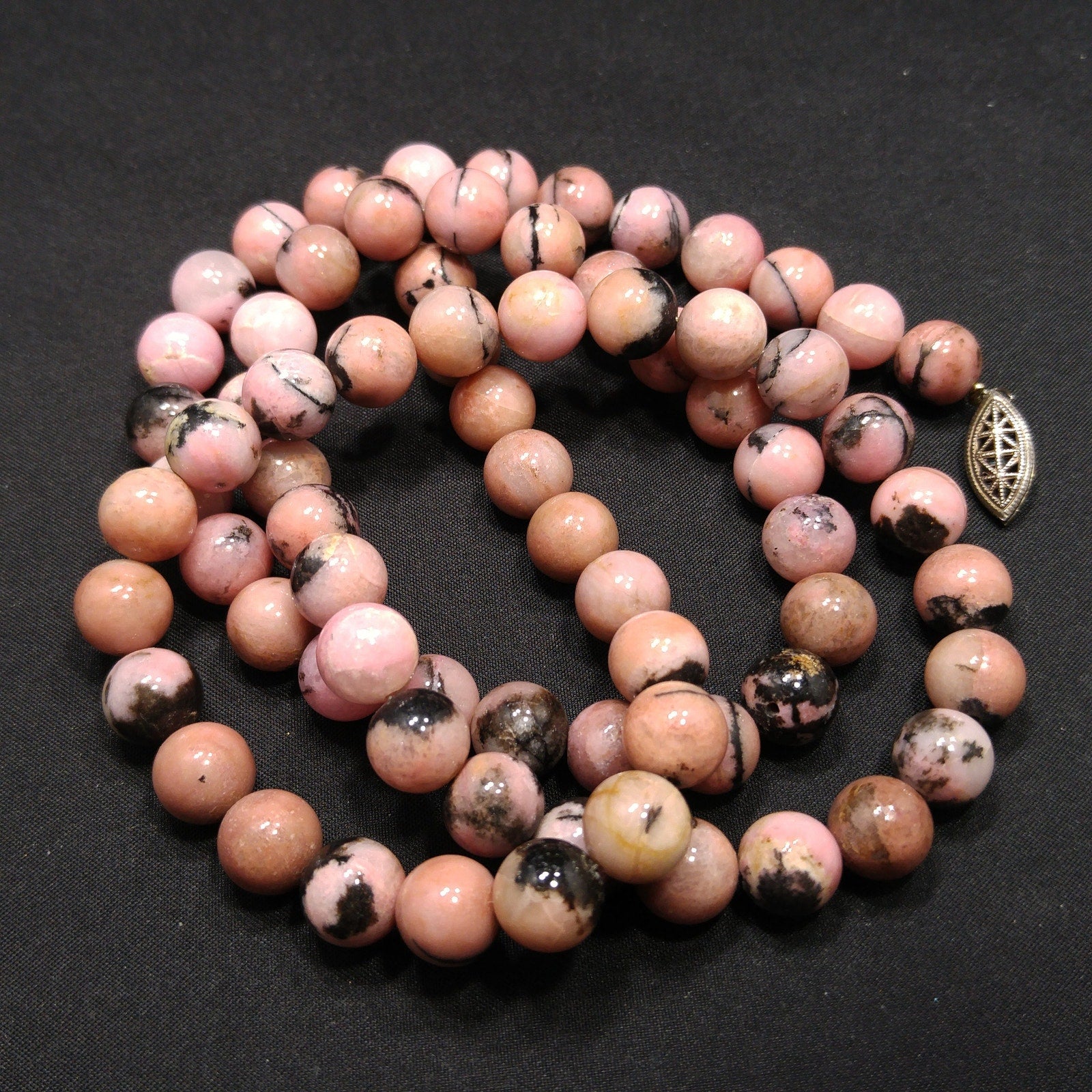 *Description: This is a beautiful pink & black gemstone beaded necklace from the 1970s. I believe the gemstone is Rhodonite. I tested it on the Presidium Gemtester and it tested at Quartz. The necklace weighs 3.9 Ounces due to the gemstone beads. It is a beautiful pink tone with splashes or spots of black. It has a clasp so that you could wrap the necklace around twice and have a two strand choker.