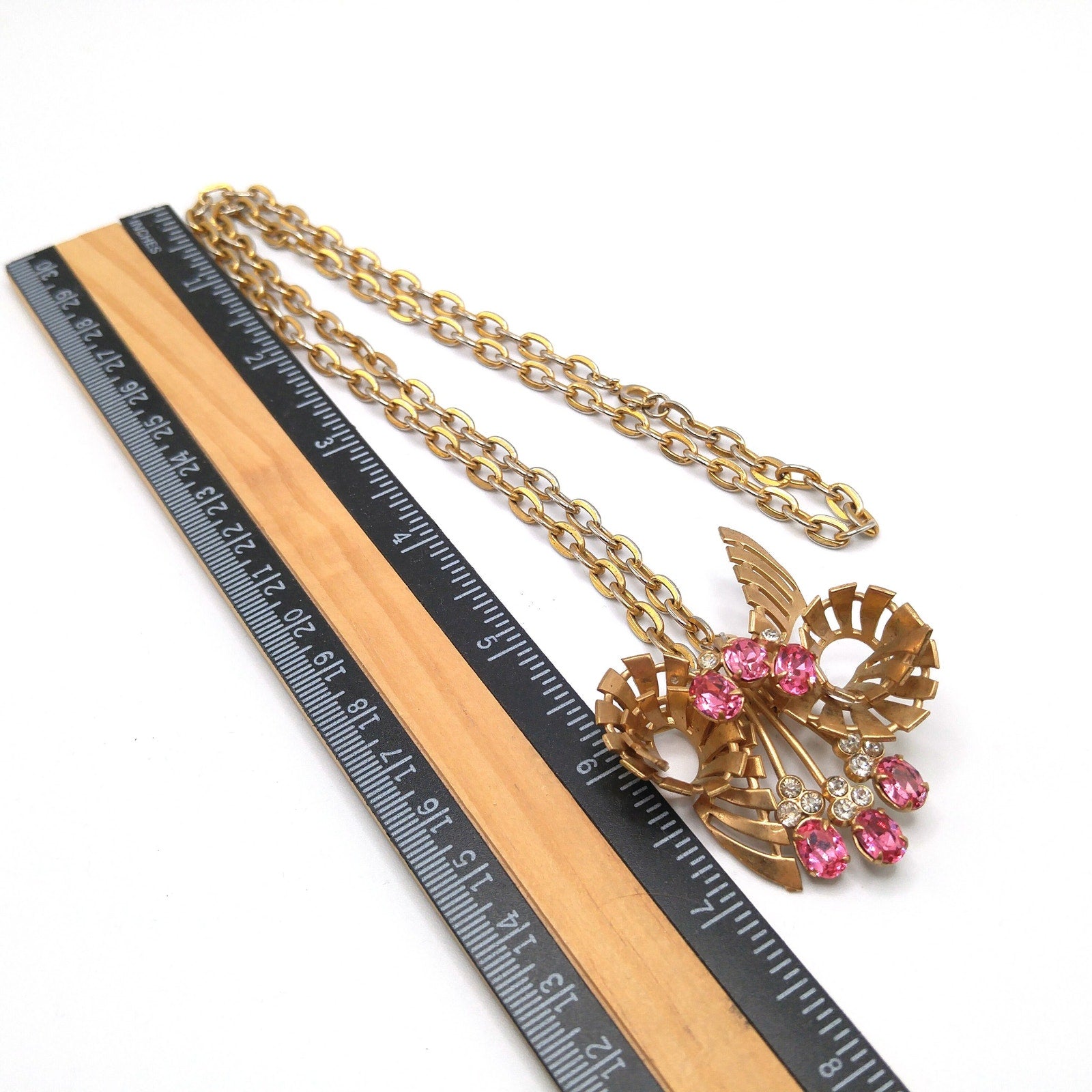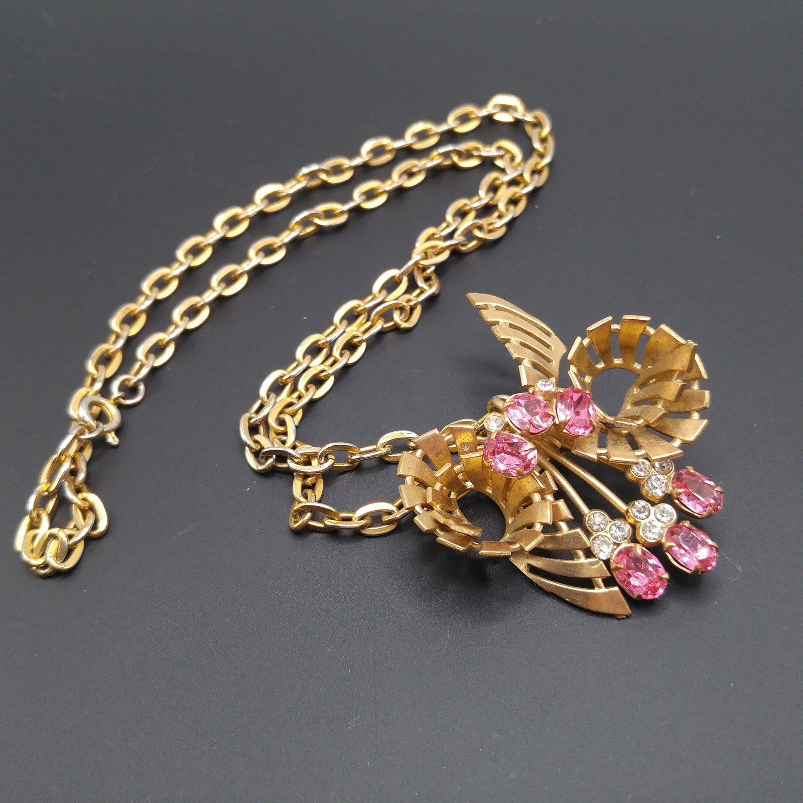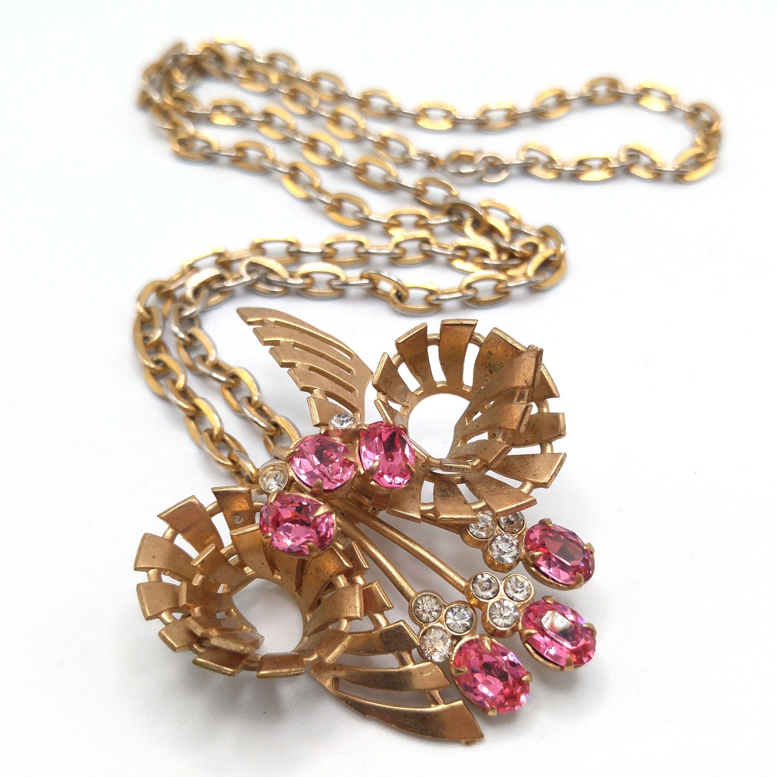 Pink Rhinestone Brooch Pendant Necklace, Gold Plated Pendant Brooch Combo, 1940s Vintage Jewelry