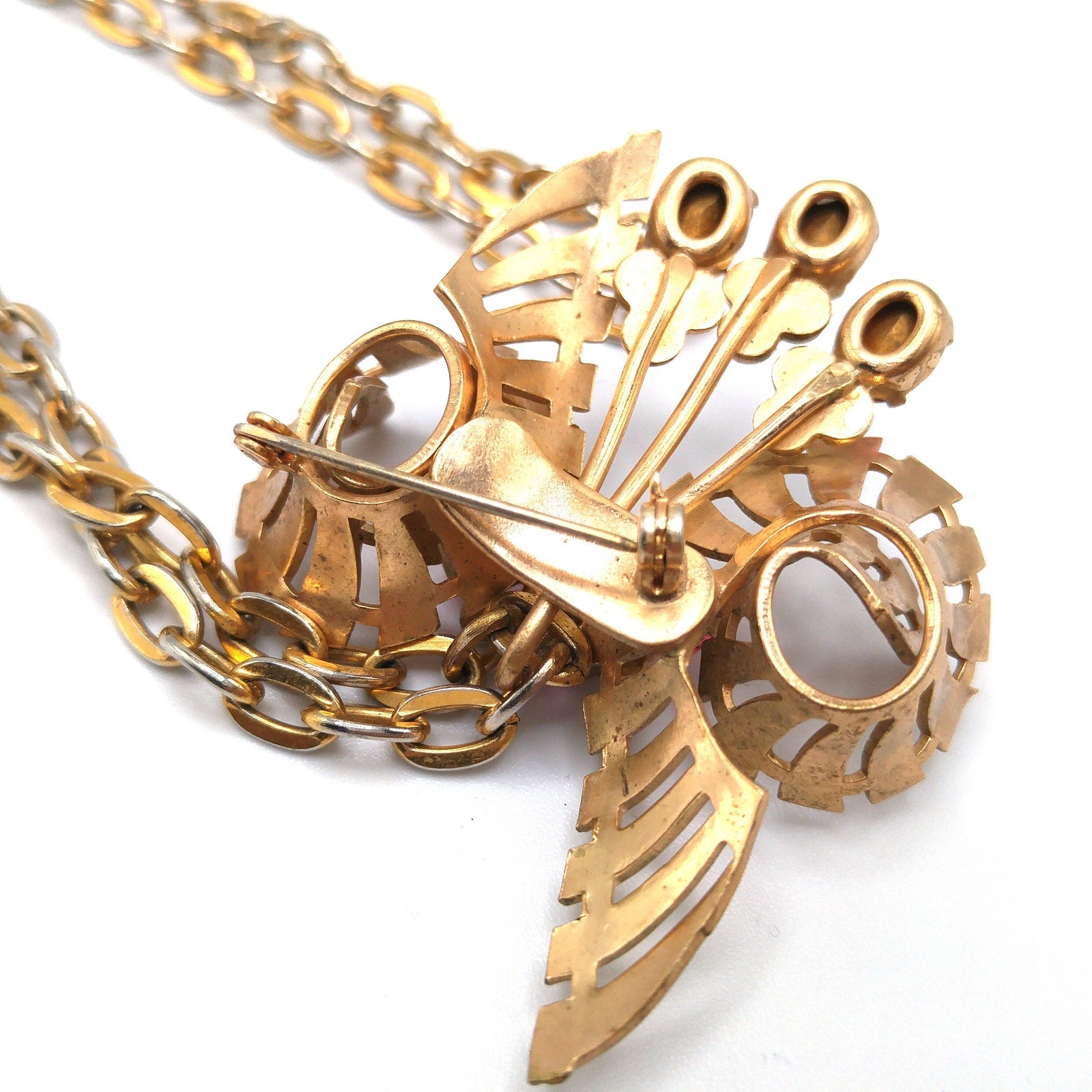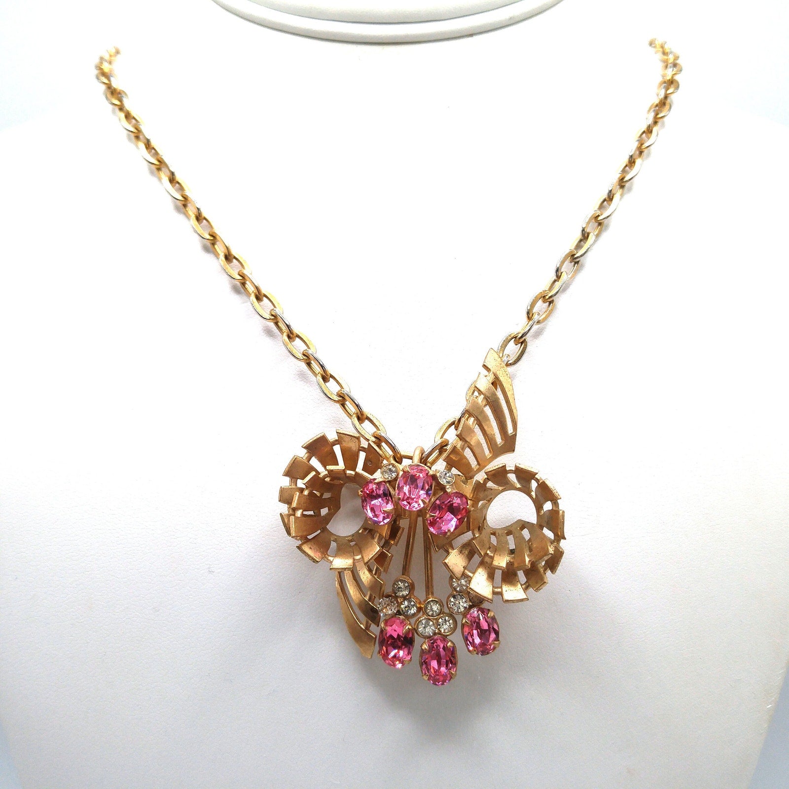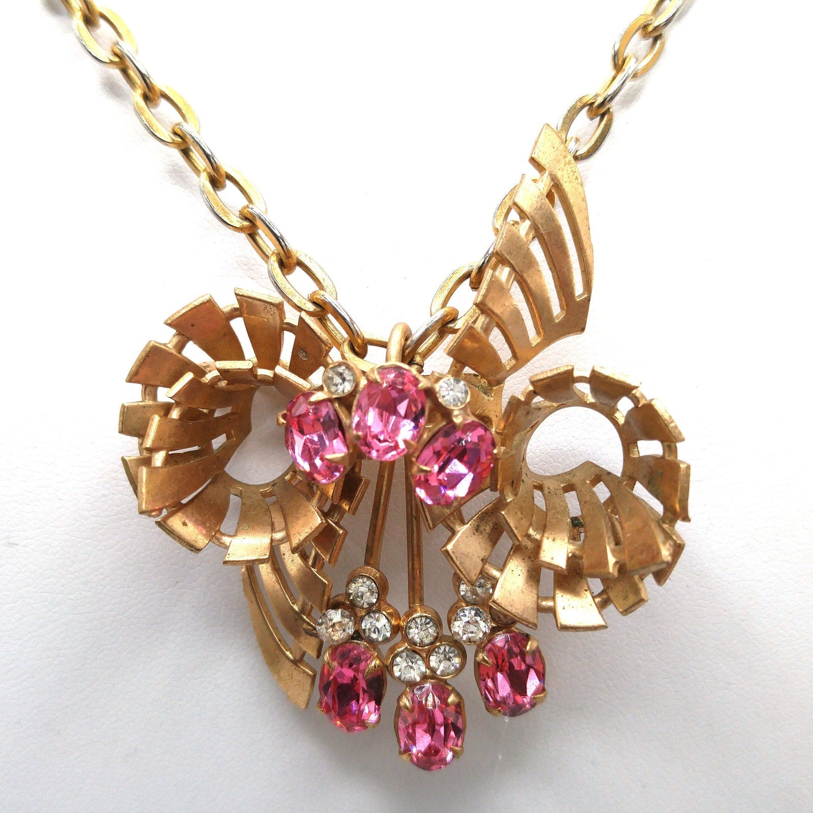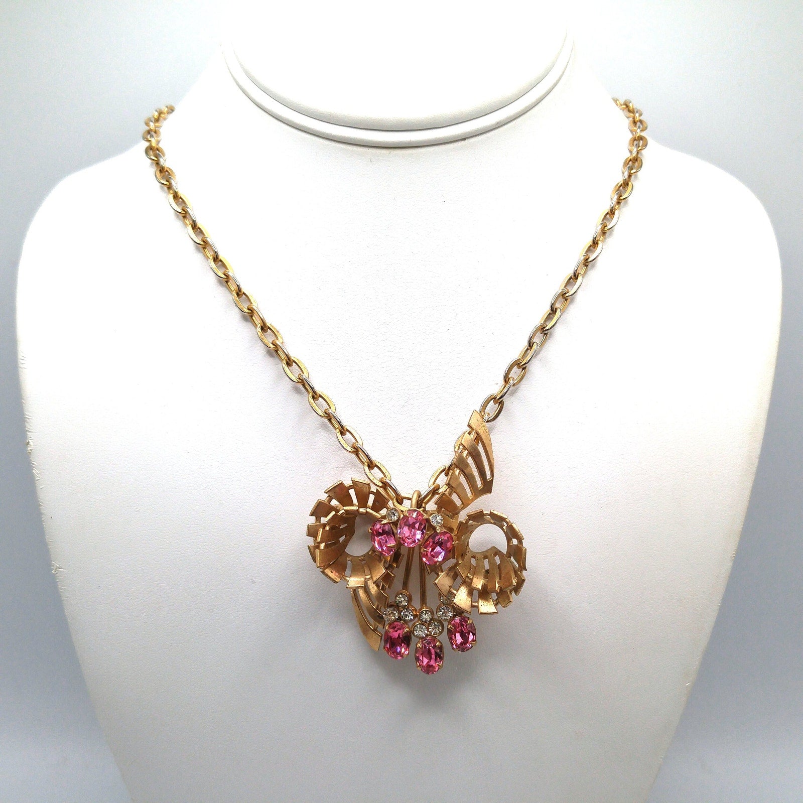 Pink Rhinestone Brooch Pendant Necklace, Gold Plated Pendant Brooch Combo, 1940s Vintage Jewelry