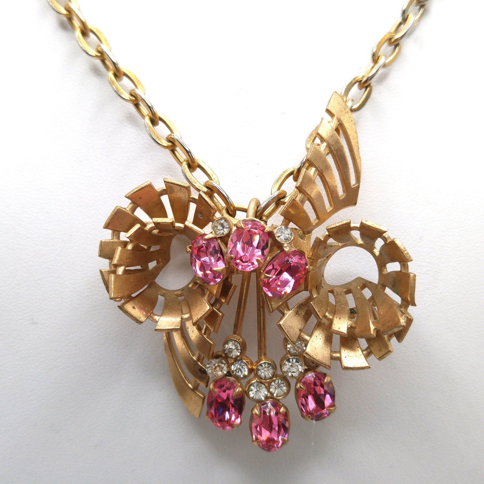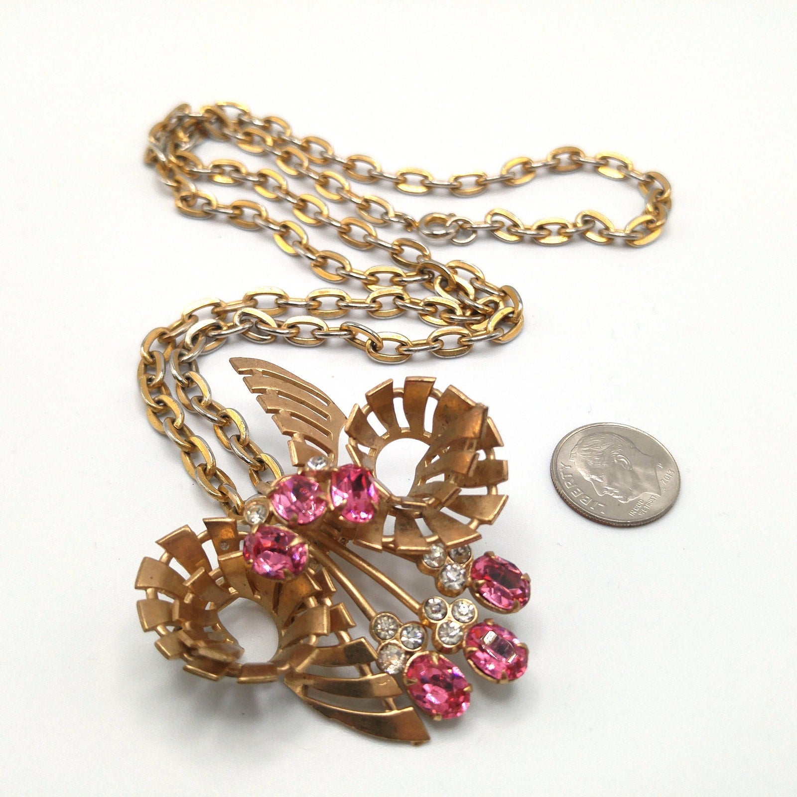 *Description: This is a beautiful 1940s pendant brooch combination on a 24 inch chain from the early mid-century. The six pink rhinestones are oval, foil back stones, and full of sparkle. There are eleven small clear rhinestones, chaton cut. This style of brooch from the 1940s has a floral open work design and can be transferred from a brooch to a pendant with the same elegant look. The chain has a spring clasp. This would be a great addition to your vintage jewelry collection or make a great vintage gift!
