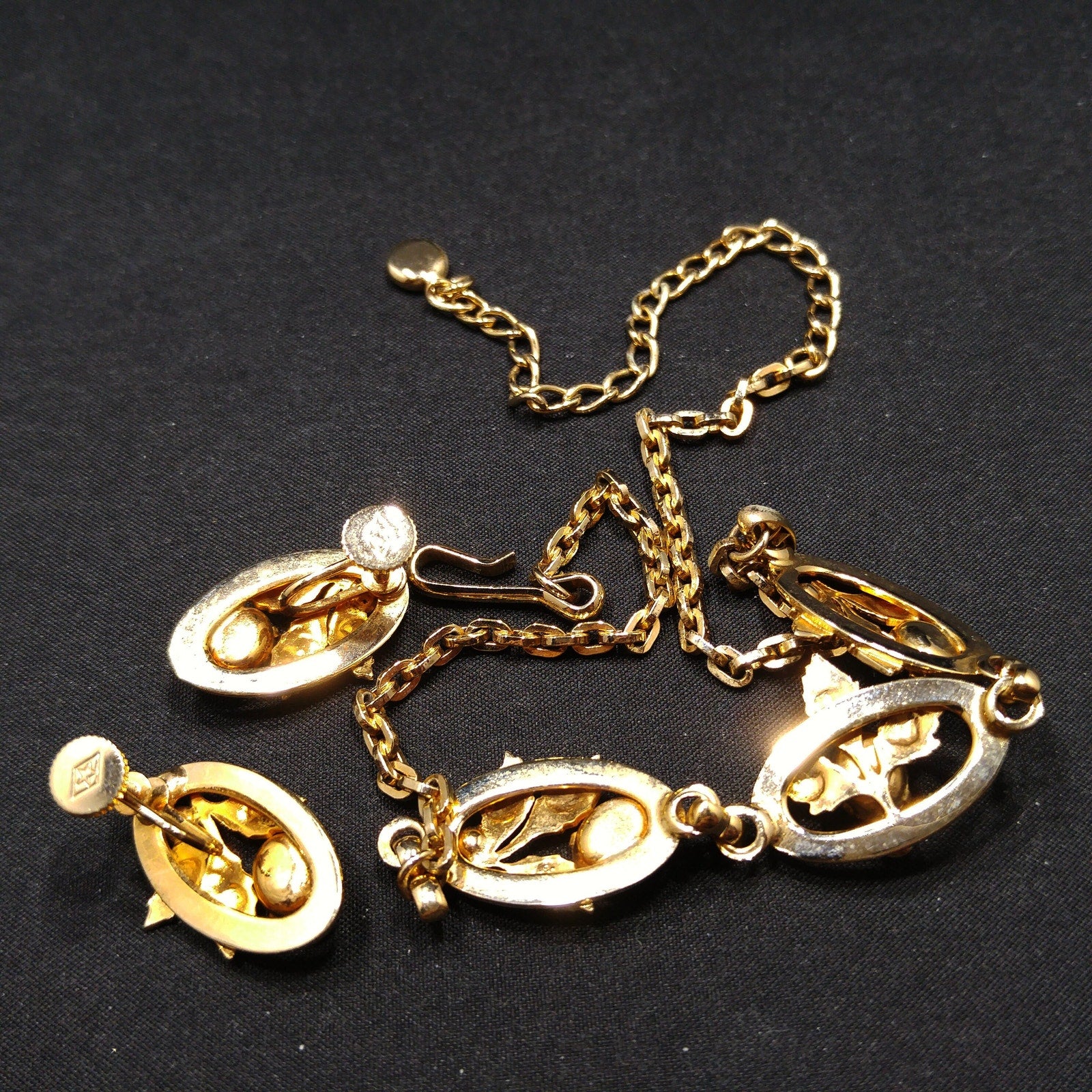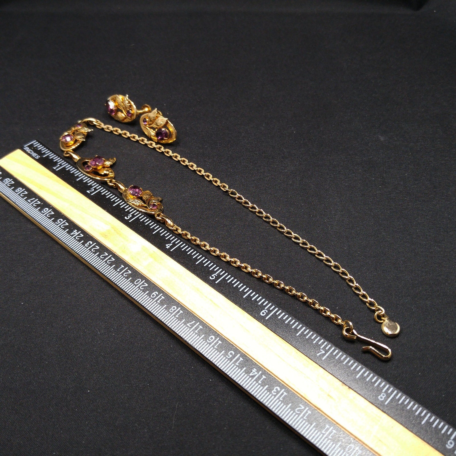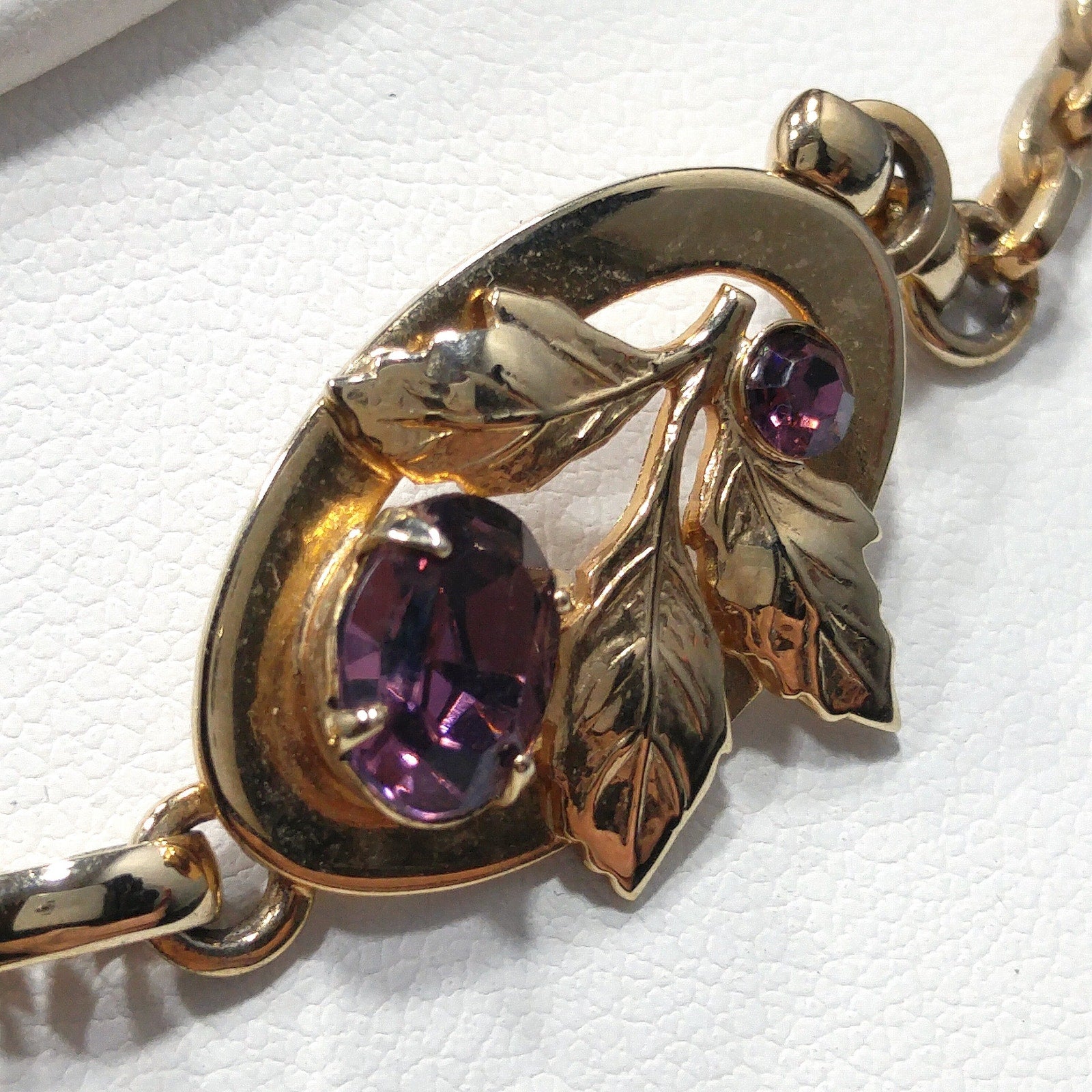 *Description: This is a beautiful purple rhinestone jewelry set with a choker floral necklace and matching screw back earrings. The earrings are marked with a diamond with a star inside. The jewelry is gold plated and is from the 1940s to early 1950s. This would be a great addition to your vintage jewelry collection or make a great vintage gift!