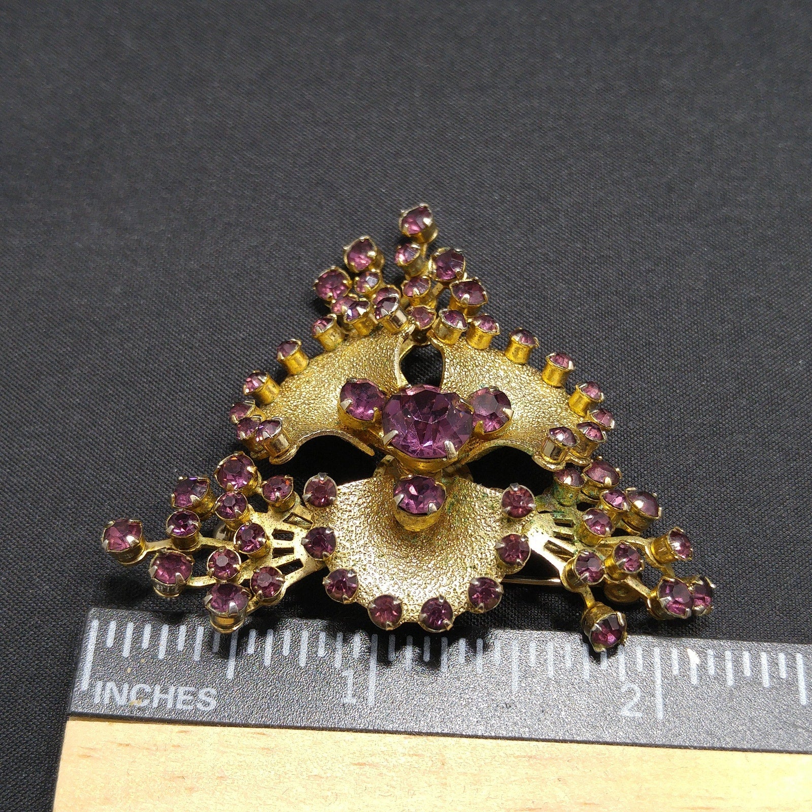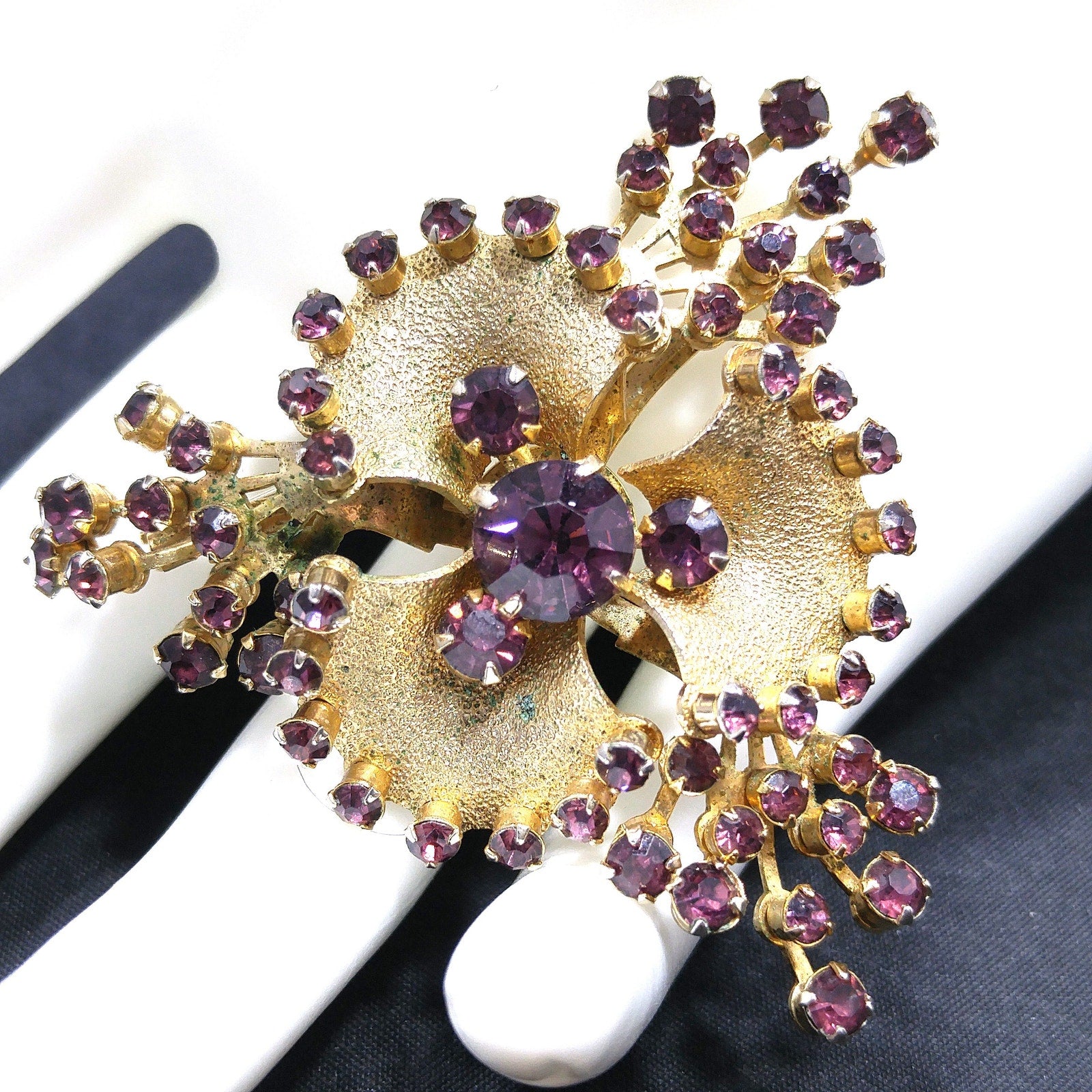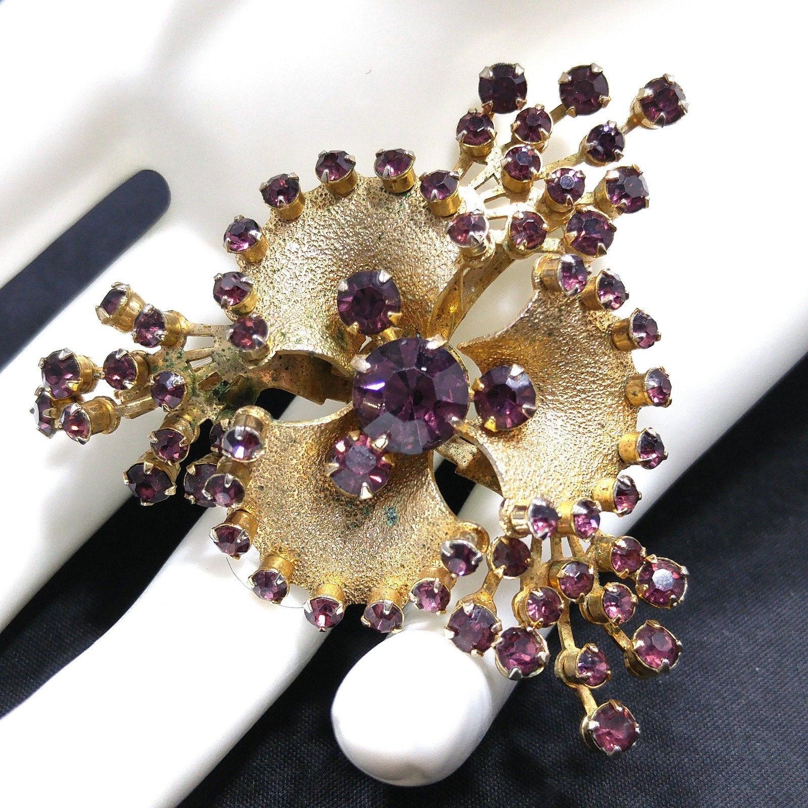 *Description: This is a great mid-century purple rhinestone flower brooch on gold plated metal from the late 1940s to 1950s. The rhinestones are all prong set and the flower is on a riveted base. I tested the surface metal and it tested at 10K gold wash or plate. This would be a great addition to your vintage jewelry collection or make a great vintage gift!