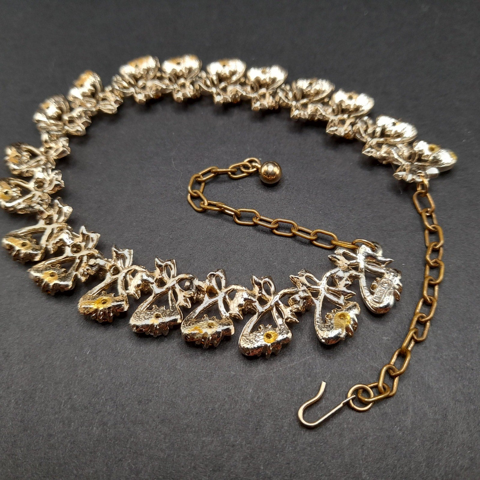 *Description: This is a great mid-century Arthur Pepper Red Aurora Borealis rhinestone choker necklace from the last half of the 1950s to the 1960s. The necklace has red ab rhinestones in two sizes on a gold tone textured background. The abundance of aurora borealis red rhinestones give the necklace a lot of shimmer and shine. The necklace is stamped ART with the copyright symbol as was the Arthur Pepper hallmark. This would be a great addition to your vintage jewelry collection or make a great vintage gift!