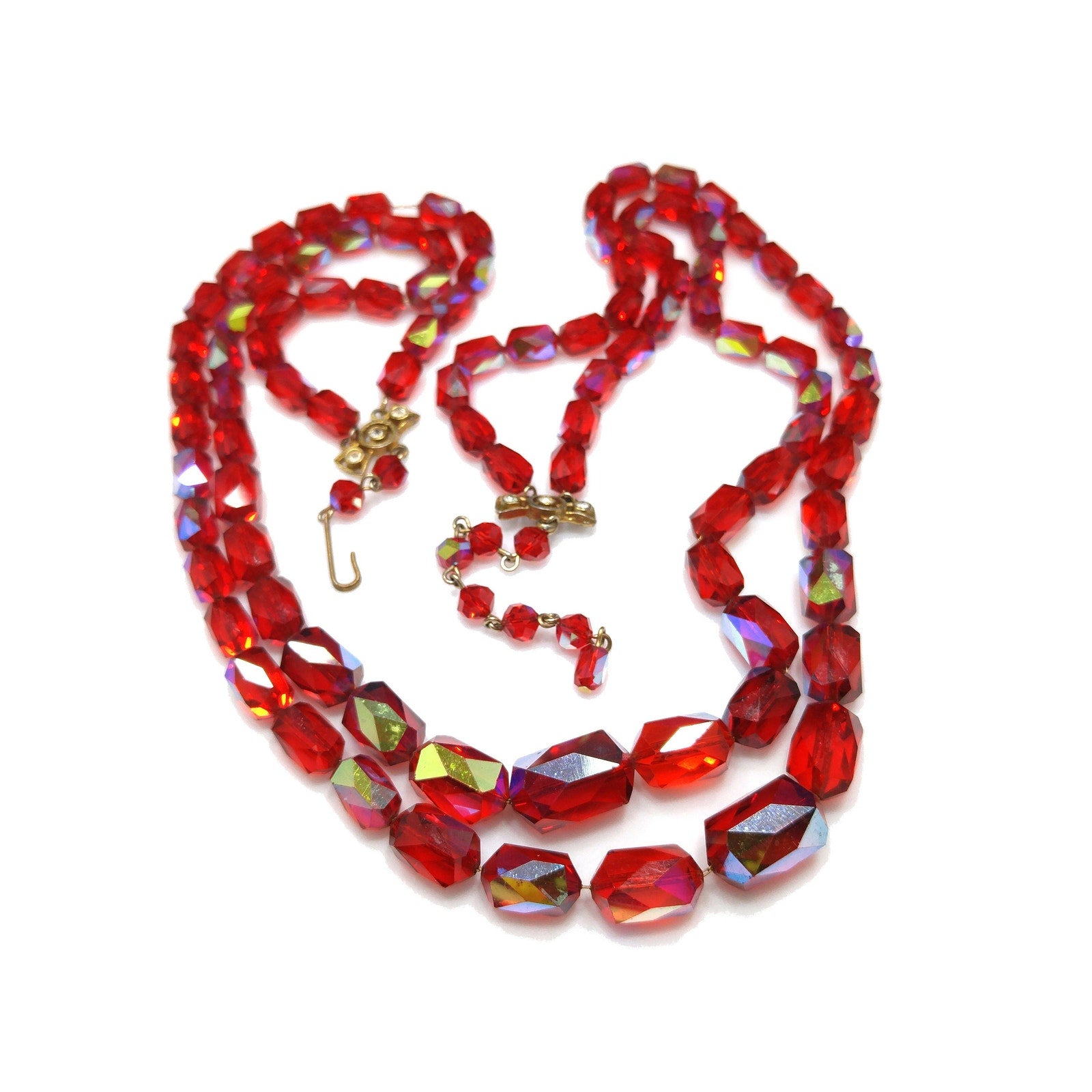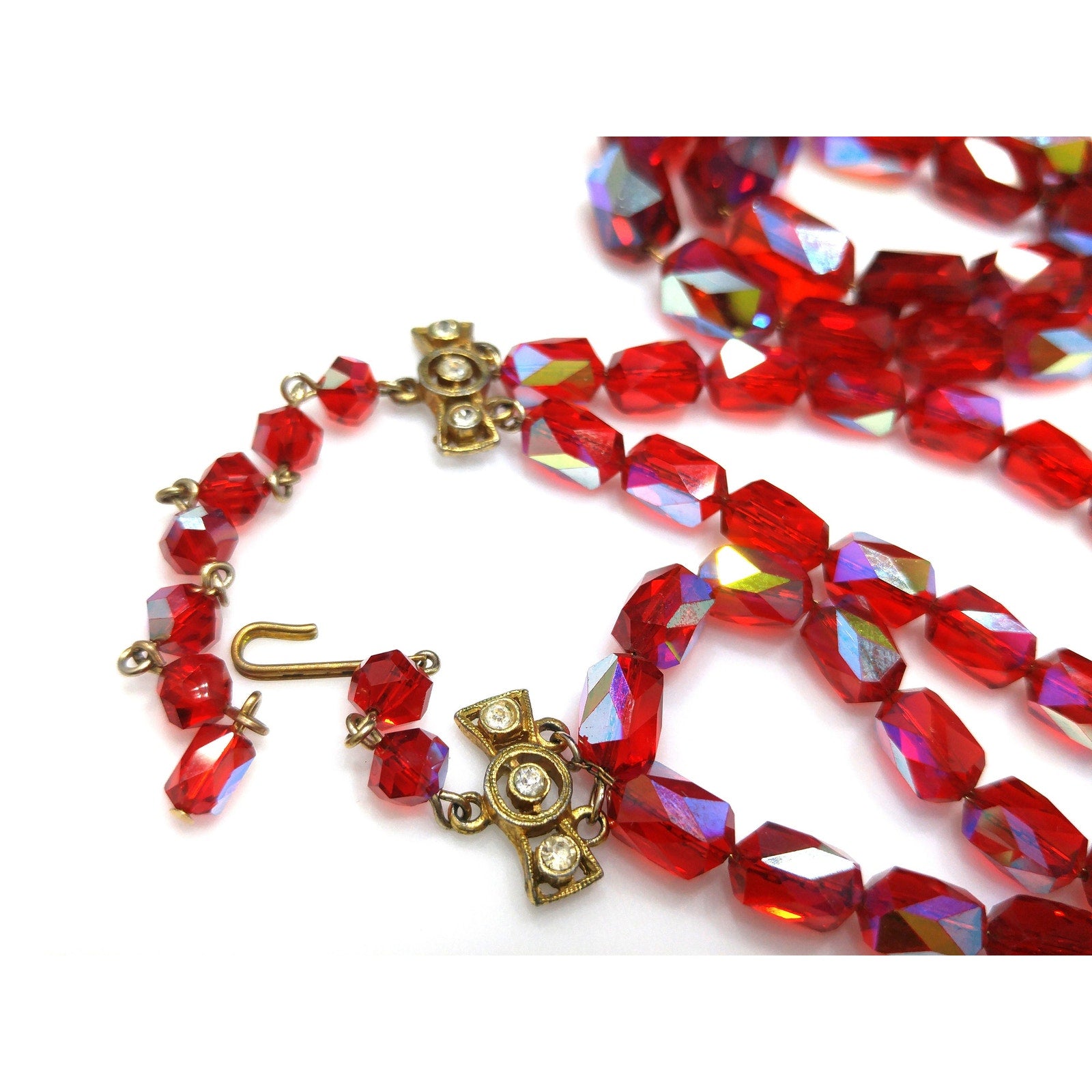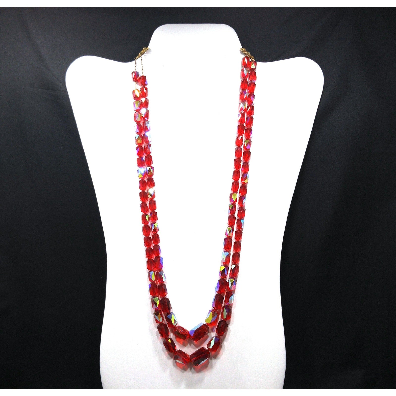 *Description: This is a beautiful red aurora borealis crystal bead two strand necklace from the 1970s. This sparkling necklace is strung on chain which makes the necklace strong and it has a hook and extension chain which allows you to adjust the length. This would be a great addition to your vintage jewelry collection or make a great vintage gift!