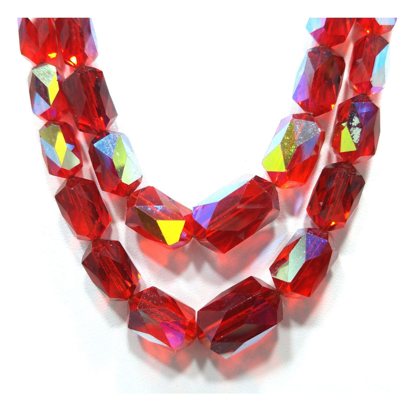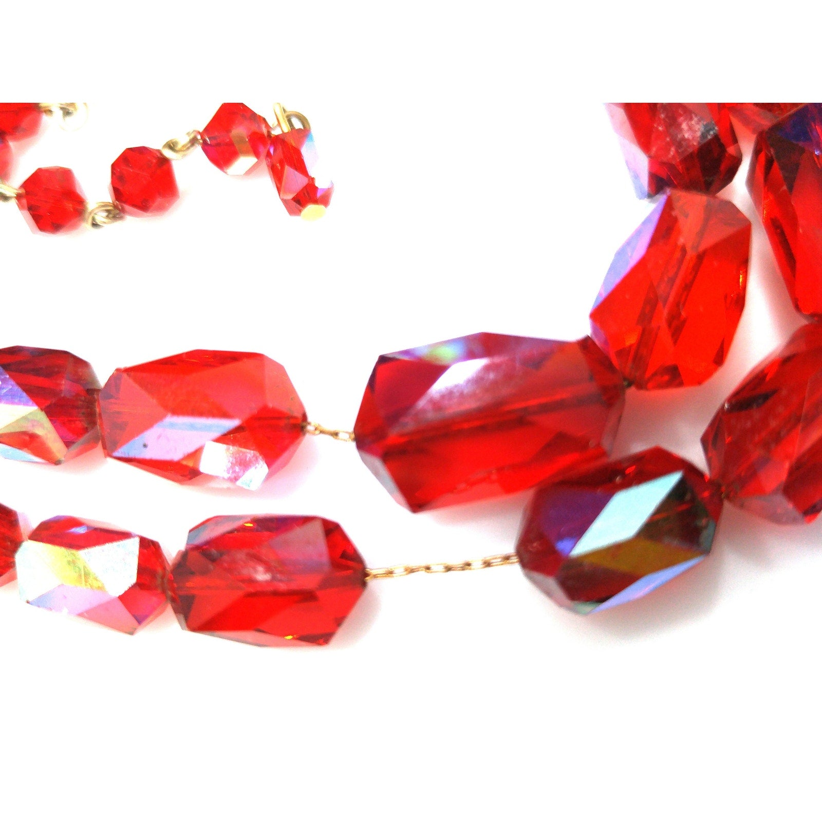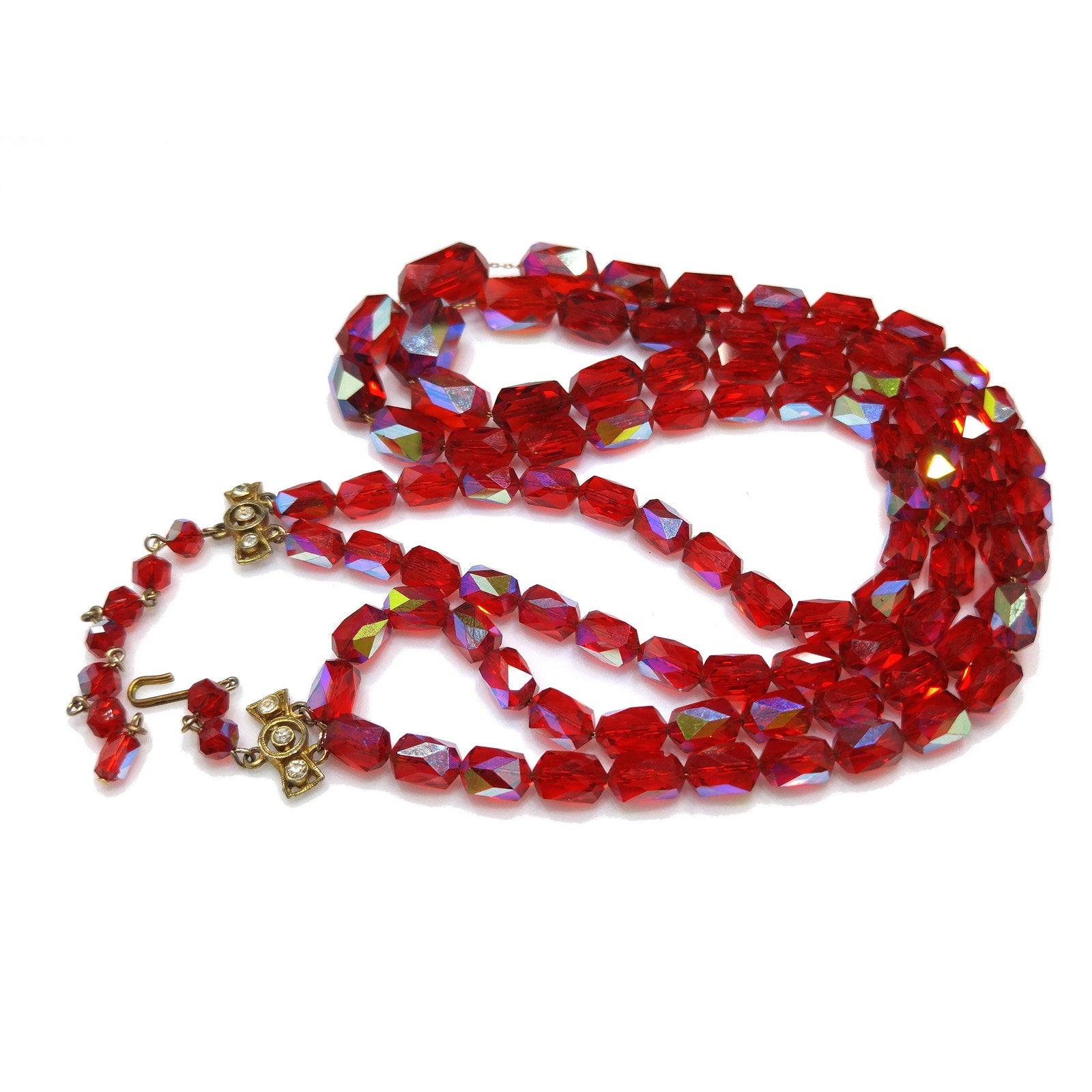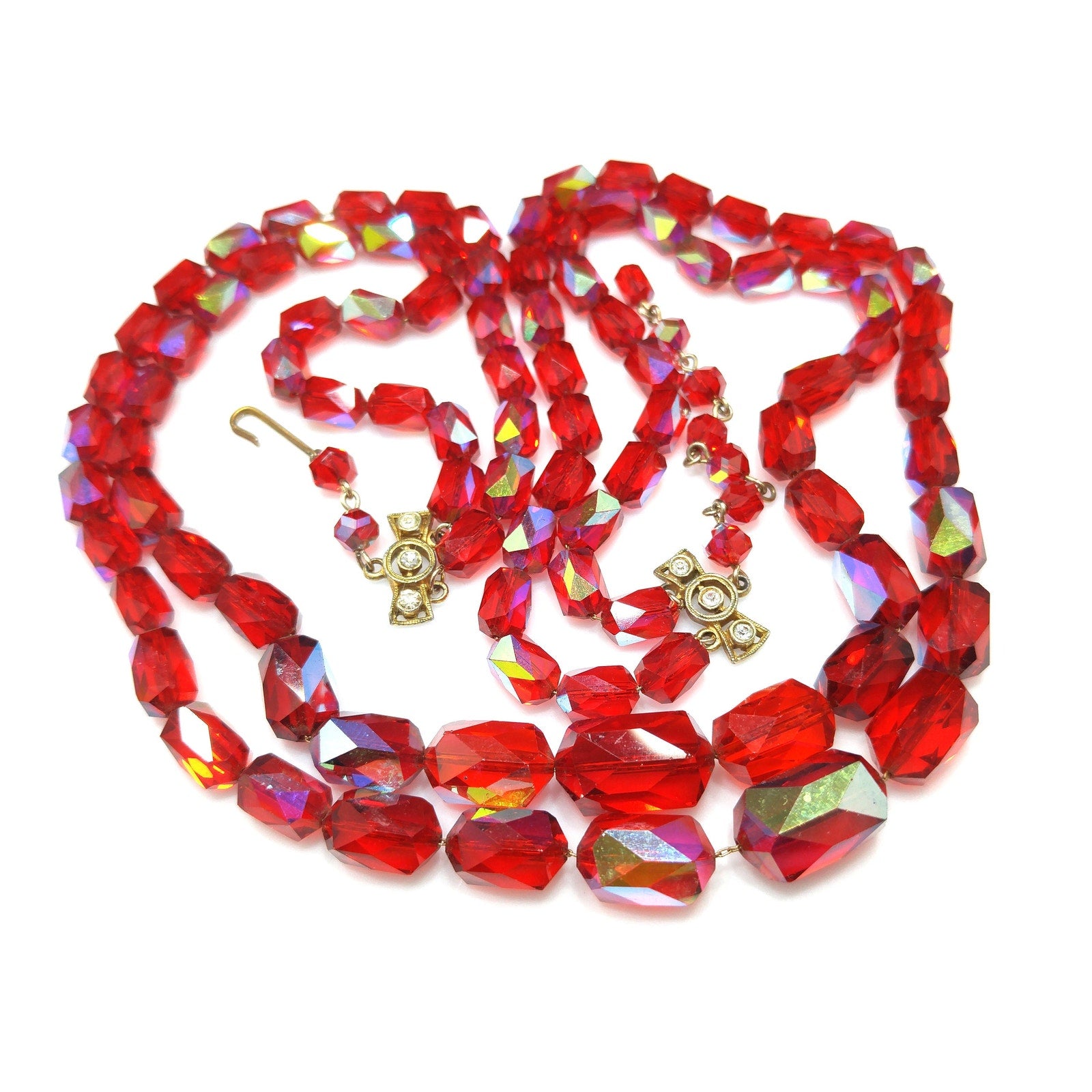 *Description: This is a beautiful red aurora borealis crystal bead two strand necklace from the 1970s. This sparkling necklace is strung on chain which makes the necklace strong and it has a hook and extension chain which allows you to adjust the length. This would be a great addition to your vintage jewelry collection or make a great vintage gift!