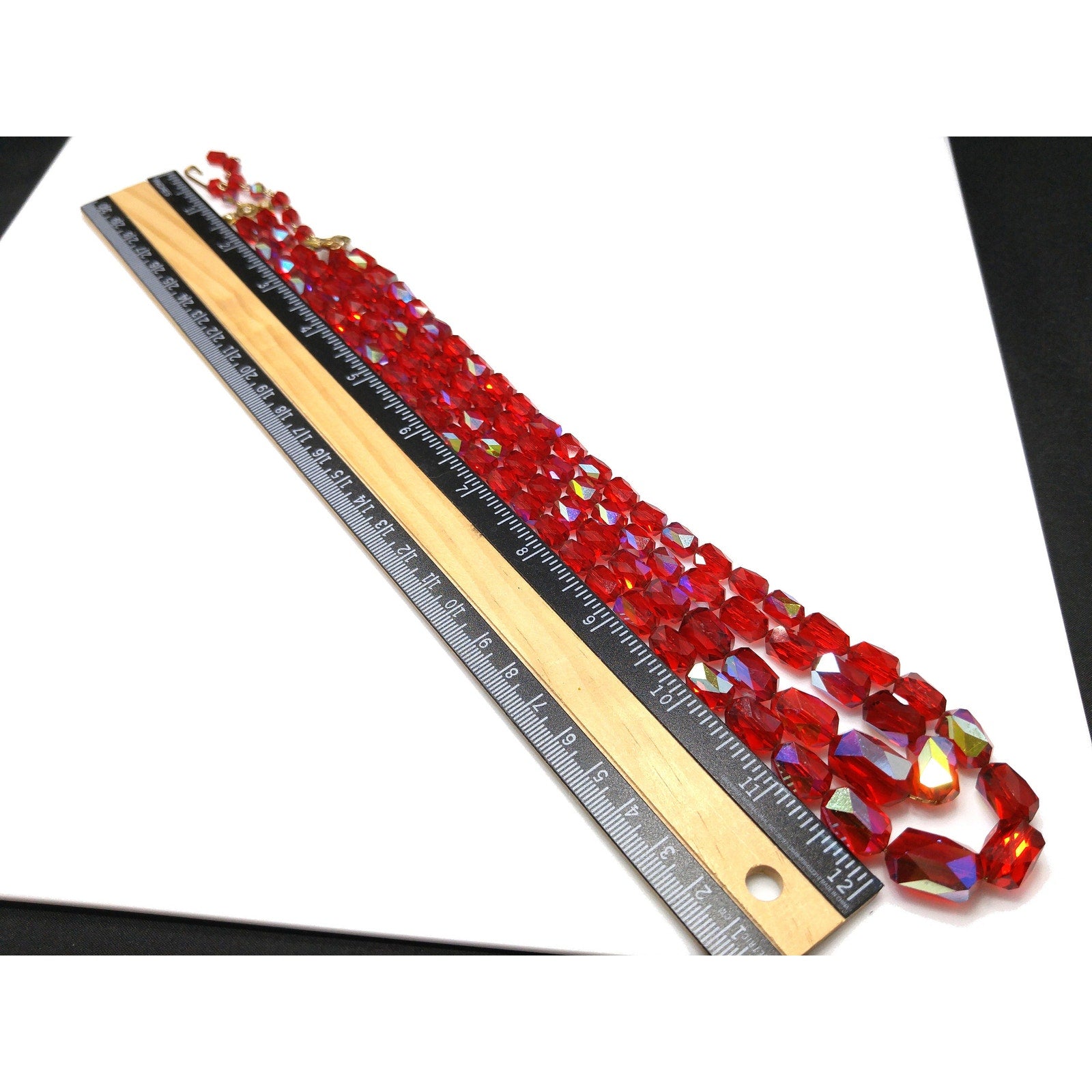 Red Aurora Borealis Graduated Beaded Two Strand Necklace on Chain, 1970s Vintage Jewelry