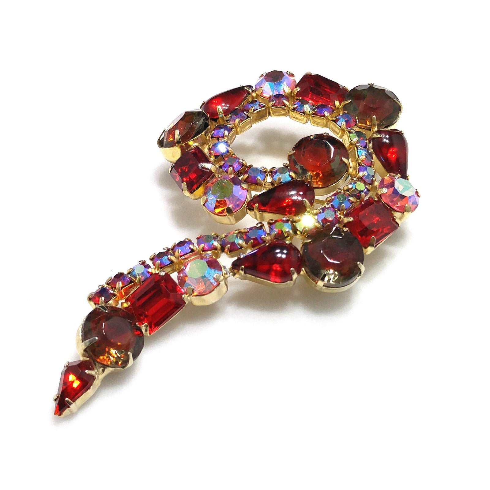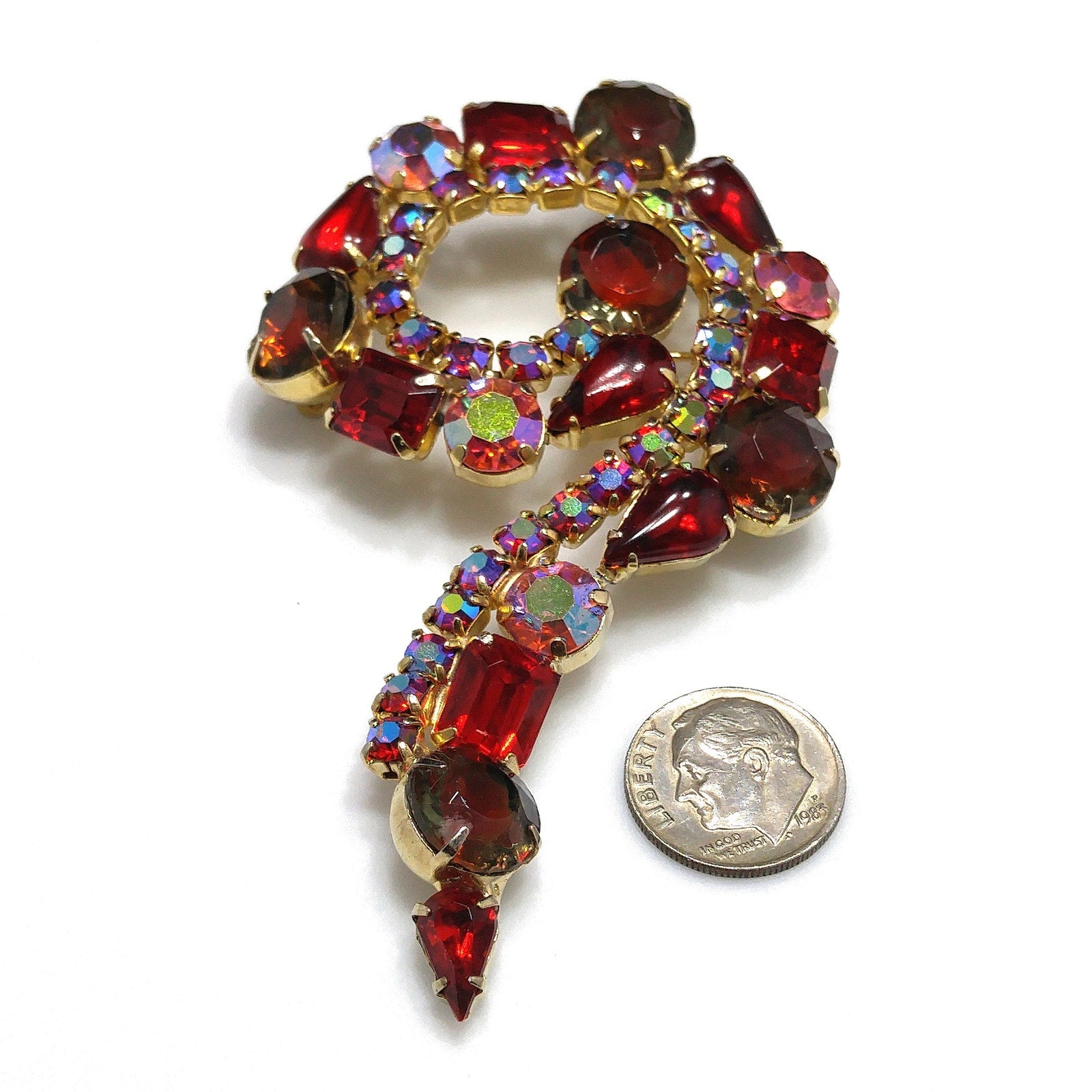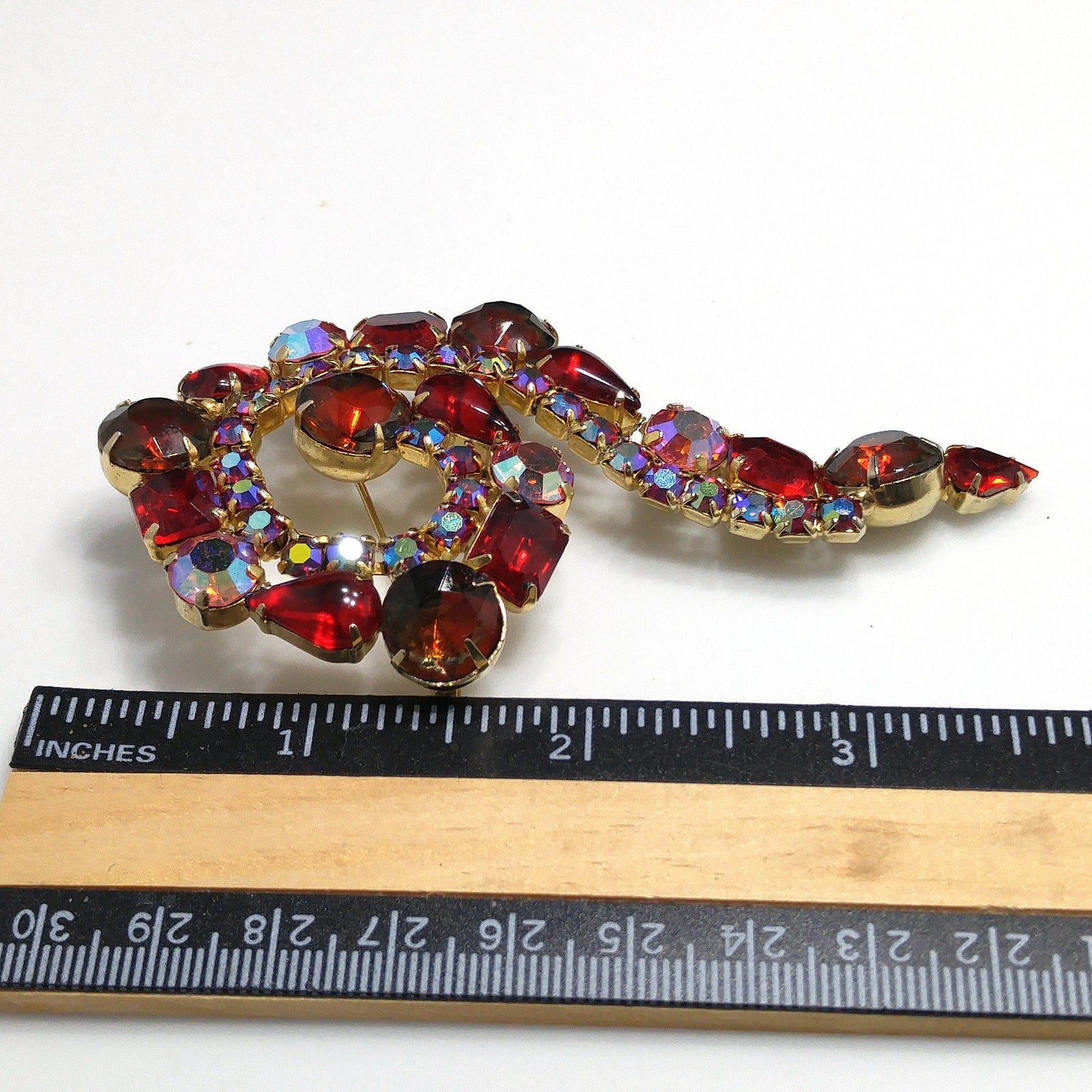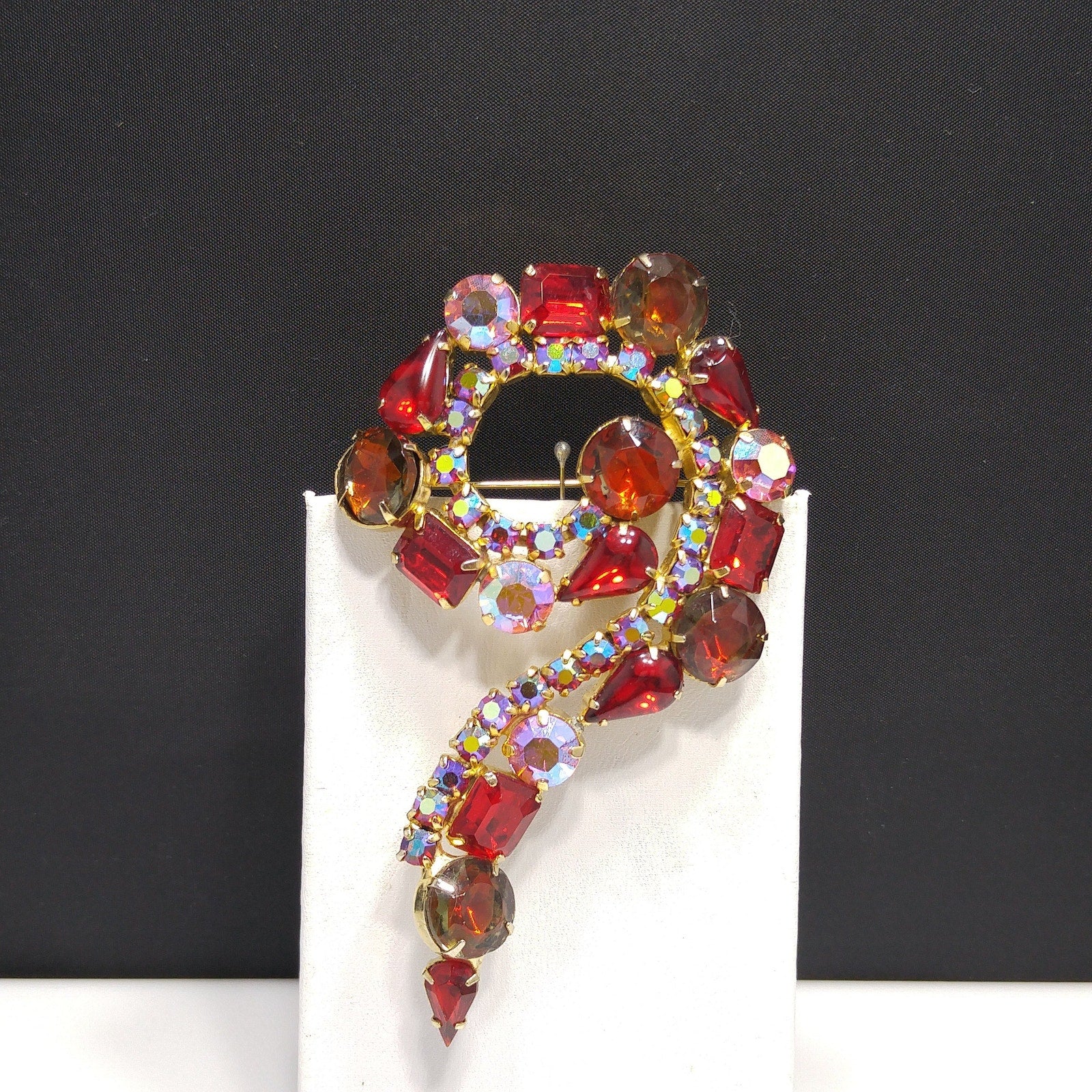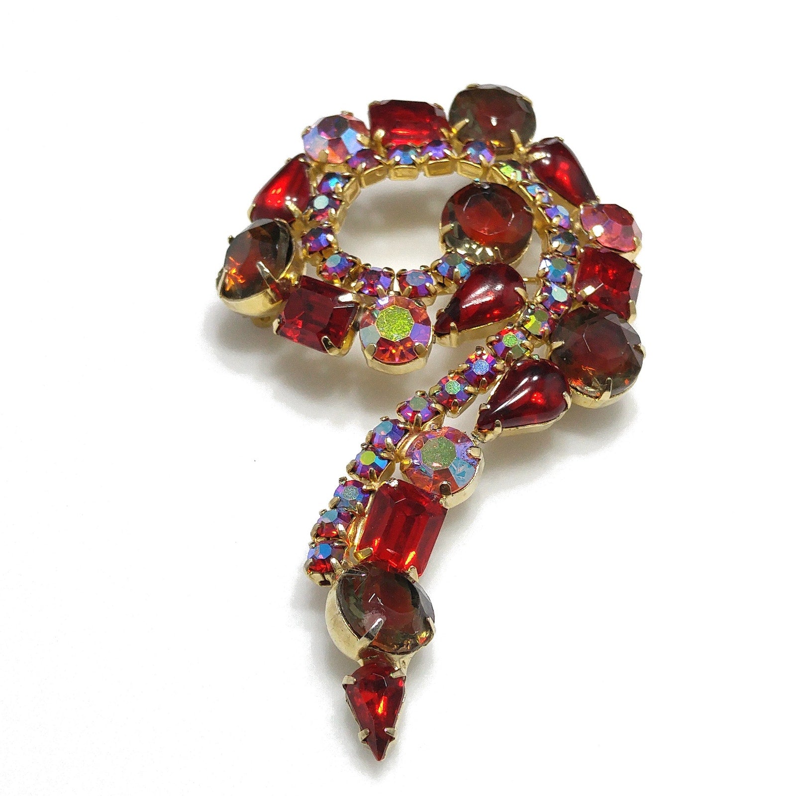 *Description: This is a unique red aurora borealis question mark brooch from the 1960s. The brooch shaped like a question mark was very popular during the 60s. This brooch is rather large at 3 3/4 inches in length. The beautiful rhinestones include aurora borealis and red on the gold plated backing. Gorgeous brooch for your favorite jacket, dress, hat, or bag. This would be a great addition to your vintage jewelry collection or make a great vintage gift!