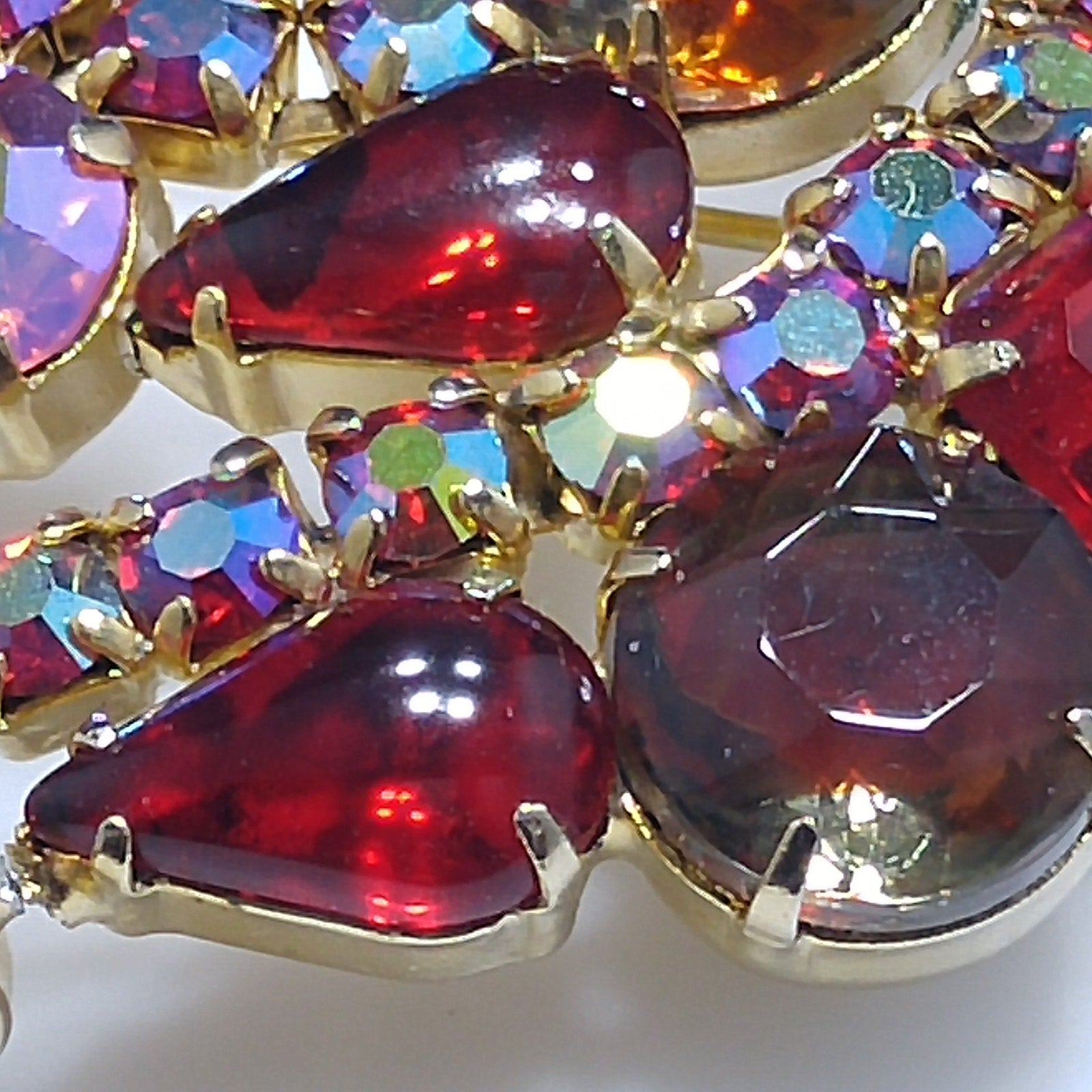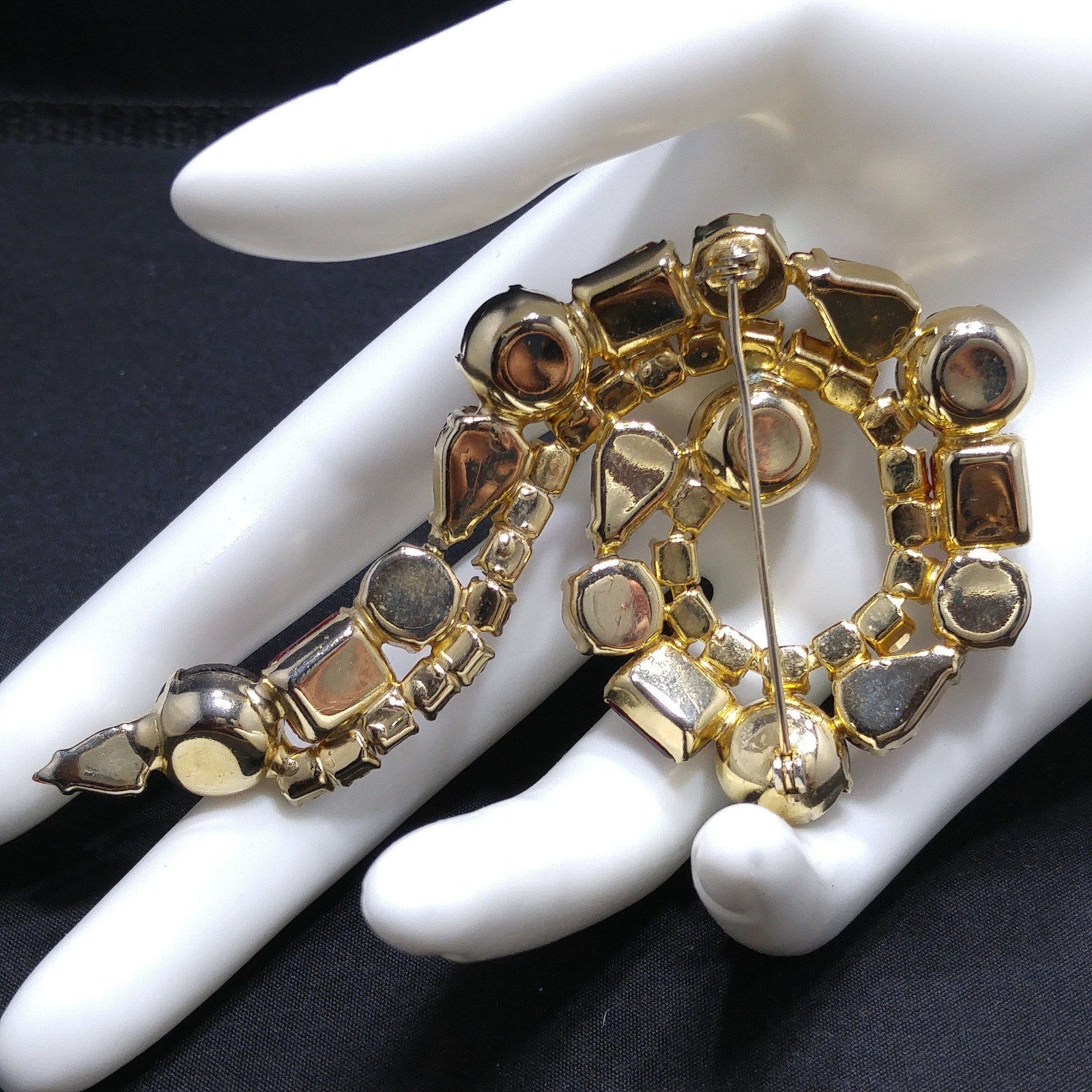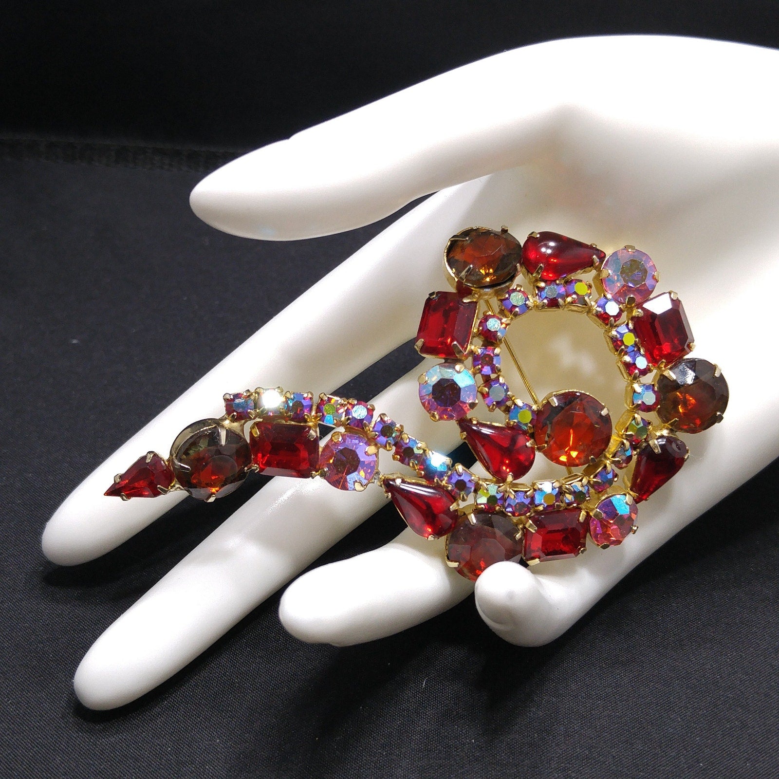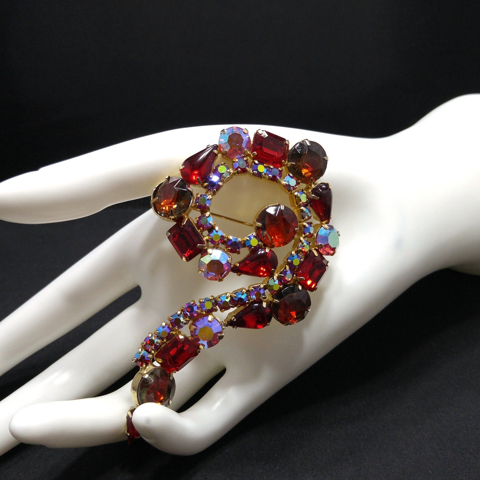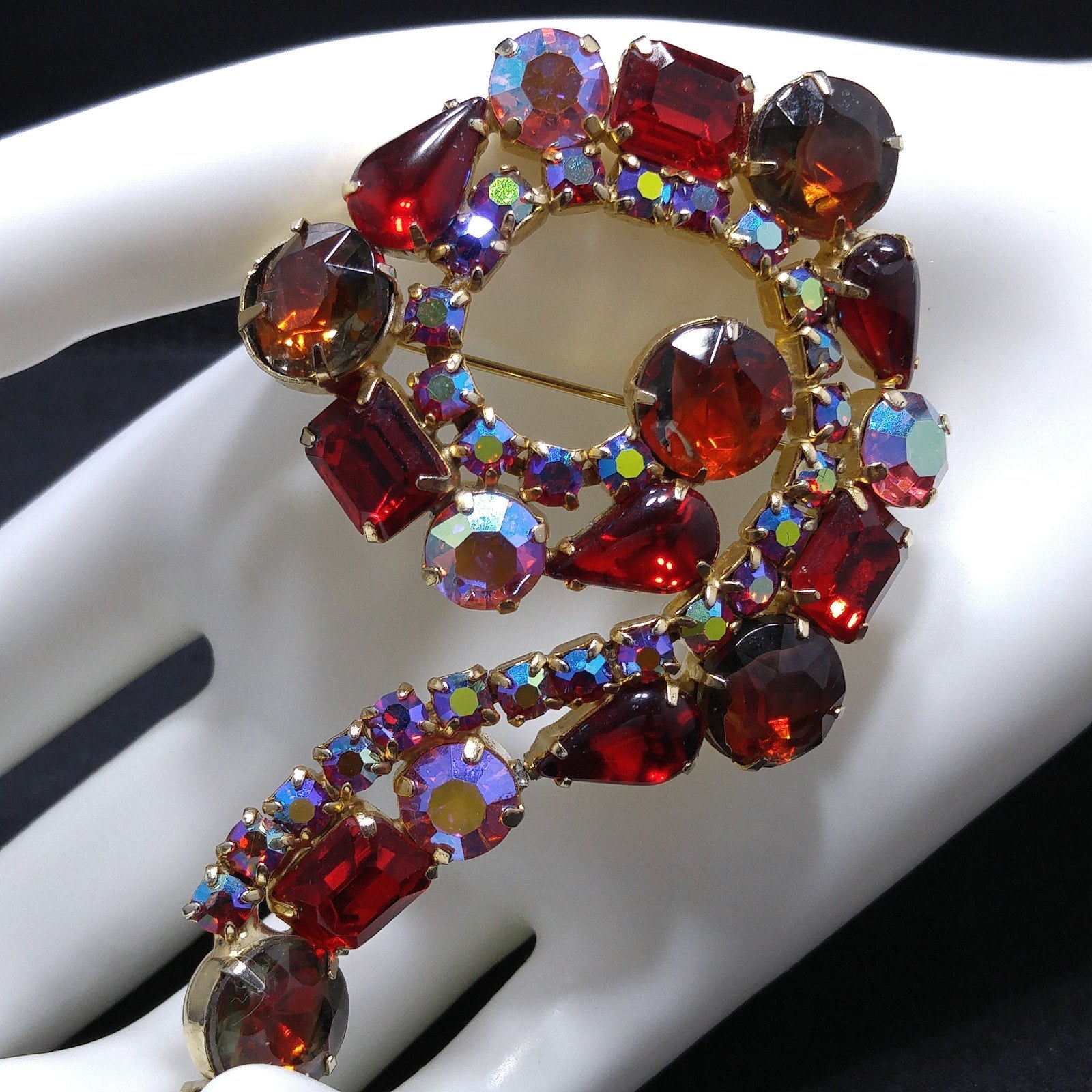 *Description: This is a unique red aurora borealis question mark brooch from the 1960s. The brooch shaped like a question mark was very popular during the 60s. This brooch is rather large at 3 3/4 inches in length. The beautiful rhinestones include aurora borealis and red on the gold plated backing. Gorgeous brooch for your favorite jacket, dress, hat, or bag. This would be a great addition to your vintage jewelry collection or make a great vintage gift!