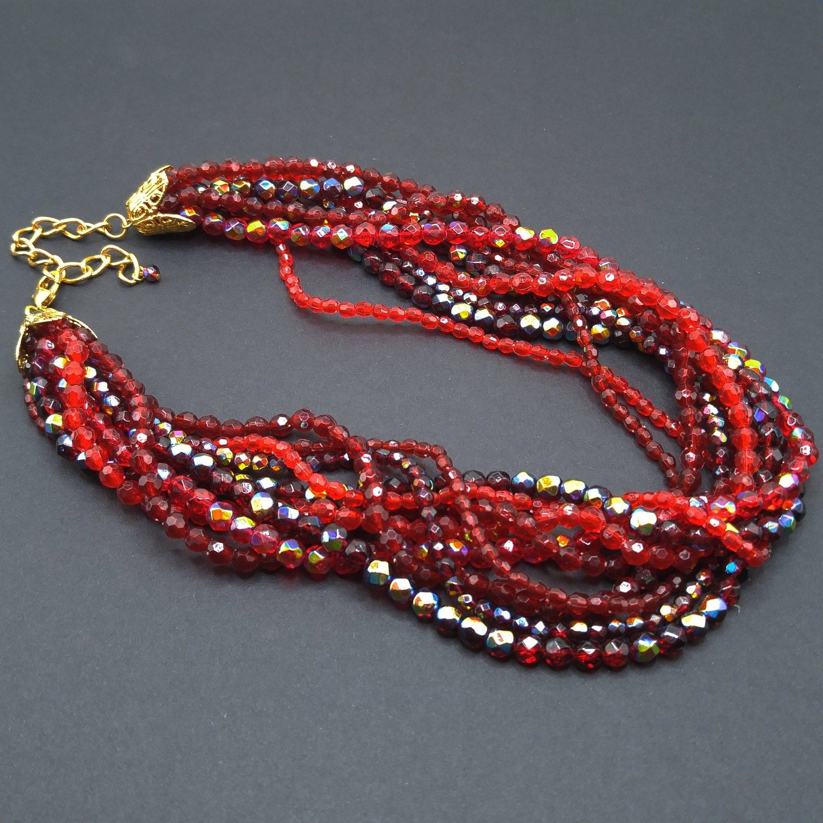 *Description: This is a beautiful red fire polished beaded necklace with nine strands of beads from the 1980s. The necklace has a combination of fire polished beads, giving it the aurora borealis look, and solid red beads. The necklace is made of acrylic which gives you a lighter weight for so many strands. It has a lobster clasp and two filigree large end caps. The necklace length is up to 21 inches and adjustable. This would be a great addition to your vintage jewelry collection or make a great vintage gift!