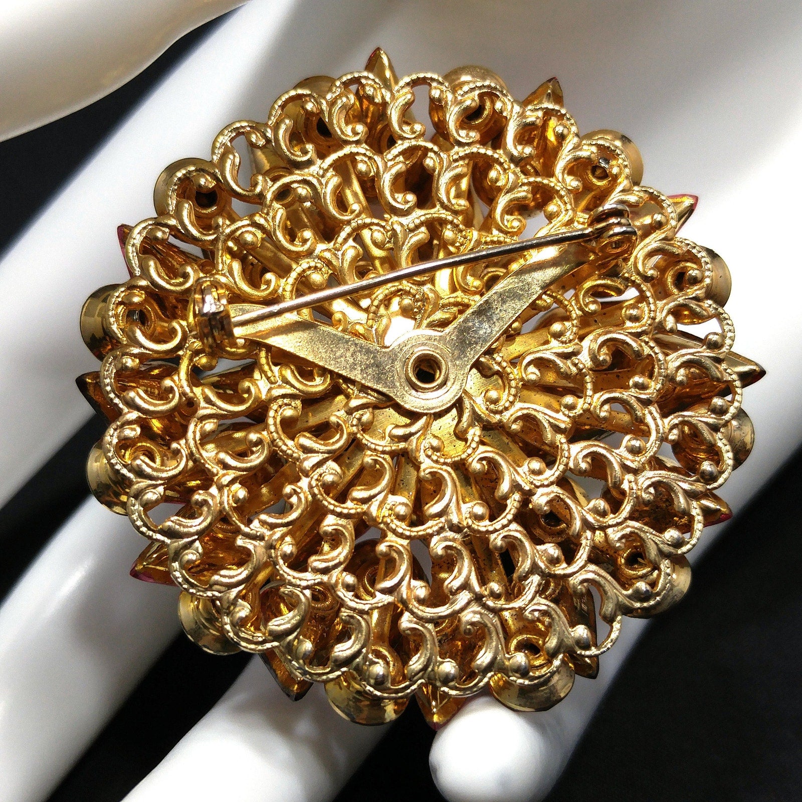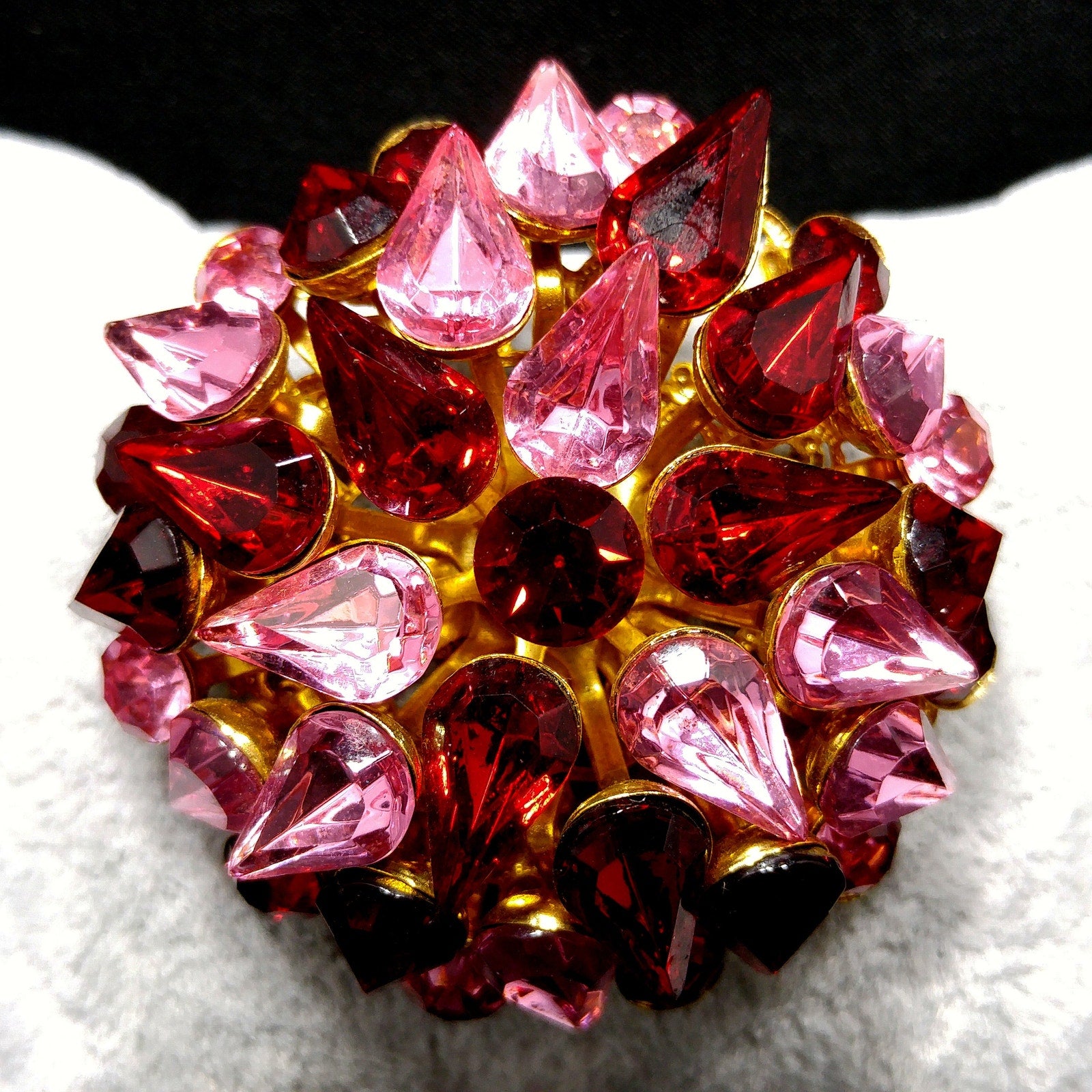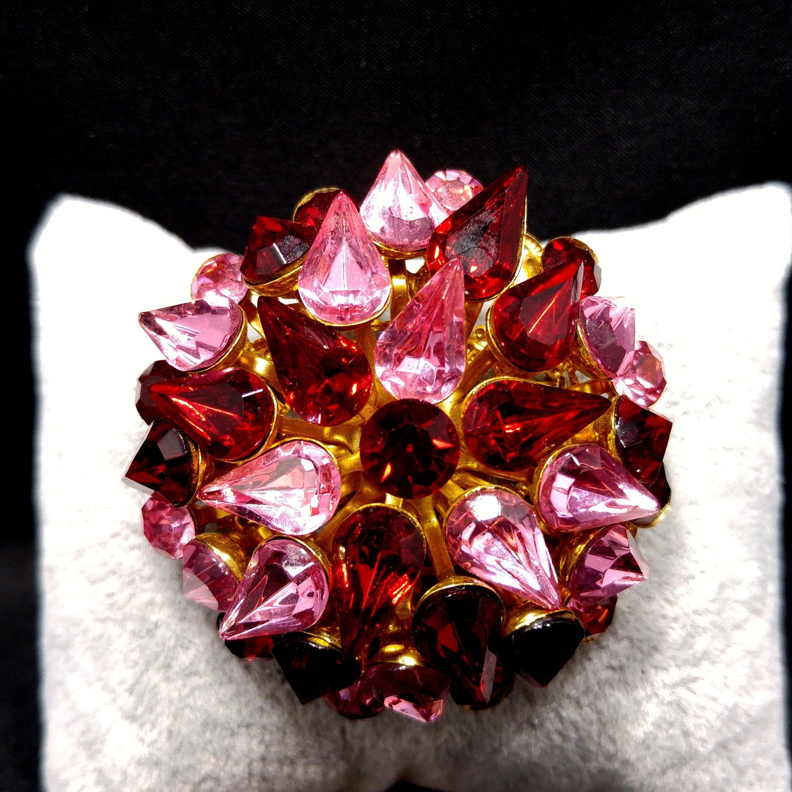 *Description: This is a beautiful pink & red crystal rhinestone brooch in a floral domed design with a filigree gold plated base from the 1950s. This has all of the high end designer qualities and is unsigned. Each rhinestone is gorgeous and prong set. The brooch is made in two sections with each rhinestone sitting on a lifted riveting branch and on the back of the brooch is a swirling filigree backing which covers the layers underneath. The brooch sits up 1/2 inch and has teardrop and chaton cut rhinestones. This would be a great addition to your vintage jewelry collection or make a great vintage gift!