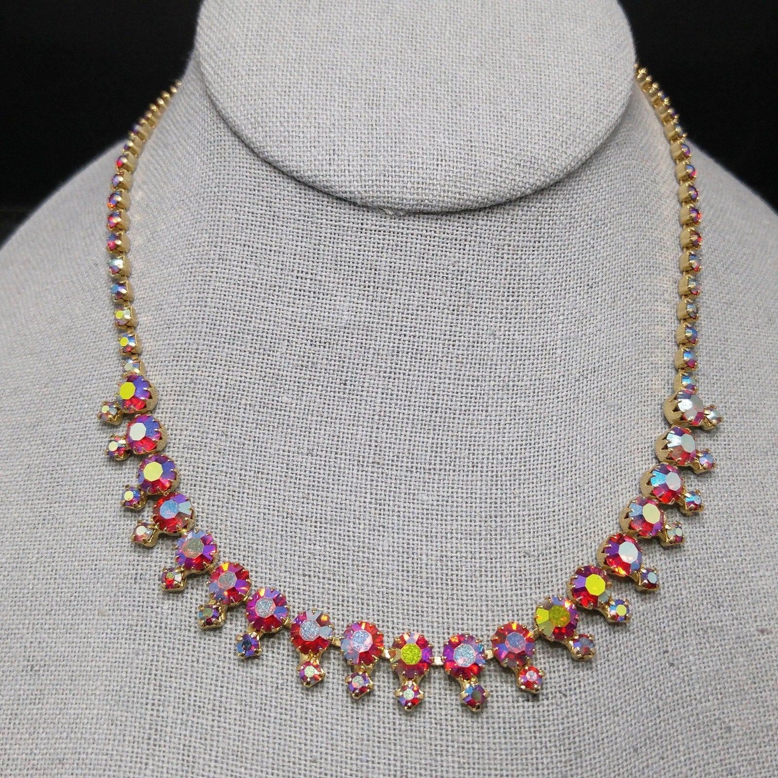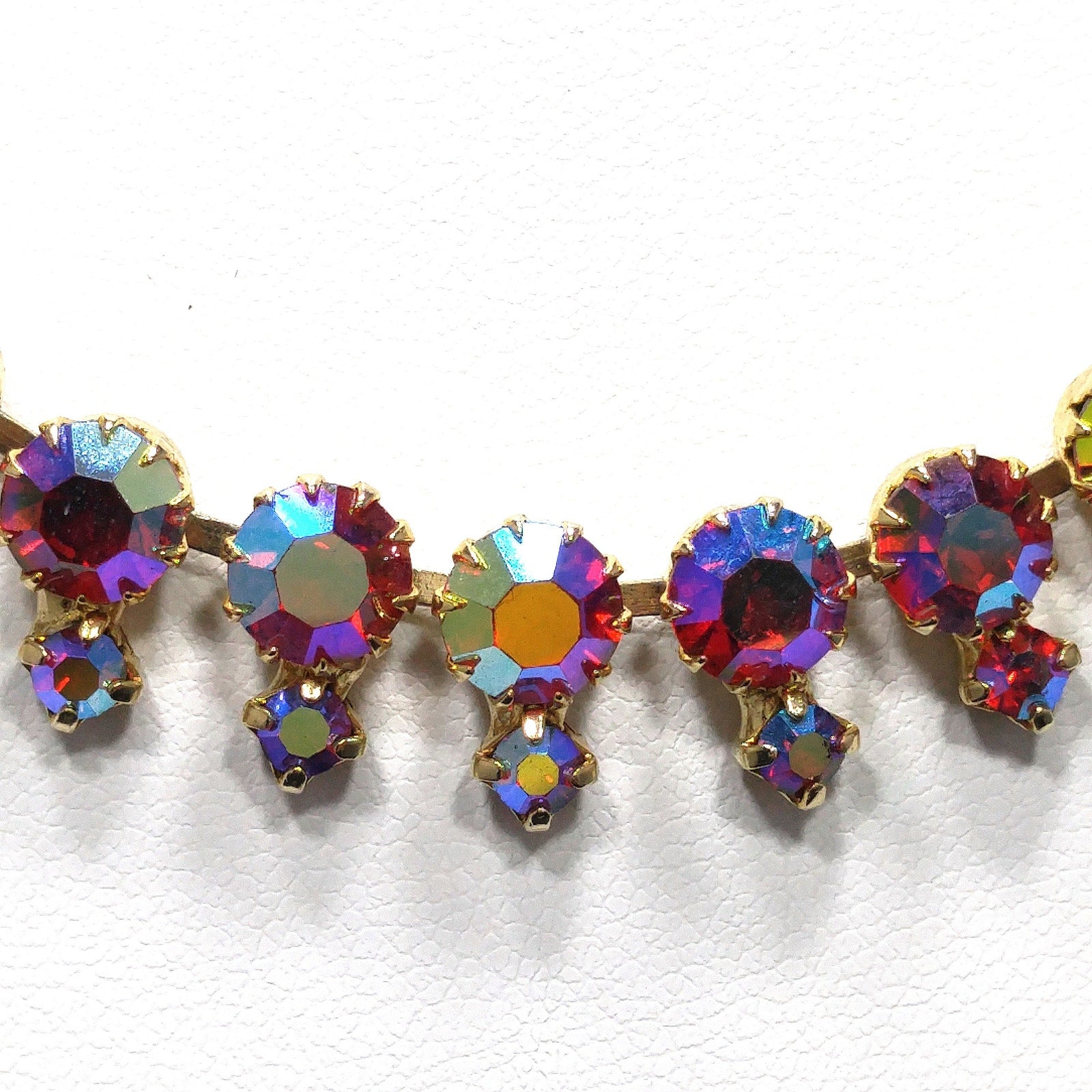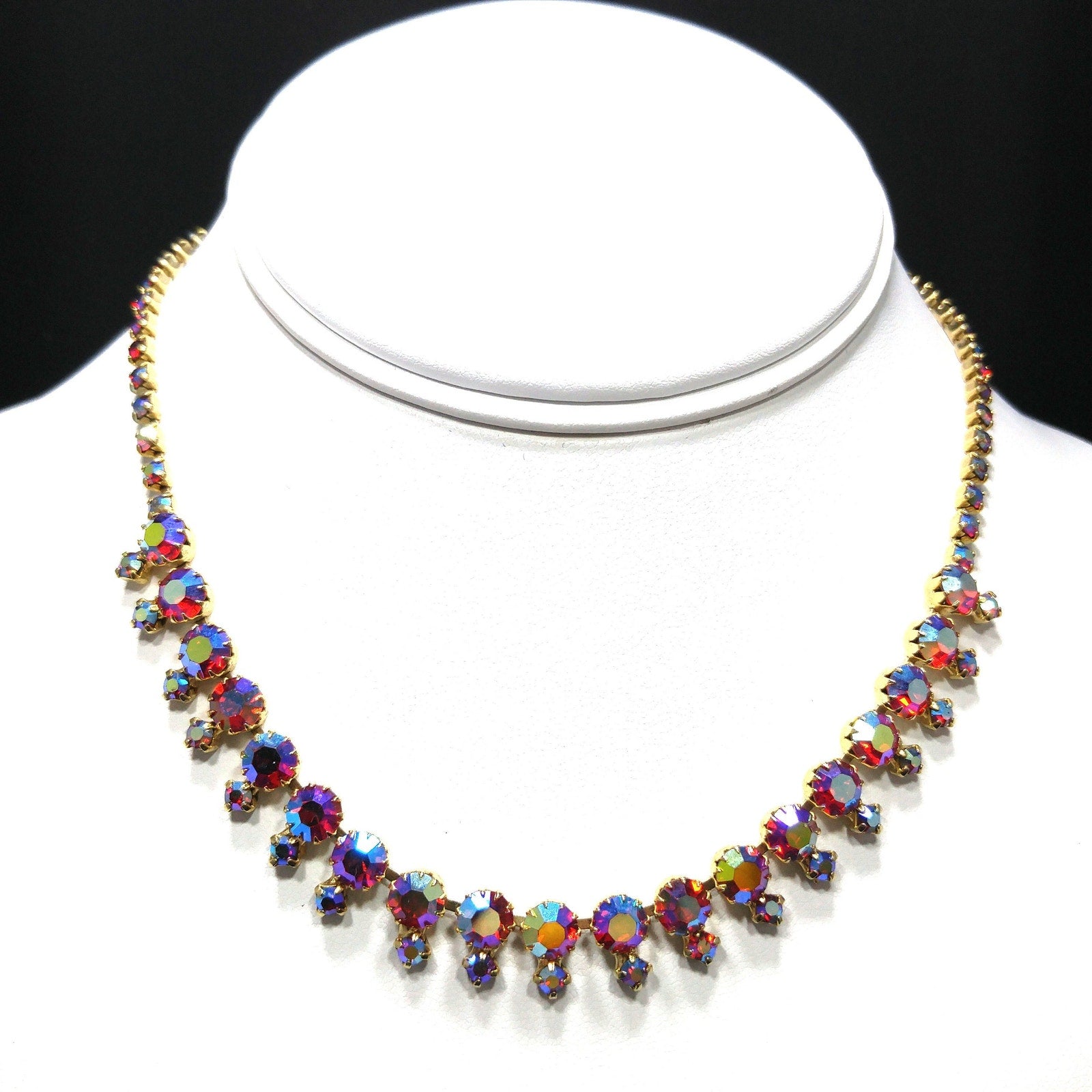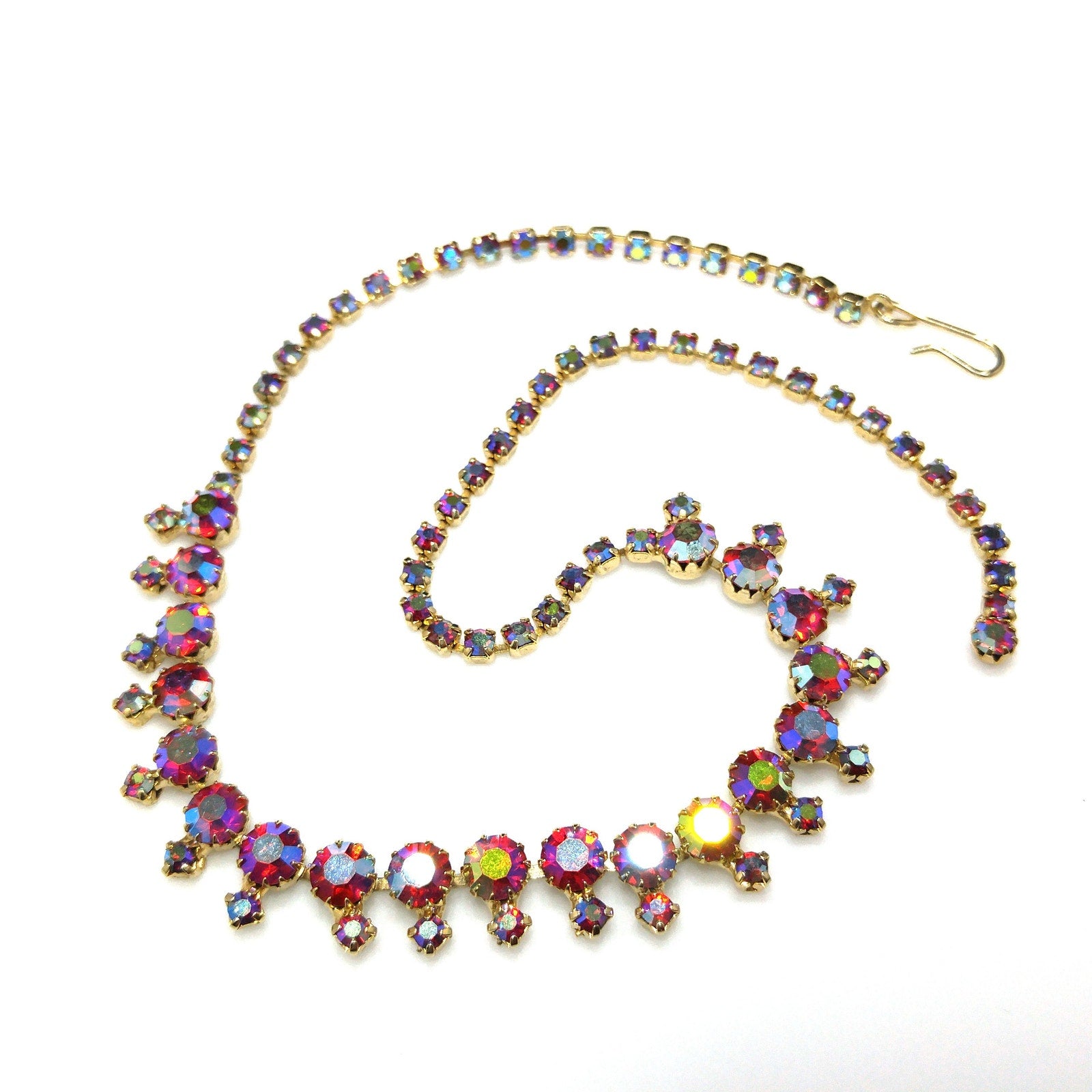 *Description: This is a beautiful aurora borealis red rhinestone choker necklace with larger red aurora borealis rhinestones and smaller rhinestones which are dangling below the chain, from the 1960s. The larger rhinestones are dog-toothed prong set which means they have more prongs to hold them in place than the average four. This is a gorgeous necklace that would look lovely for any special occasion. This would be a great addition to your vintage jewelry collection or make a great vintage gift!