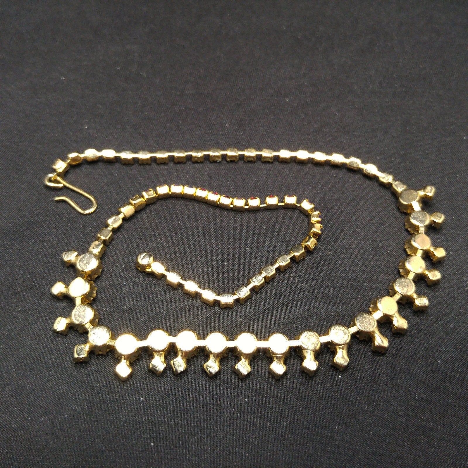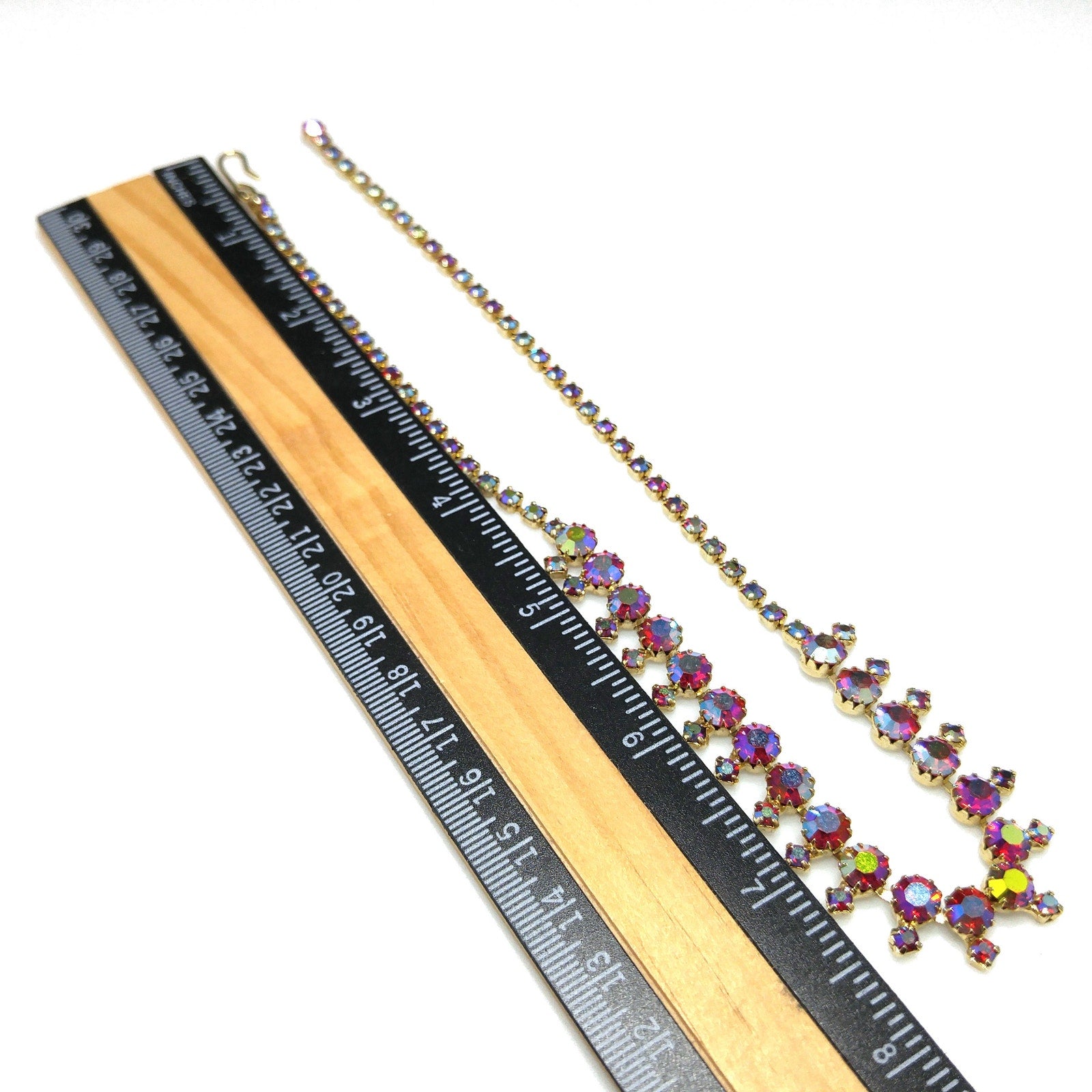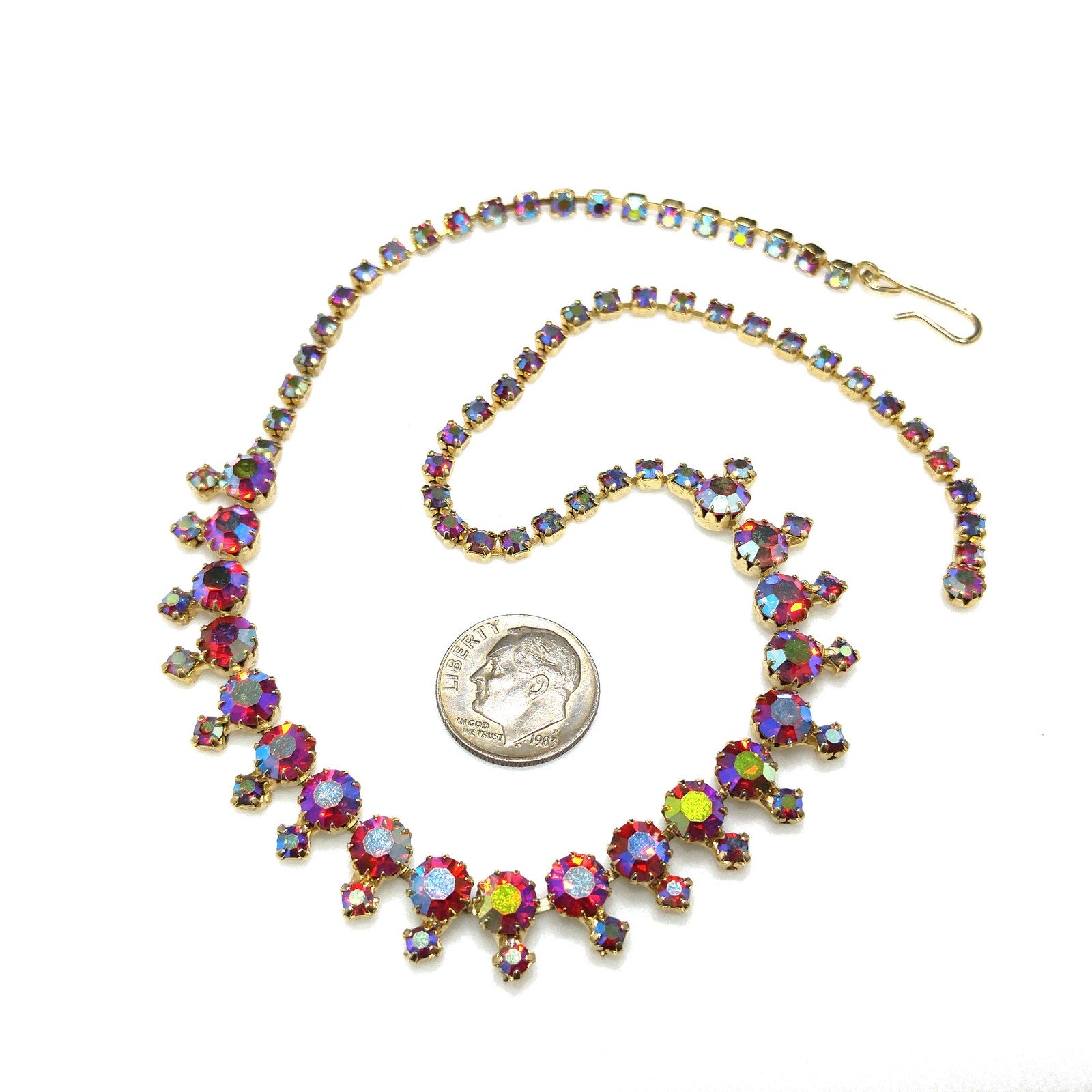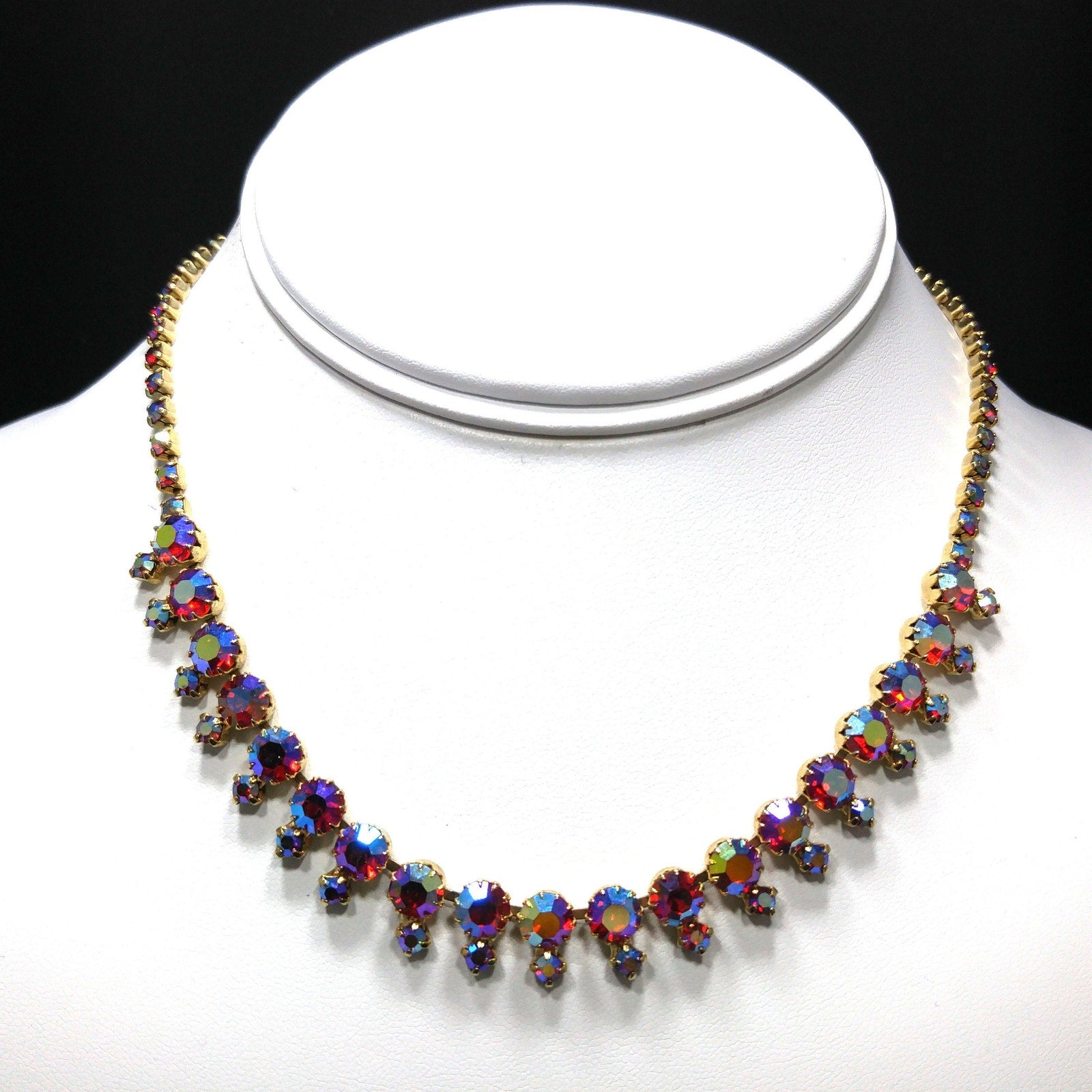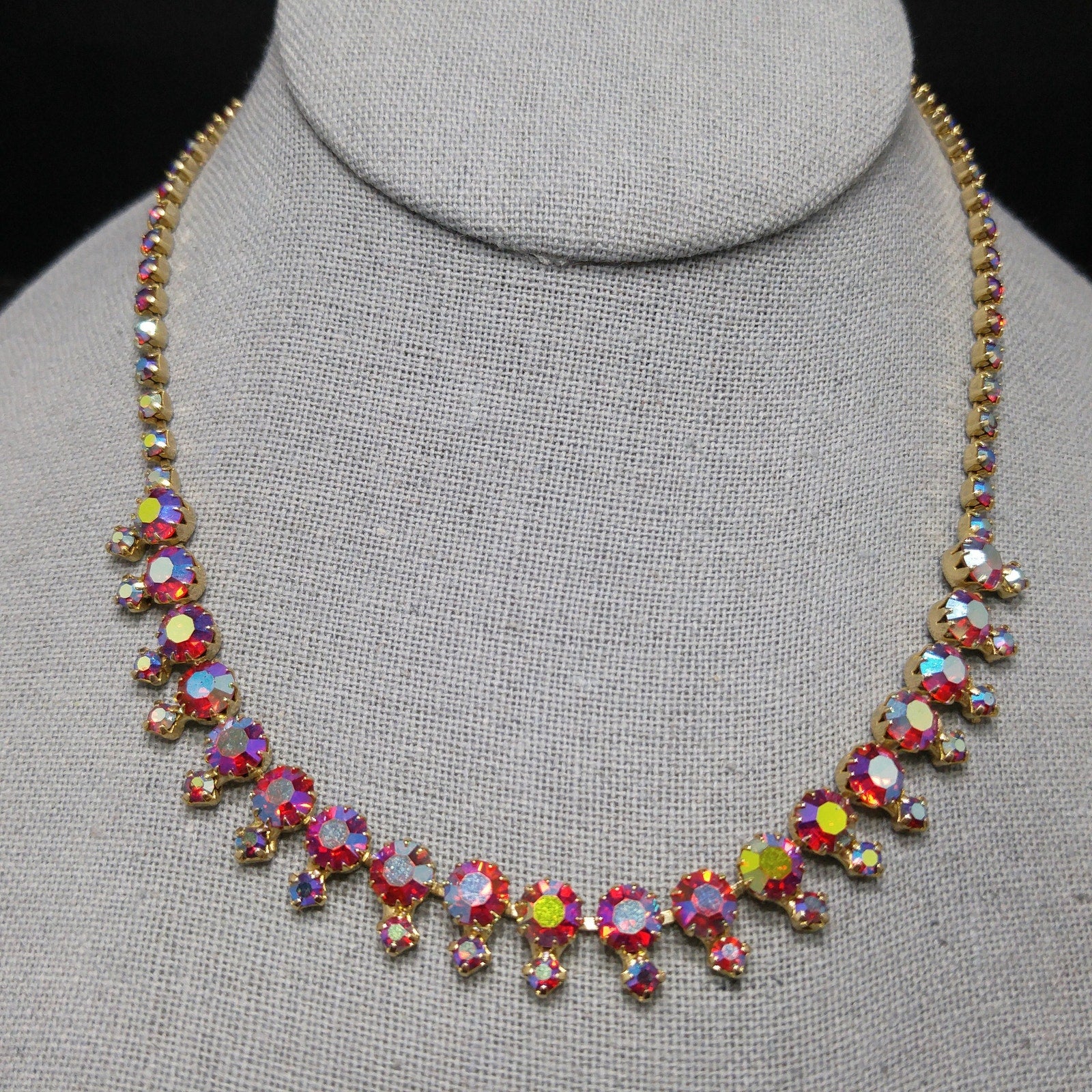 *Description: This is a beautiful aurora borealis red rhinestone choker necklace with larger red aurora borealis rhinestones and smaller rhinestones which are dangling below the chain, from the 1960s. The larger rhinestones are dog-toothed prong set which means they have more prongs to hold them in place than the average four. This is a gorgeous necklace that would look lovely for any special occasion. This would be a great addition to your vintage jewelry collection or make a great vintage gift!