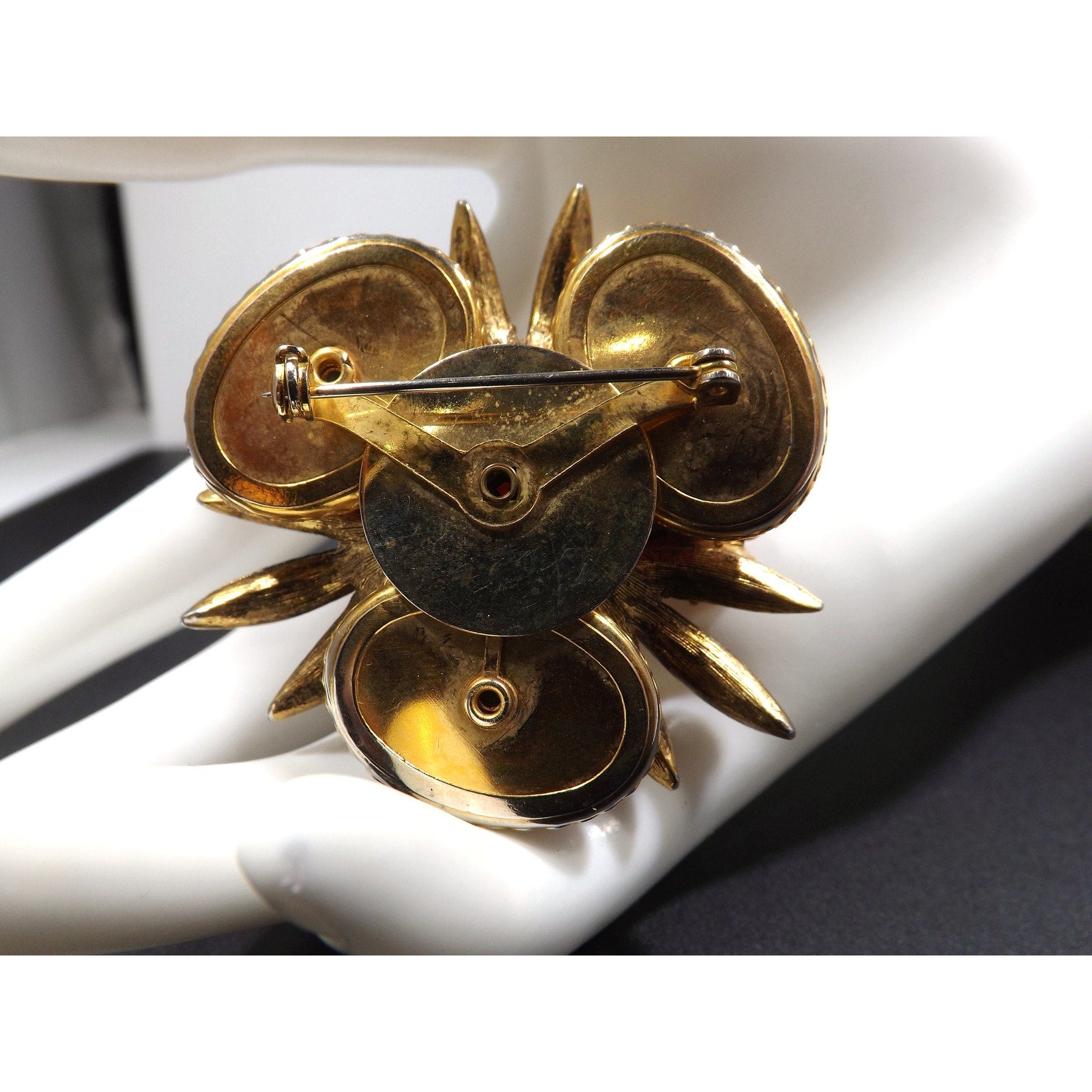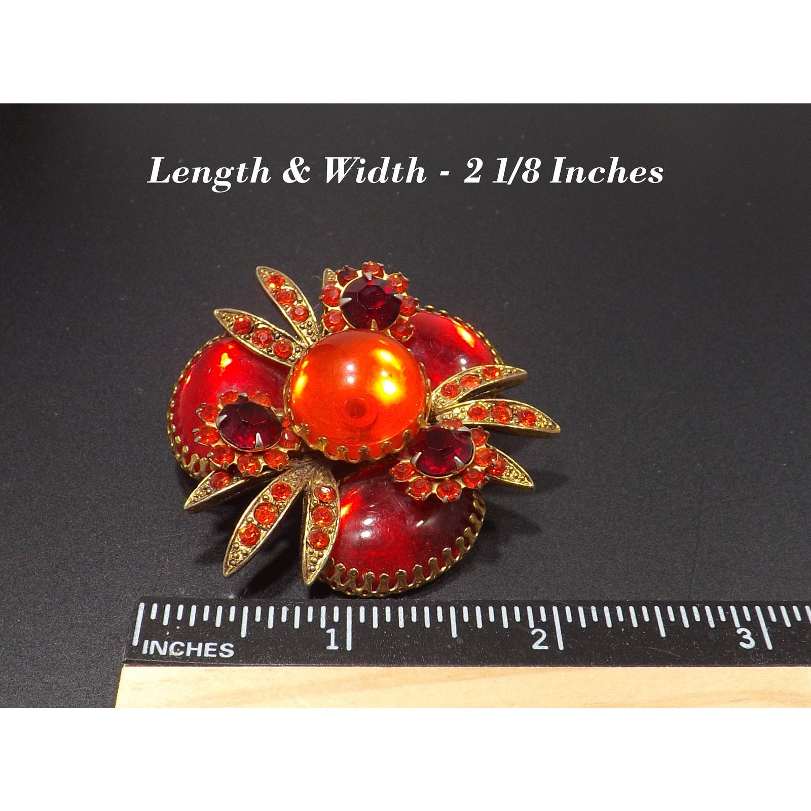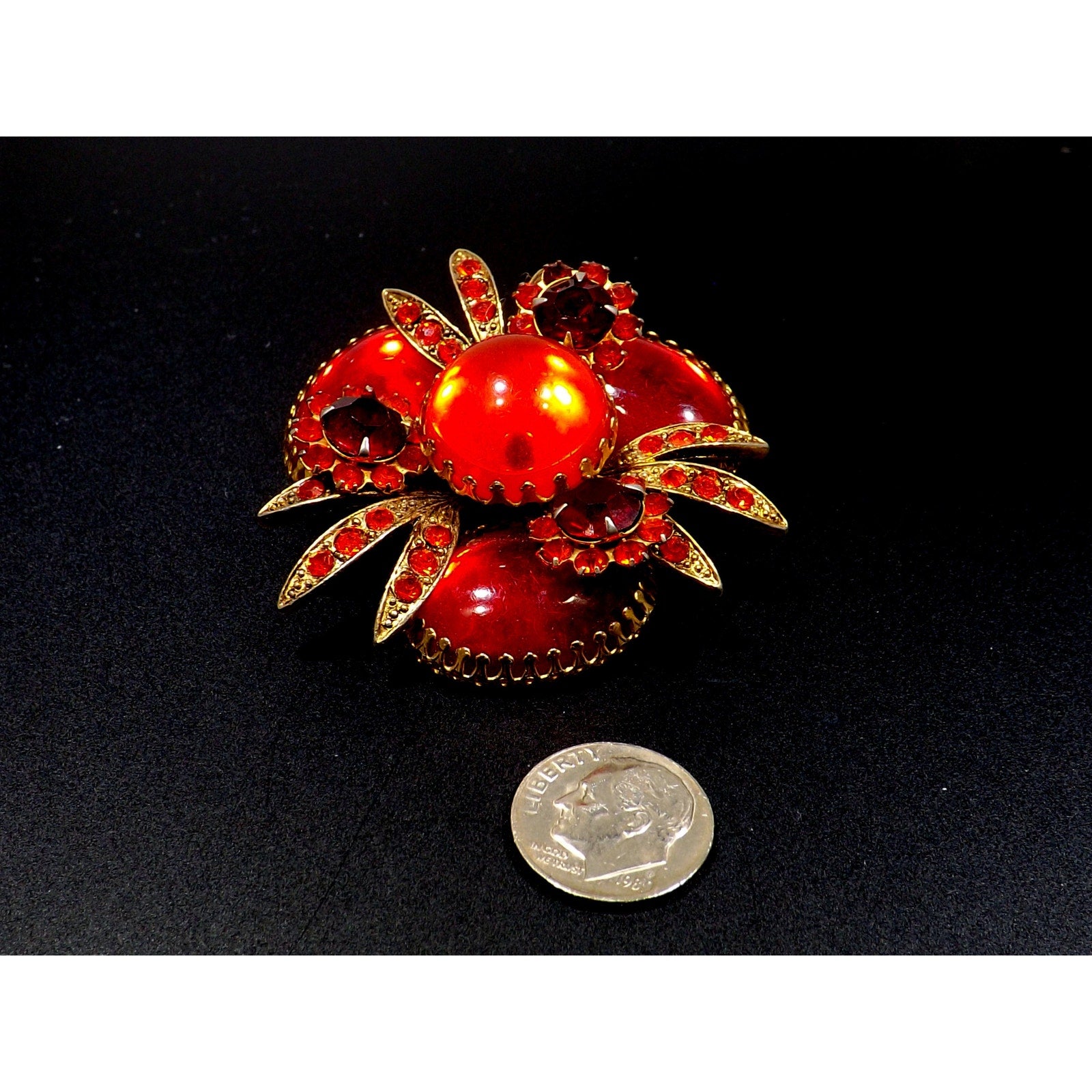 *Description: This is a gorgeous red rhinestone and red orange cabochon floral brooch from the 1960s. The brooch is an unsigned designer brooch which is apparent by the details within the design. Each of the cabochons are dog-toothed prong set and a clear orange Lucite. There are orange rhinestones on the petals and three orange rhinestone flower with red rhinestone centers. This would be a great addition to your vintage jewelry collection or make a great vintage gift!