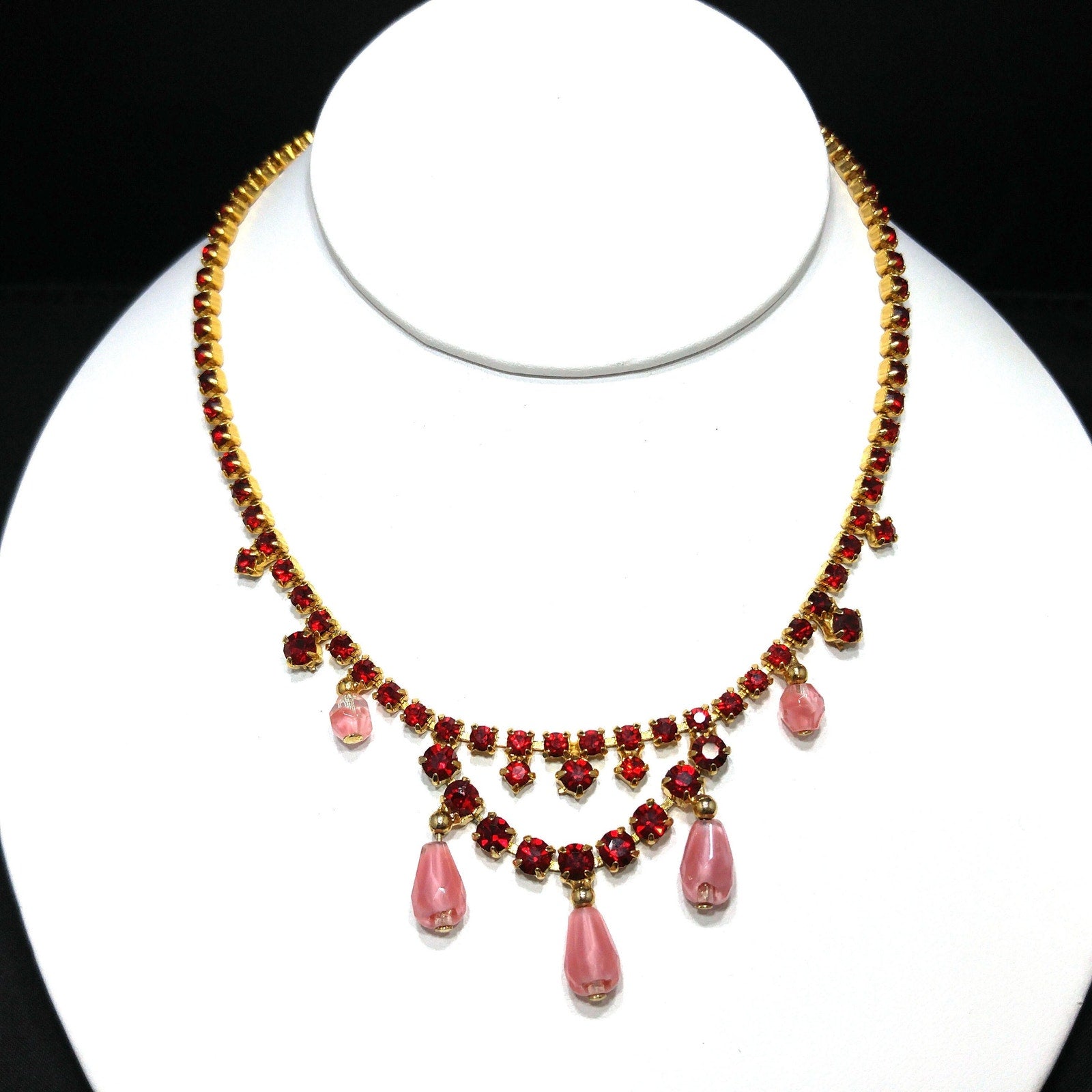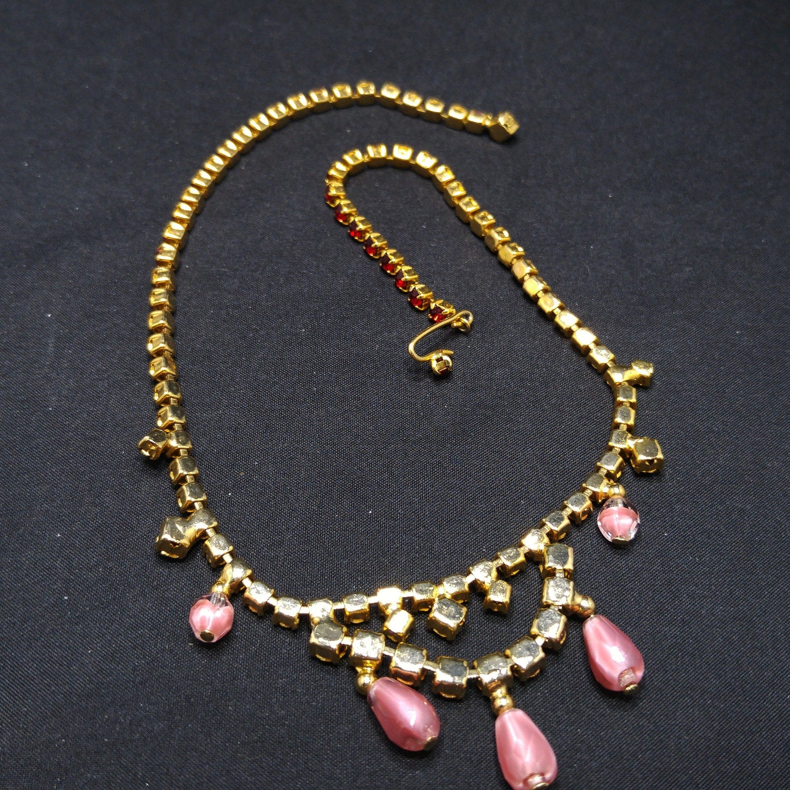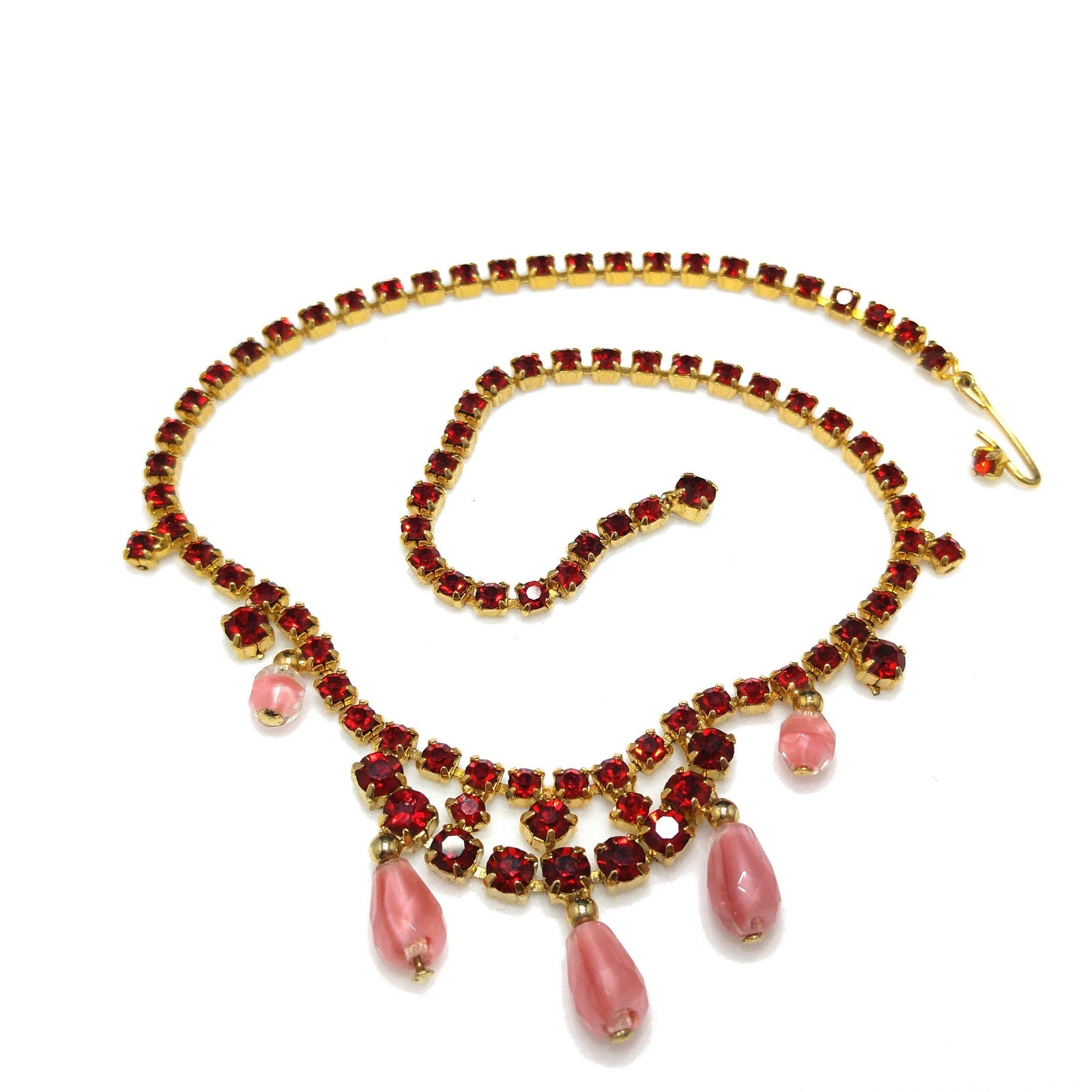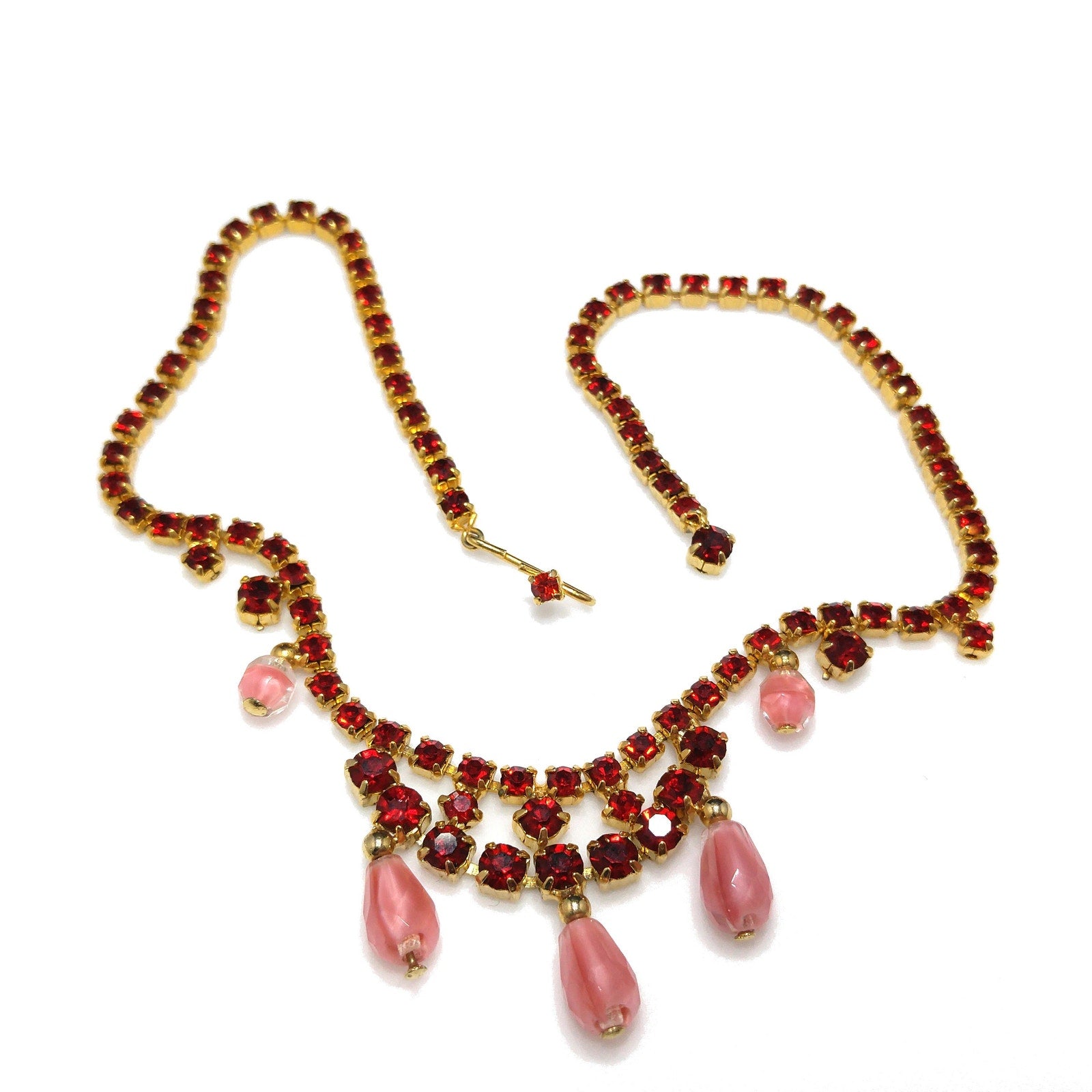 *Description: This is a beautiful mid-century red rhinestone choker necklace with clear & pink dangling beads from the 1950s. The necklace is gold plated and has a hook and extension chain so the necklace may be worn up to 15 inches. This would be a beautiful necklace to wear to any special occasion. This would be a great addition to your vintage jewelry collection or make a great vintage gift!