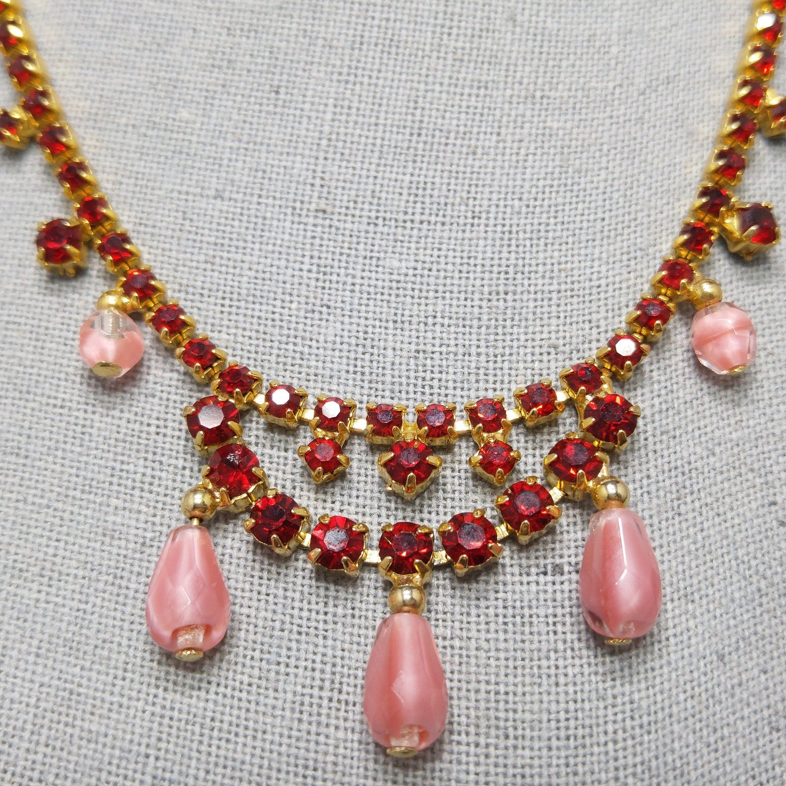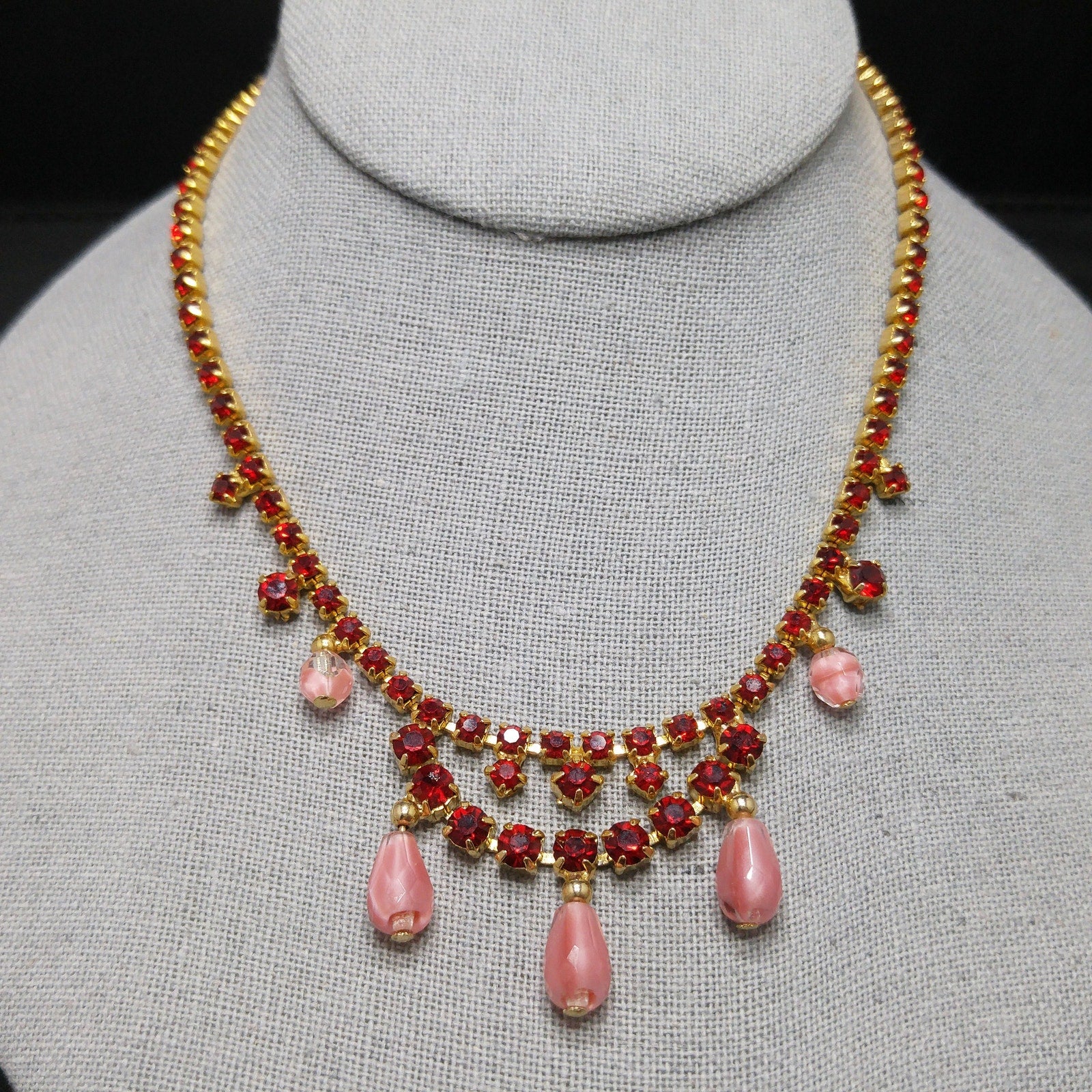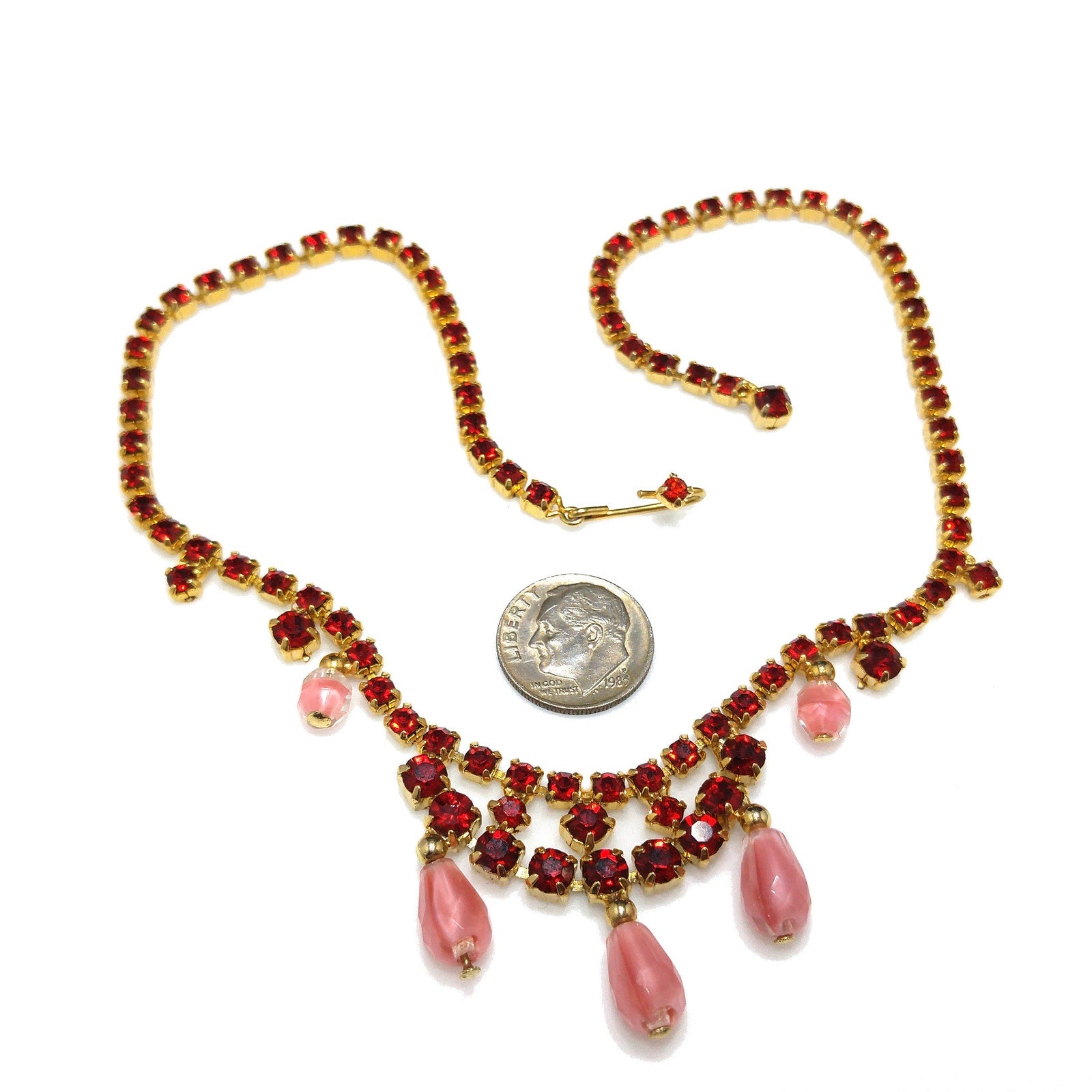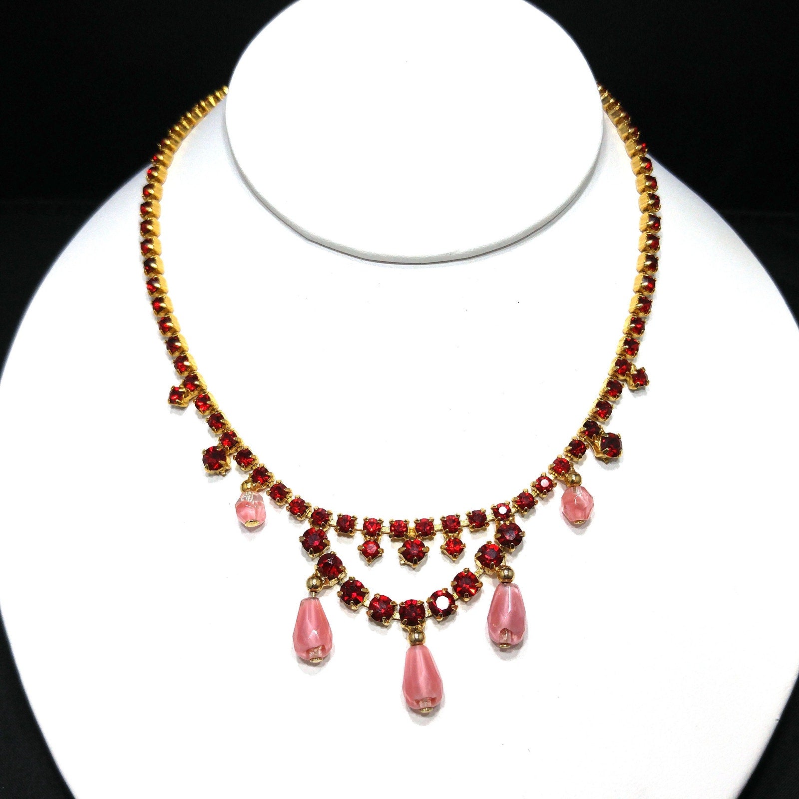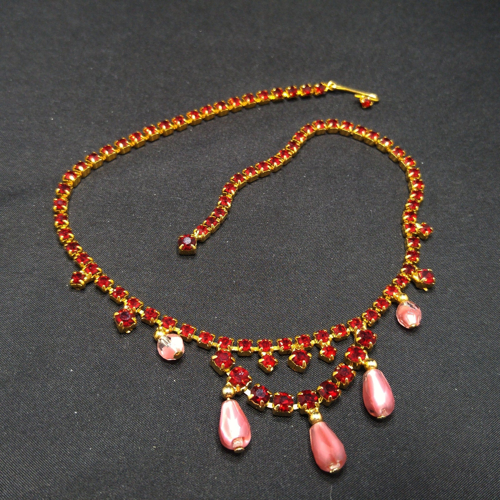*Description: This is a beautiful mid-century red rhinestone choker necklace with clear & pink dangling beads from the 1950s. The necklace is gold plated and has a hook and extension chain so the necklace may be worn up to 15 inches. This would be a beautiful necklace to wear to any special occasion. This would be a great addition to your vintage jewelry collection or make a great vintage gift!