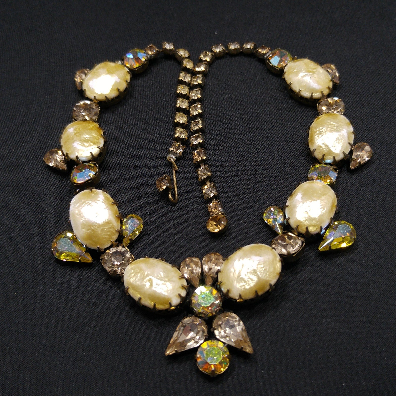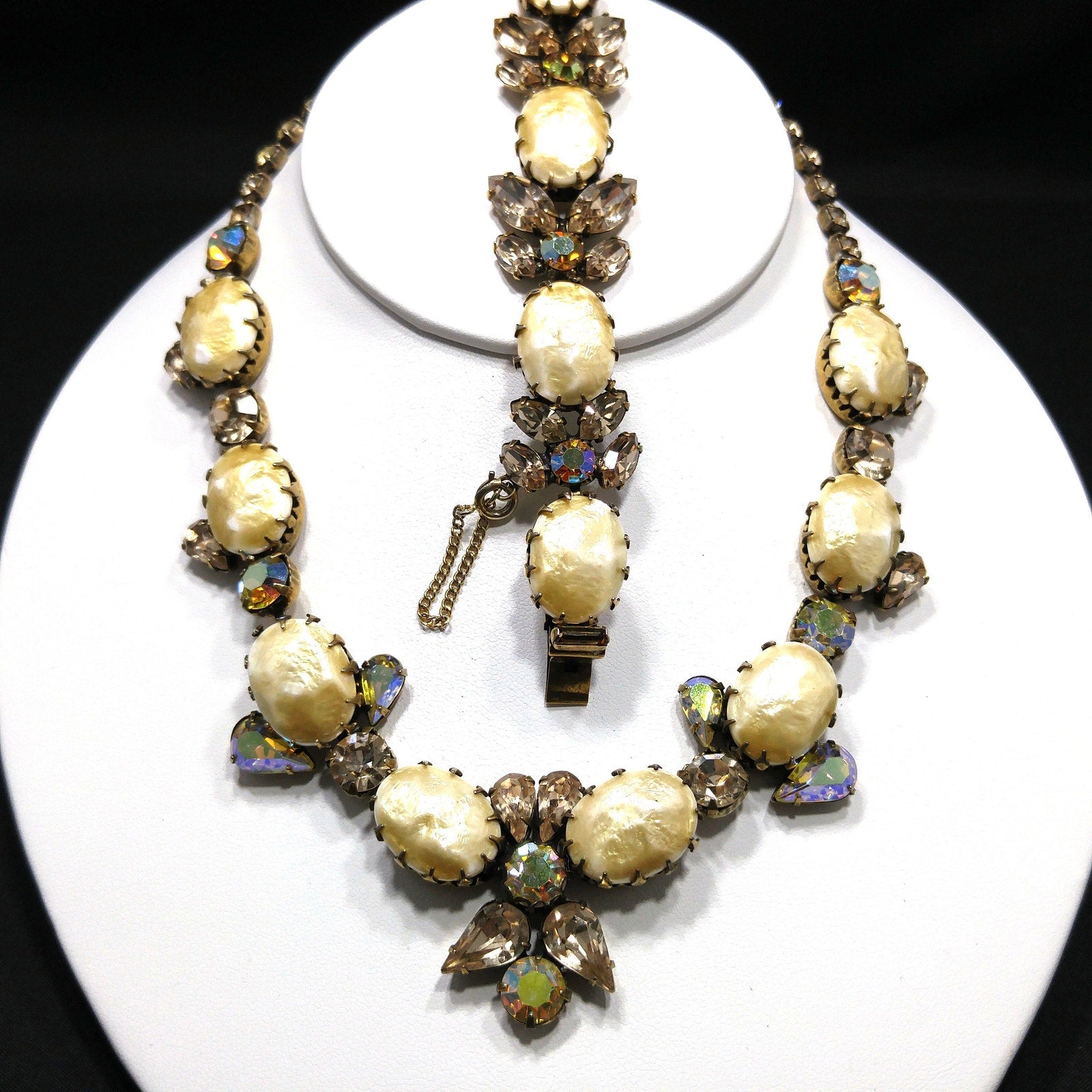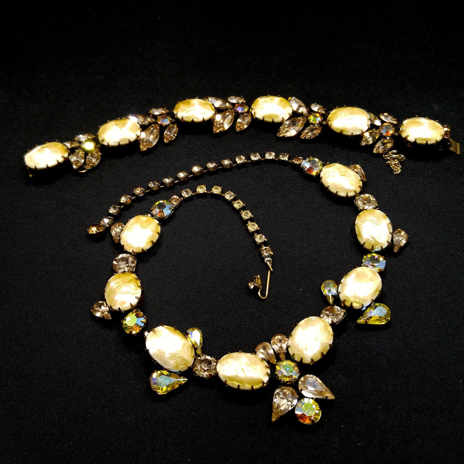 Regency Baroque Pearl Necklace Bracelet Set, Light Topaz AB Rhinestones, 1950s Vintage Jewelry
