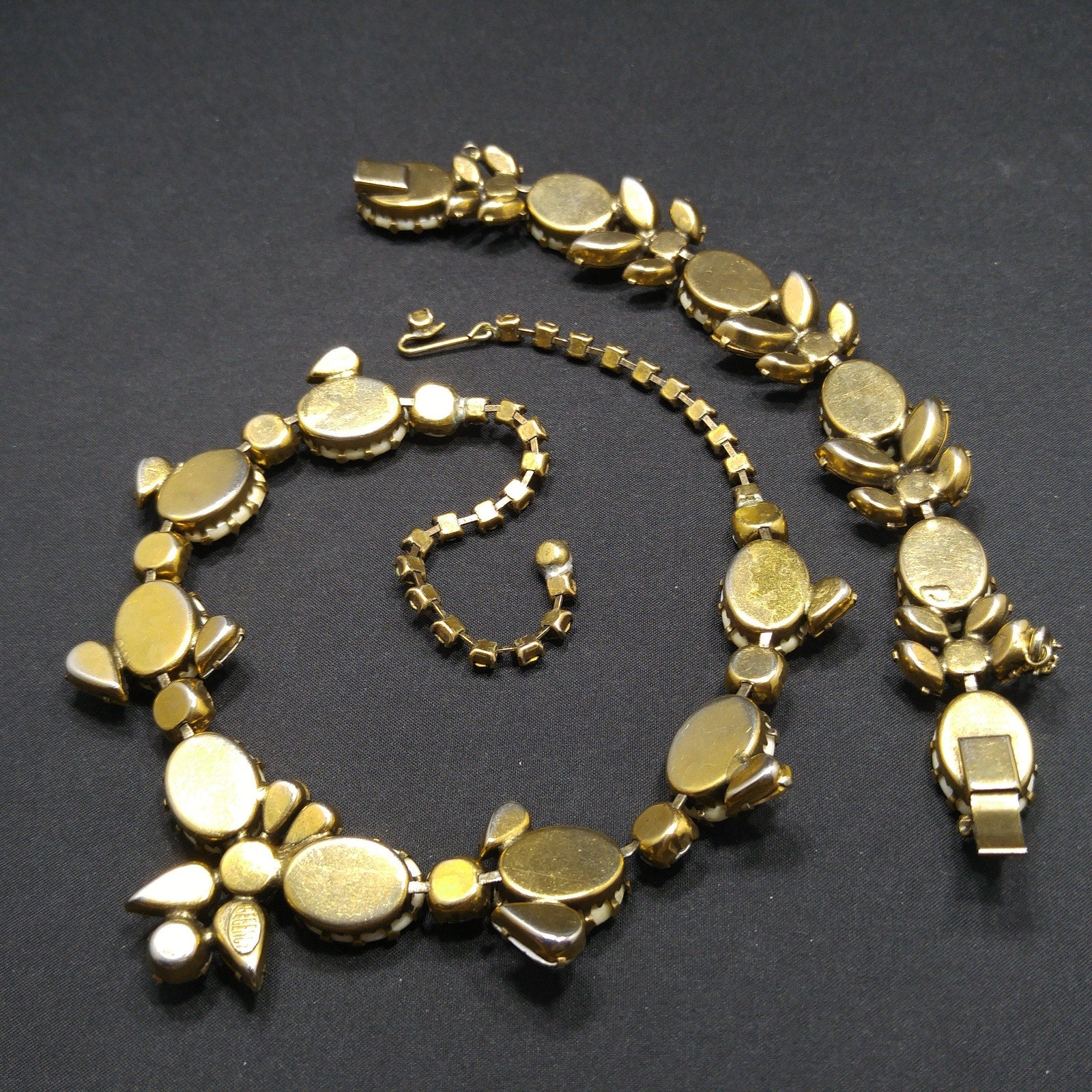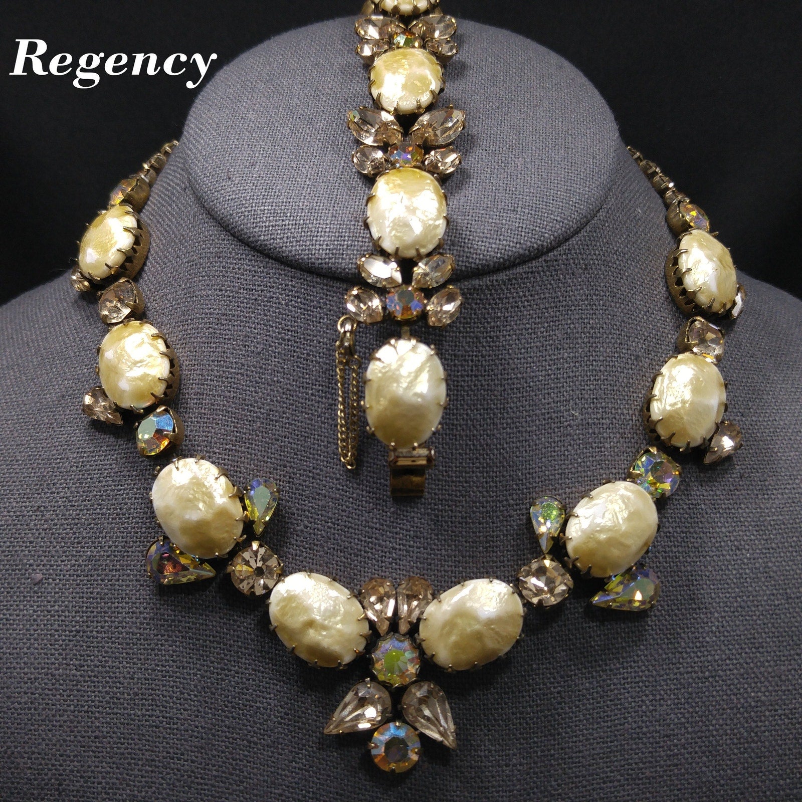 *Description: This is a gorgeous REGENCY demi-parure with the faux baroque pearls and citrine marquise rhinestones, accented with aurora borealis chatons from the 1950s. Regency is known for its use of amazingly beautiful stones and artistic design. The necklace and bracelet are in great vintage condition. The rhinestones are exquisite; full of color and light. There is a safety chain and the bracelet clasp has a rhinestone on top. The necklace is stamped REGENCY on a raised oval cartouche. The matching bracelet is unsigned. This would be a great addition to your vintage jewelry collection or make a great vintage gift!