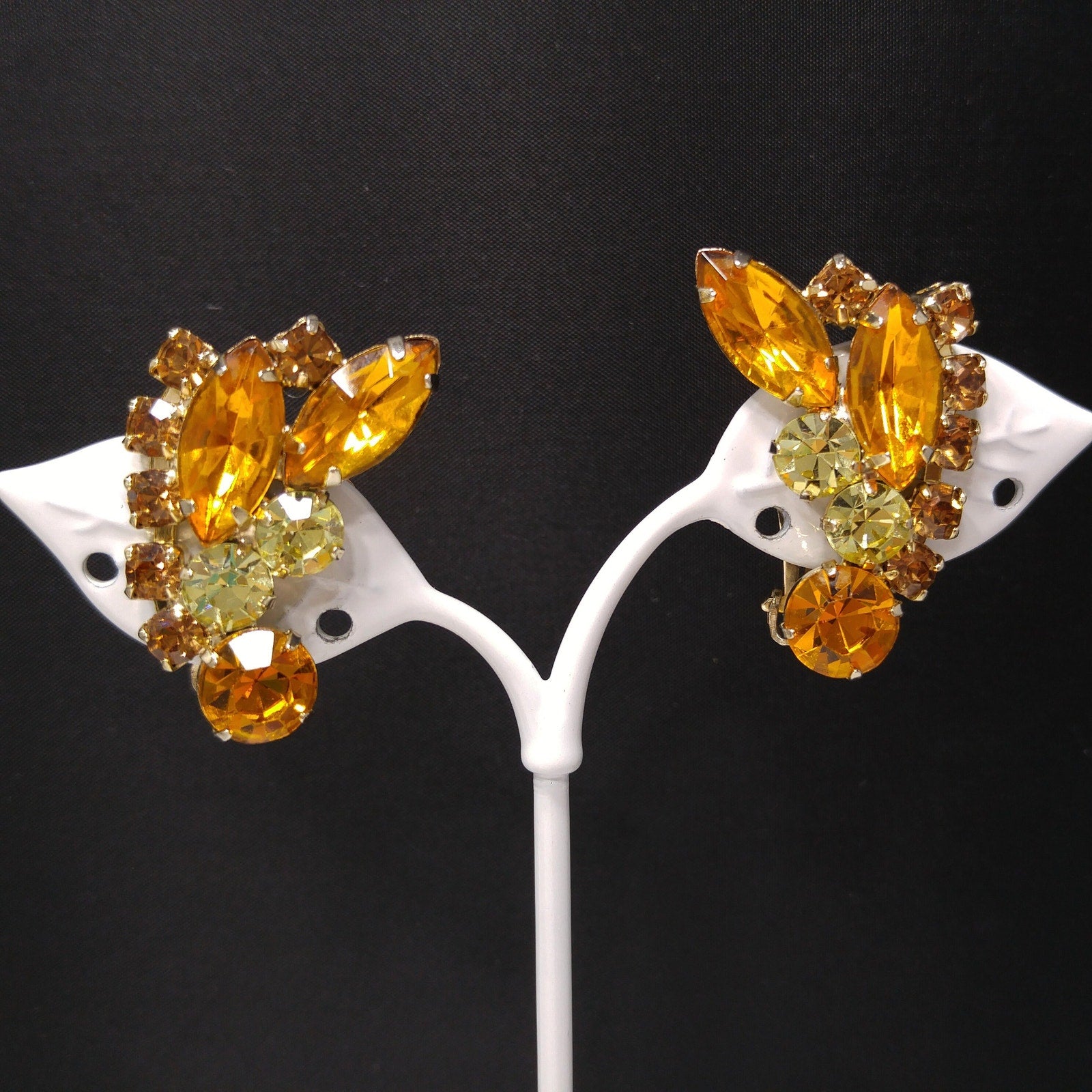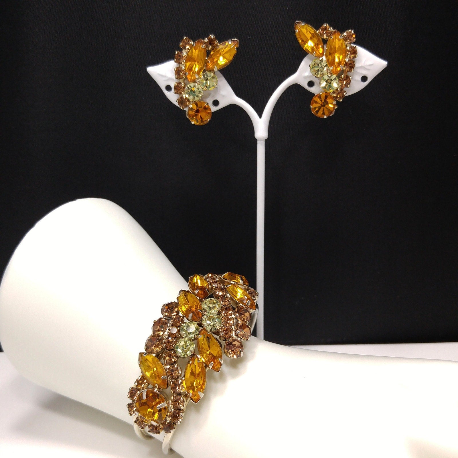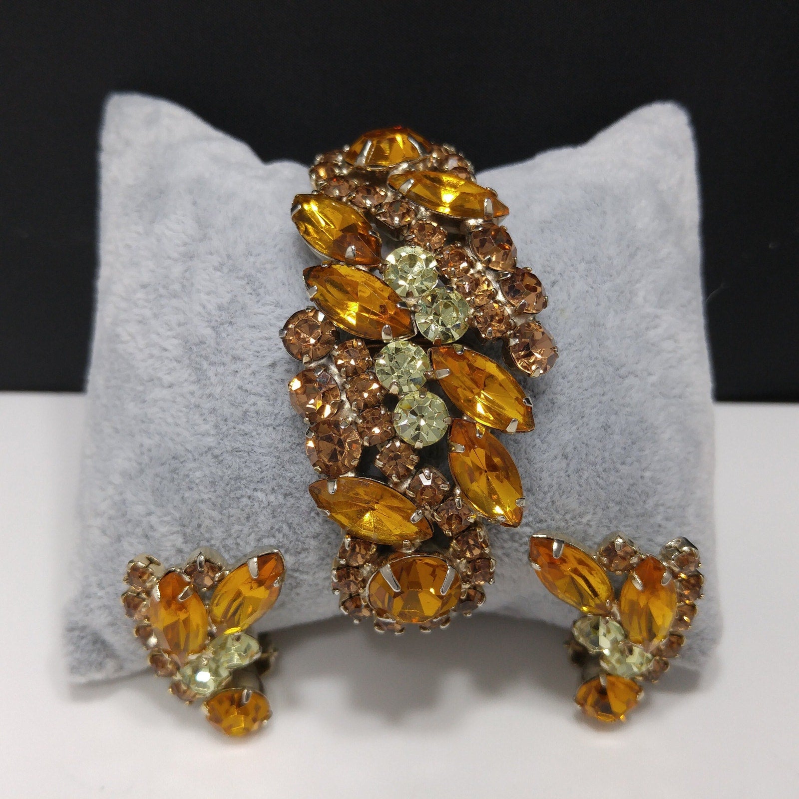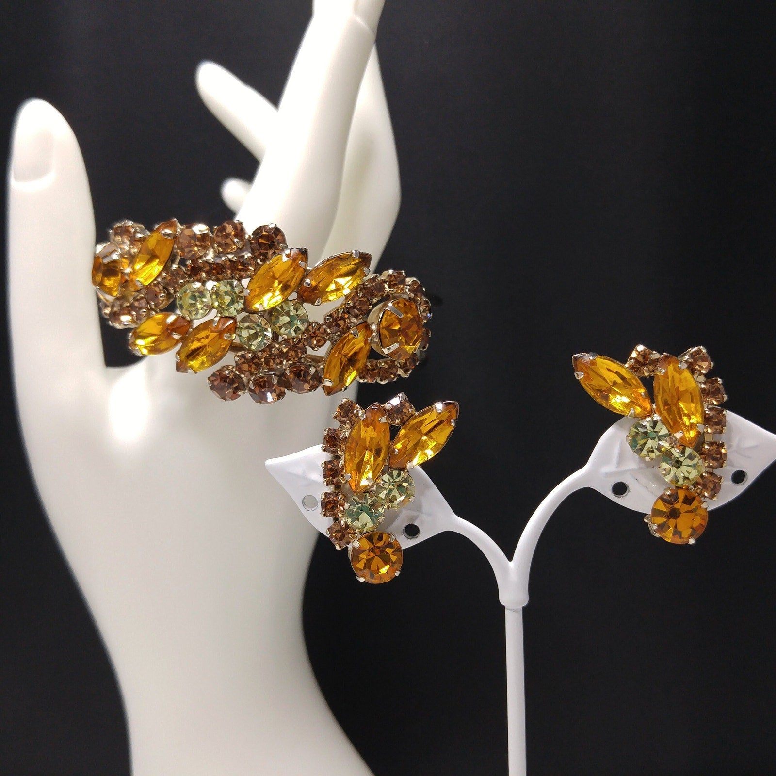 *Description: This is a gorgeous light and dark topaz & jonquil rhinestone hinged bracelet and matching earrings from the 1960s. This jewelry is designed in the Julianna style with hinged rhinestone bracelet and clip earrings. The back of the bracelet and earrings, behind the rhinestones, are gold plated. The set is not signed but is obviously a designer set due to the style and quality settings. This would be a great addition to your vintage jewelry collection or make a great vintage gift!