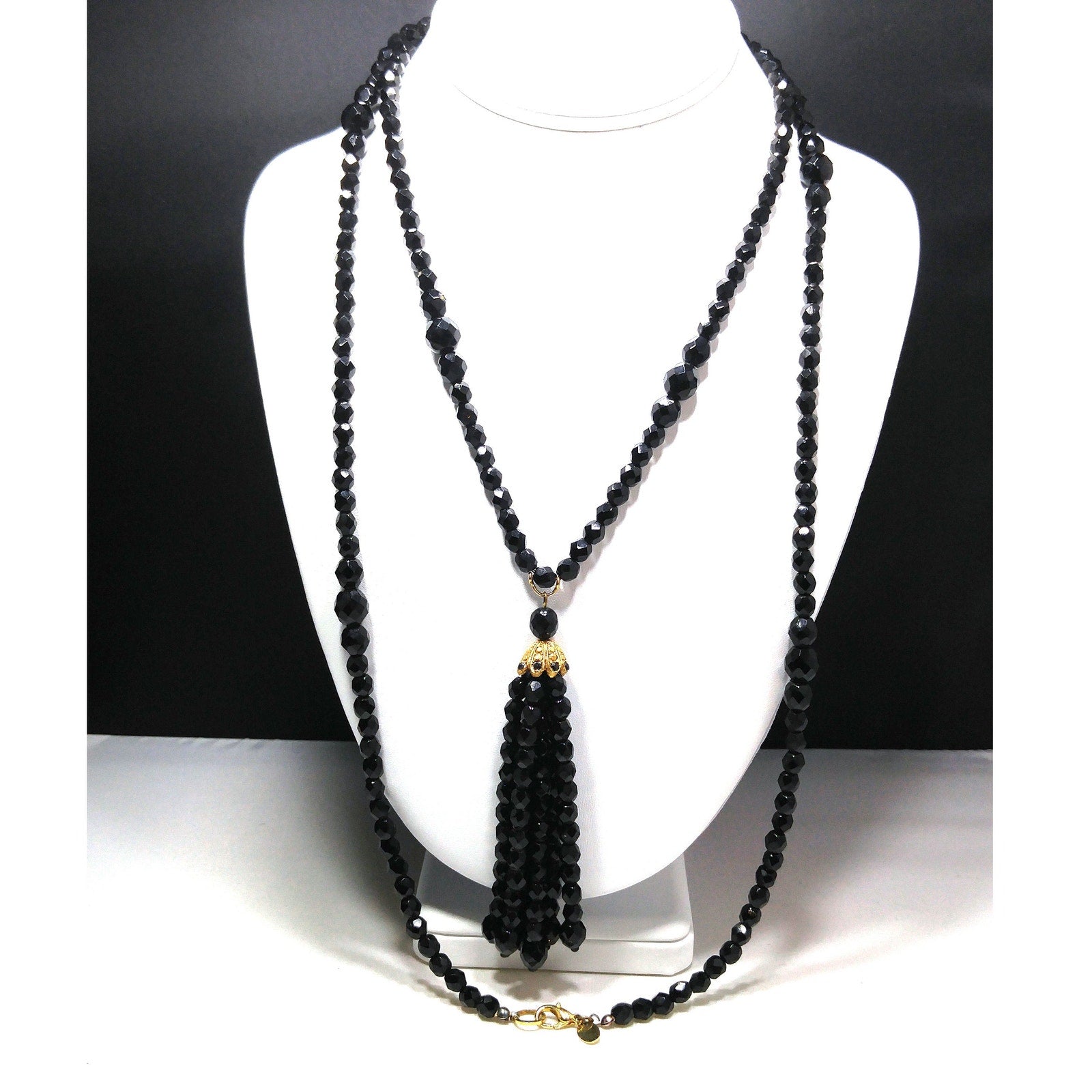 Robert Rose Black Crystal Beaded Tassel Necklace, 50 Inch, 1990s Vintage