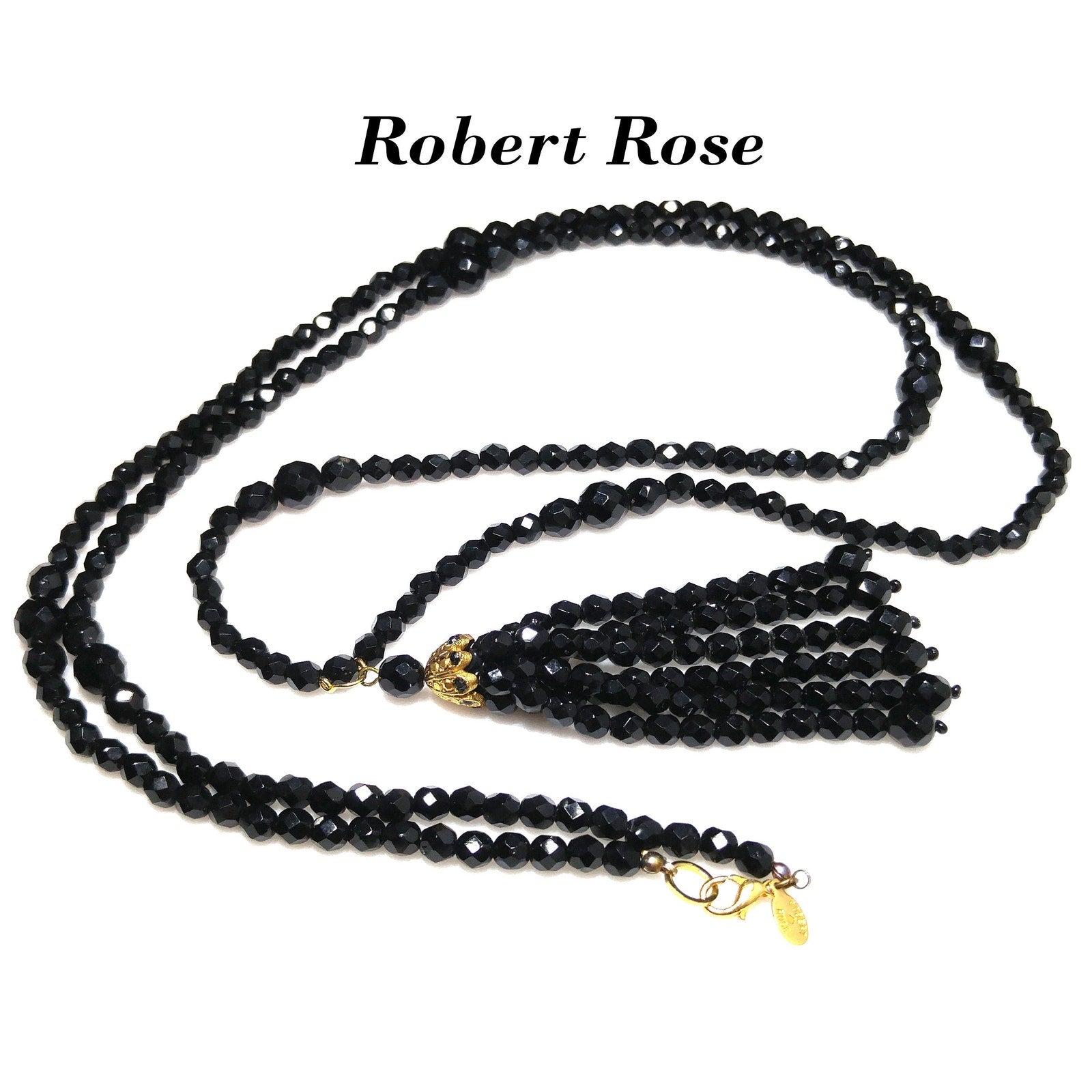 This striking vintage Robert Rose necklace from the 1990s features glossy black crystal beads and a dramatic 4-inch tassel pendant. The tassel is finished with a scalloped gold-tone bead cap accented with tiny black rhinestones, adding just the right touch of sparkle.