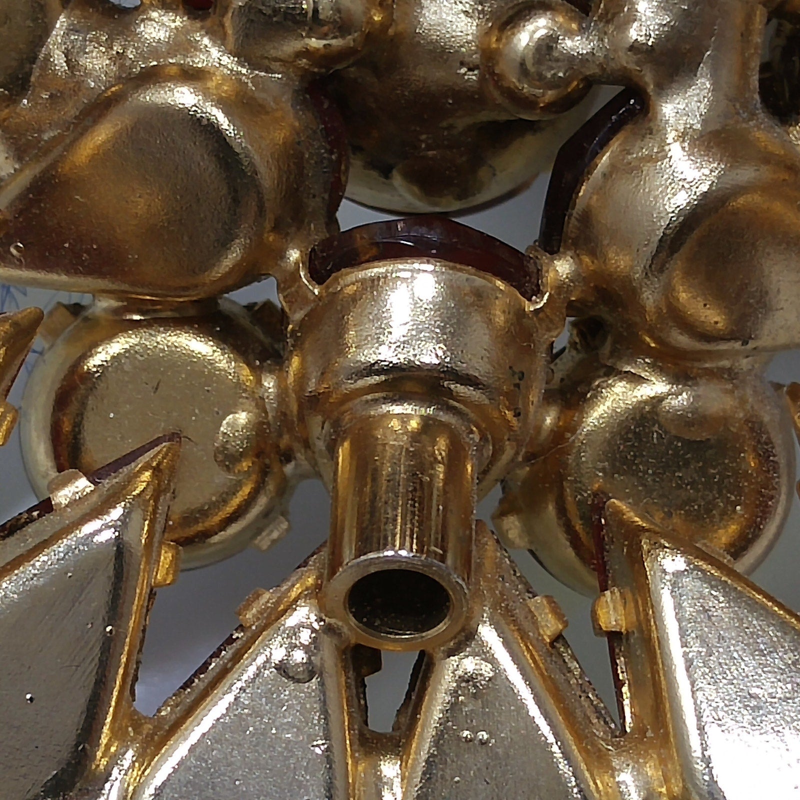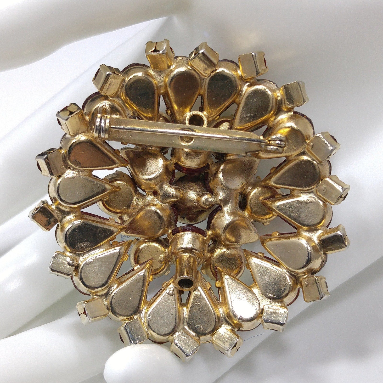 *Description: This is a gorgeous red multi-layered rhinestone brooch with gold plated backing from the 1960s. The center rhinestone is red aurora borealis and prong set. It is surrounded by a row of slightly smaller aurora borealis red rhinestone chatons which are separated by red marquise cut rhinestones. The outside and bottom row of rhinestones are tear drop cut red rhinestones with red aurora borealis smaller rhinestone chatons around the edges of the brooch. I tested the metal surface and it tested at 10K gold plate. The brooch has a very unique way of setting two main rhinestones which is apparent on the back and would signal a designer technique. This brooch is unsigned and either had a paper tag for designer identification or the matching components were signed. This is a beautiful brooch and would be a great addition to your vintage jewelry collection or make a great vintage gift!