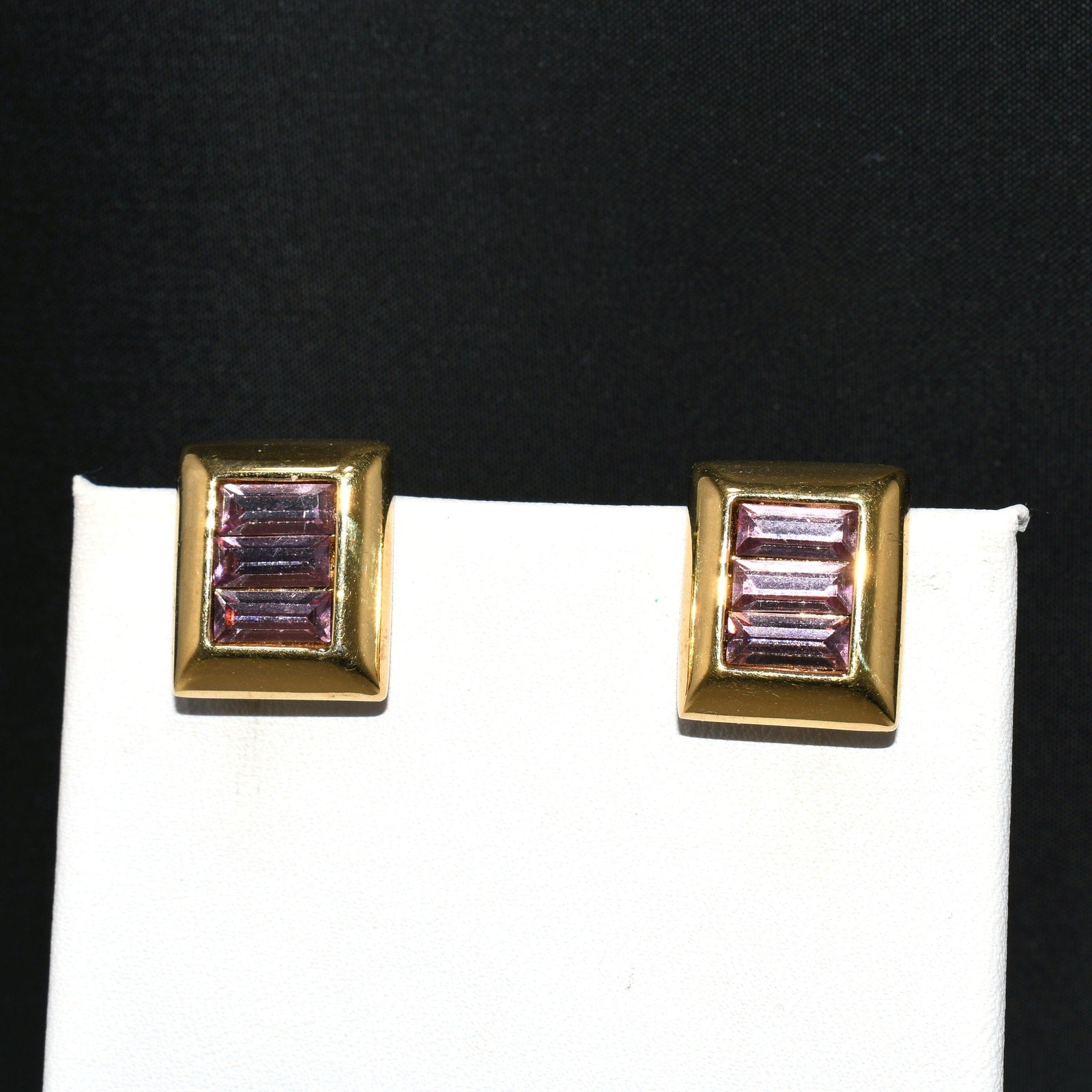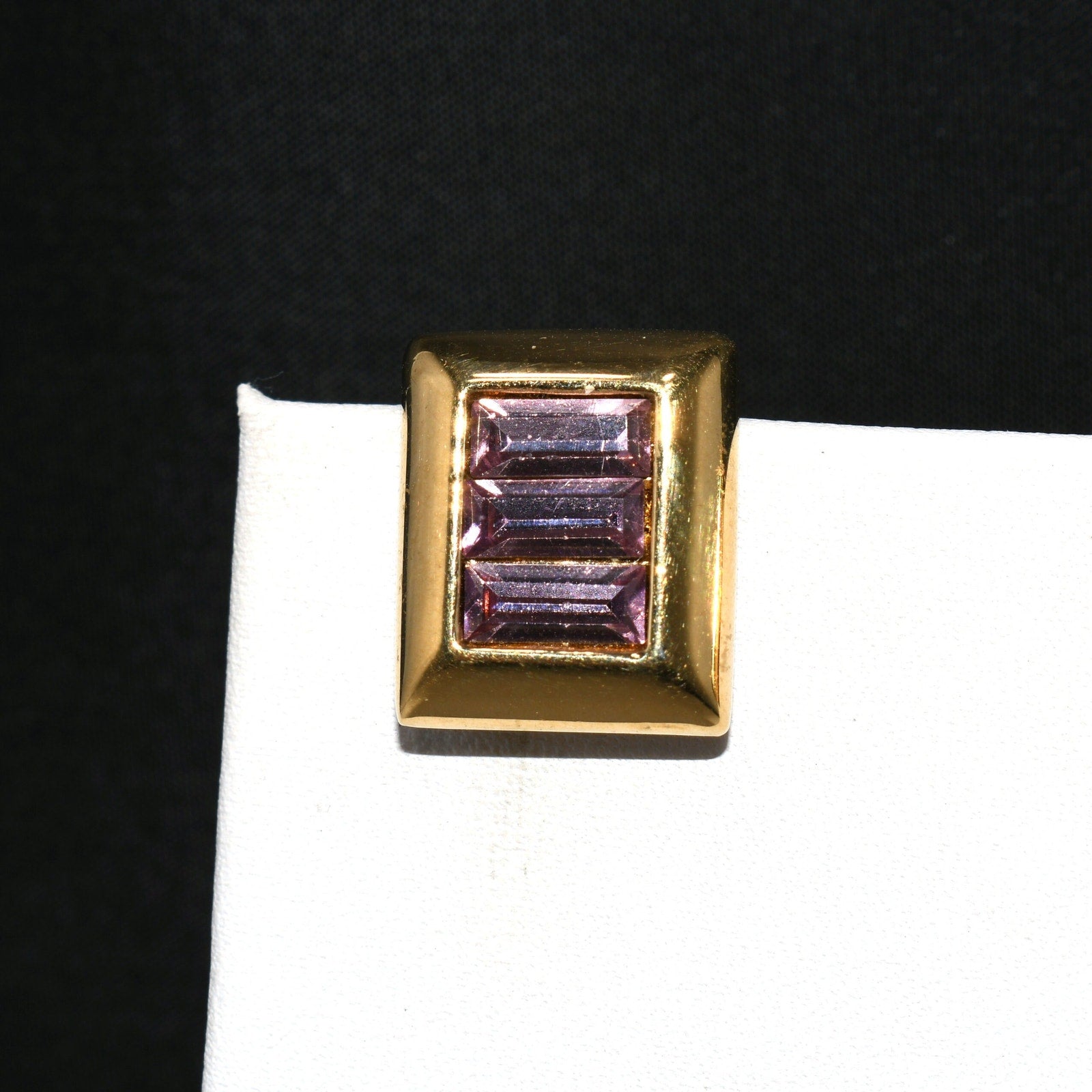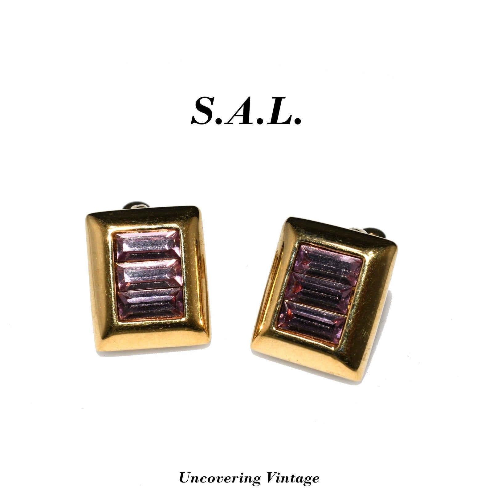 *Description: This is a beautiful pair of Swarovski earrings with three purple baguettes in each gold plated earring from the 1970s. Each earring is stamped S. A. L. which was one of the earlier Swarovski hallmarks. The rhinestones are Austrian crystal and more lavender in color. This would be a great addition to your vintage jewelry collection or make a great vintage gift!