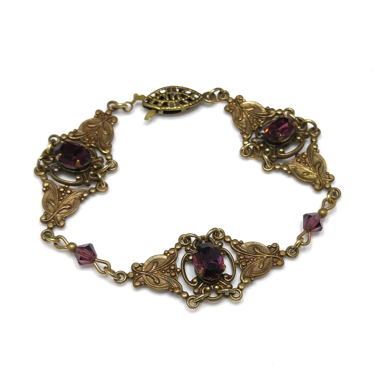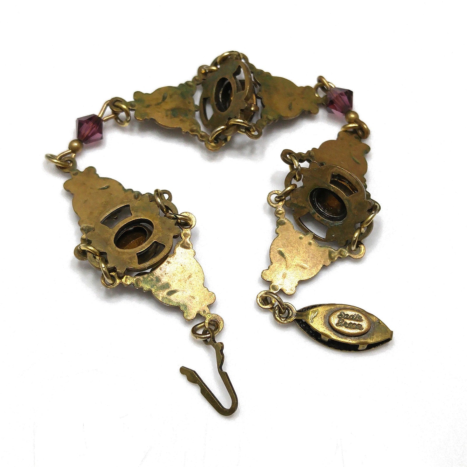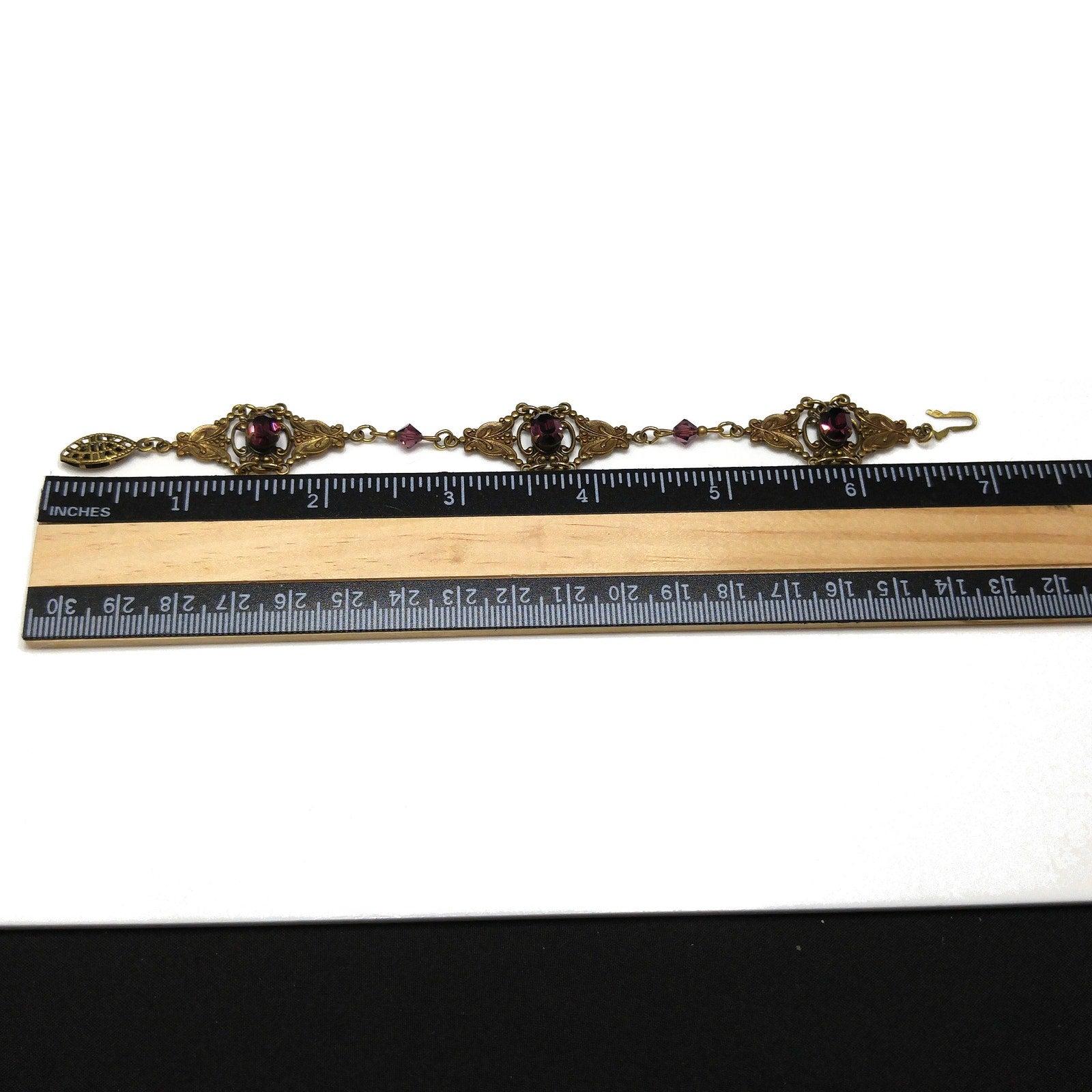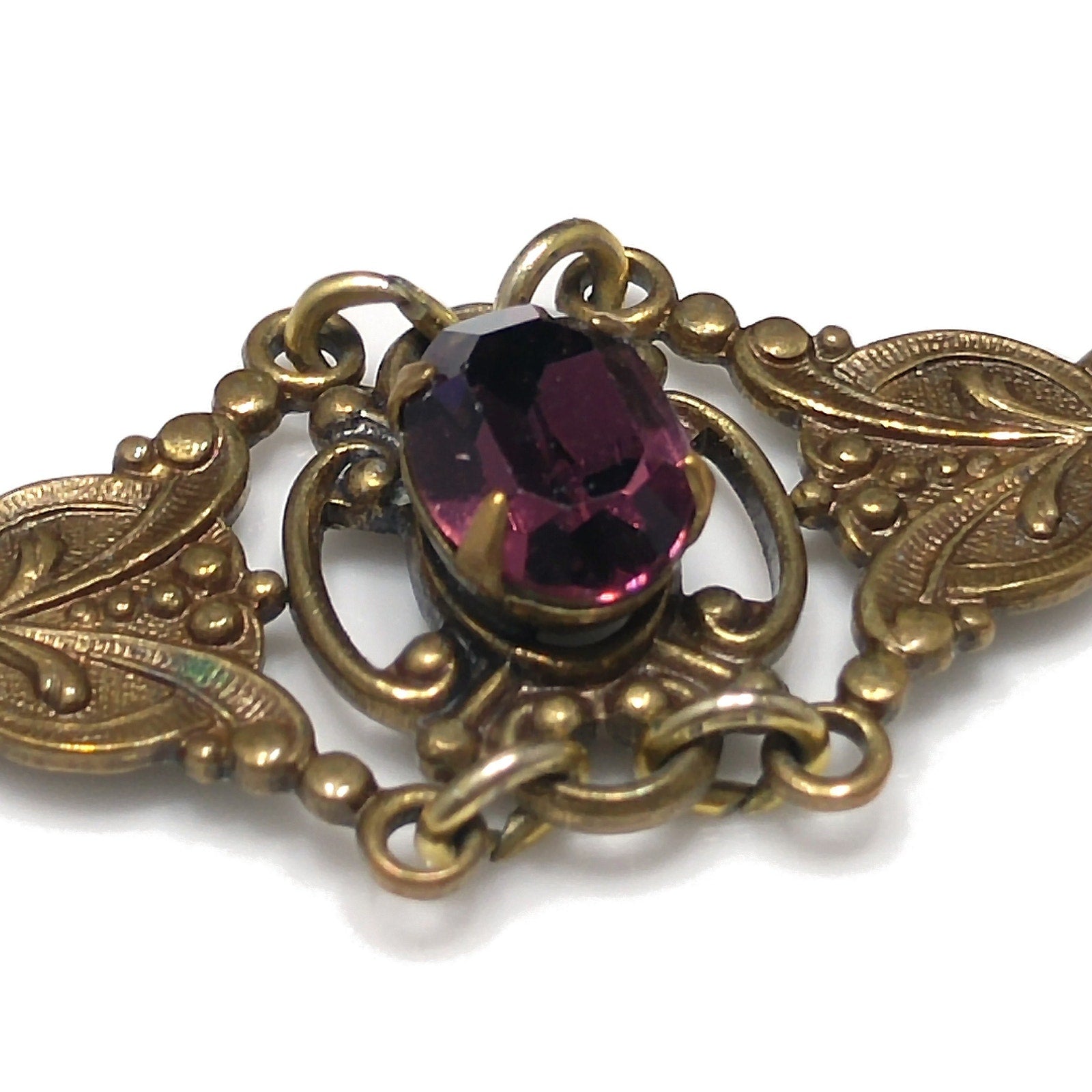 Sadie Green Art Nouveau Purple Bracelet, Golden Brass & Faux Amethyst, 6 3/4" Length, 1980s Vintage Jewelry