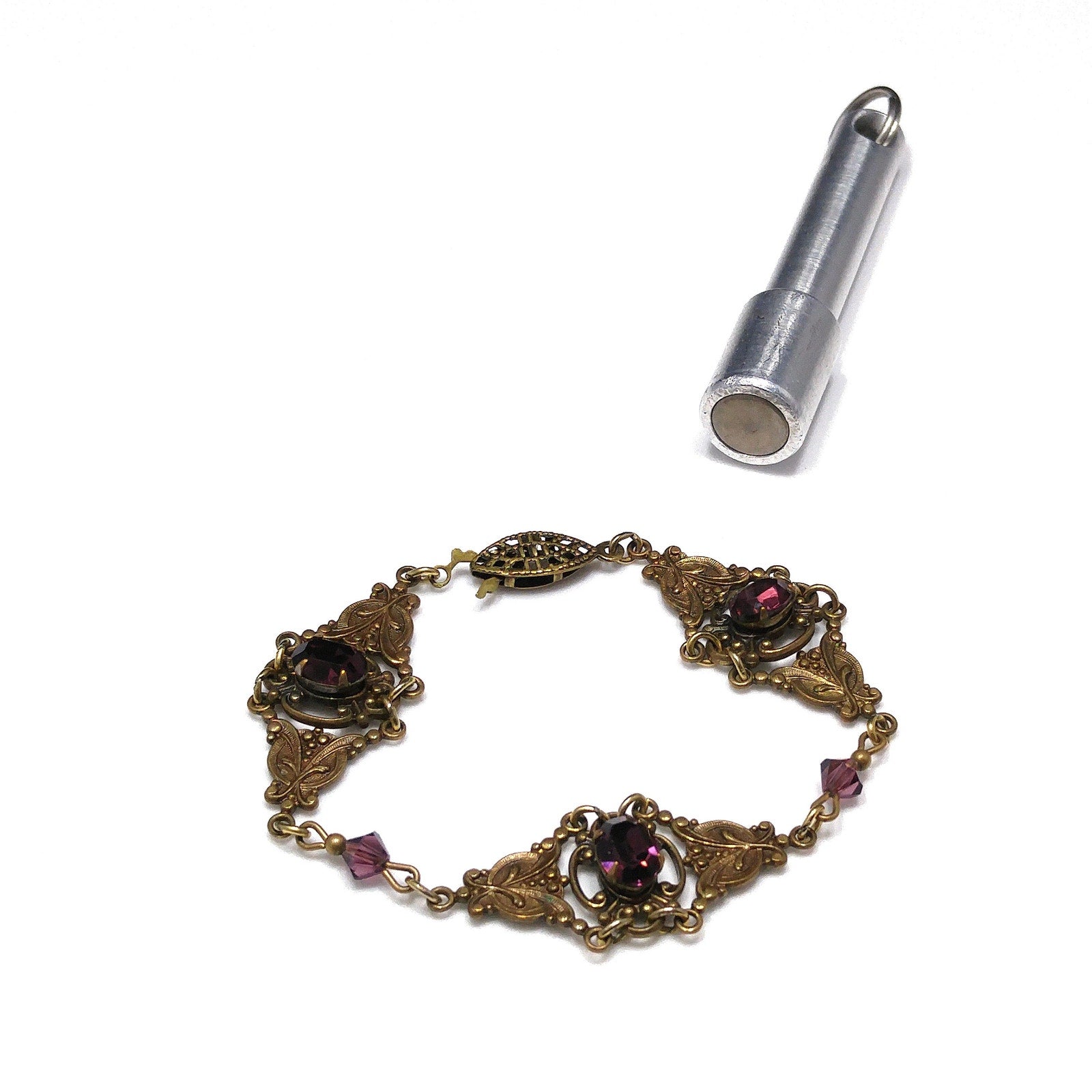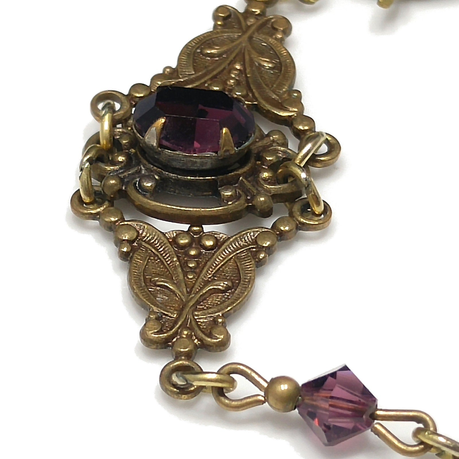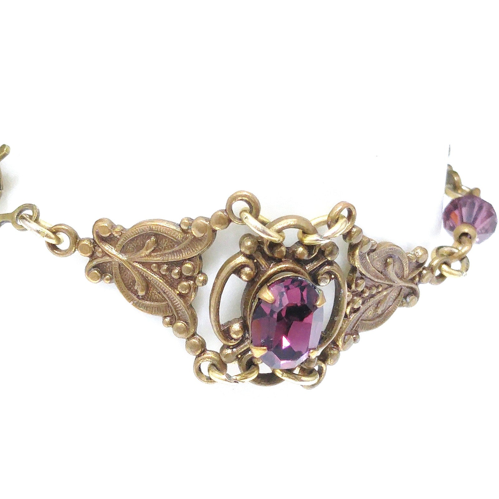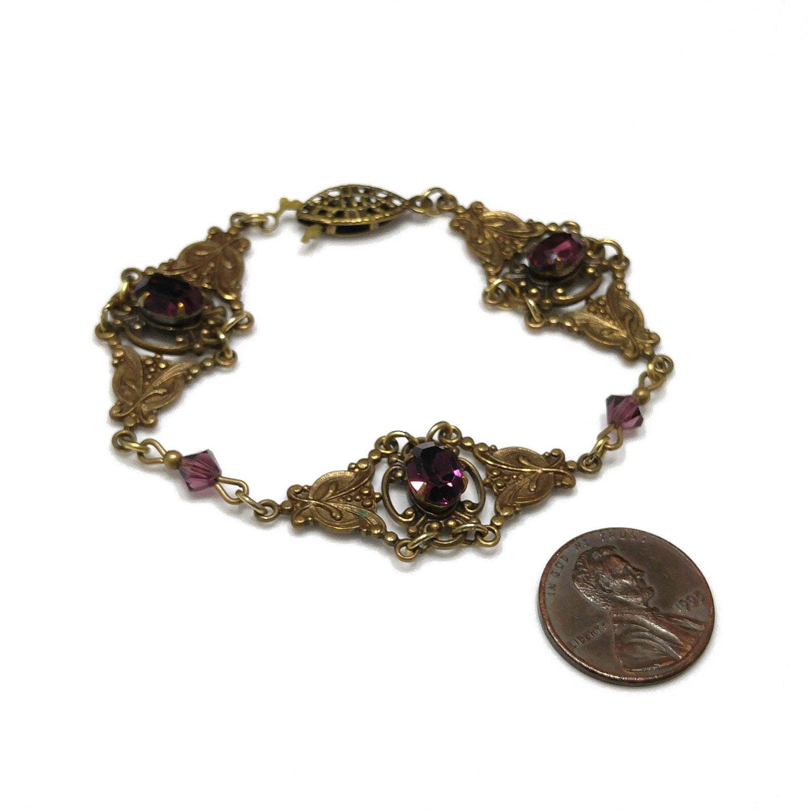 Sadie Green Art Nouveau Purple Bracelet, Golden Brass & Faux Amethyst, 6 3/4" Length, 1980s Vintage Jewelry