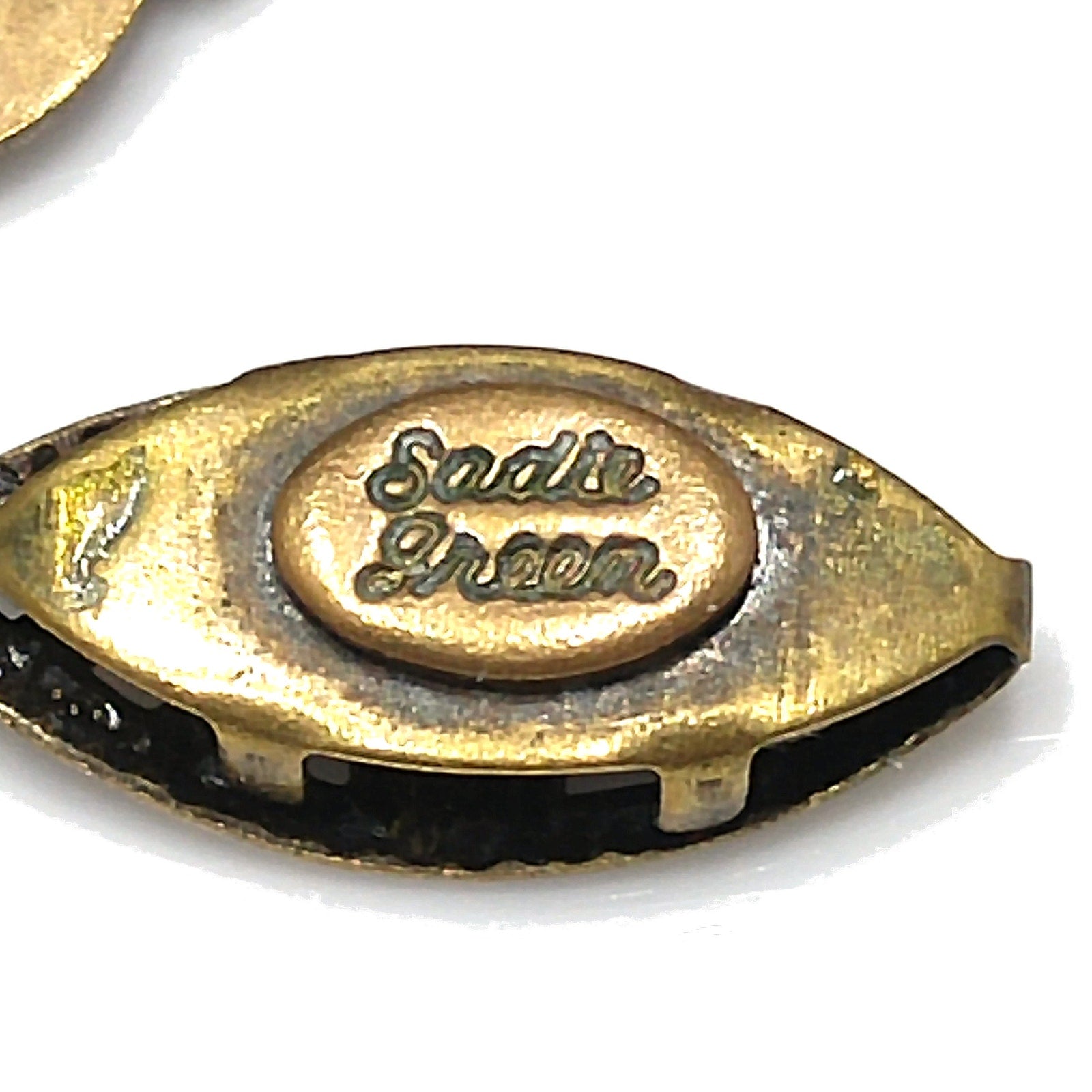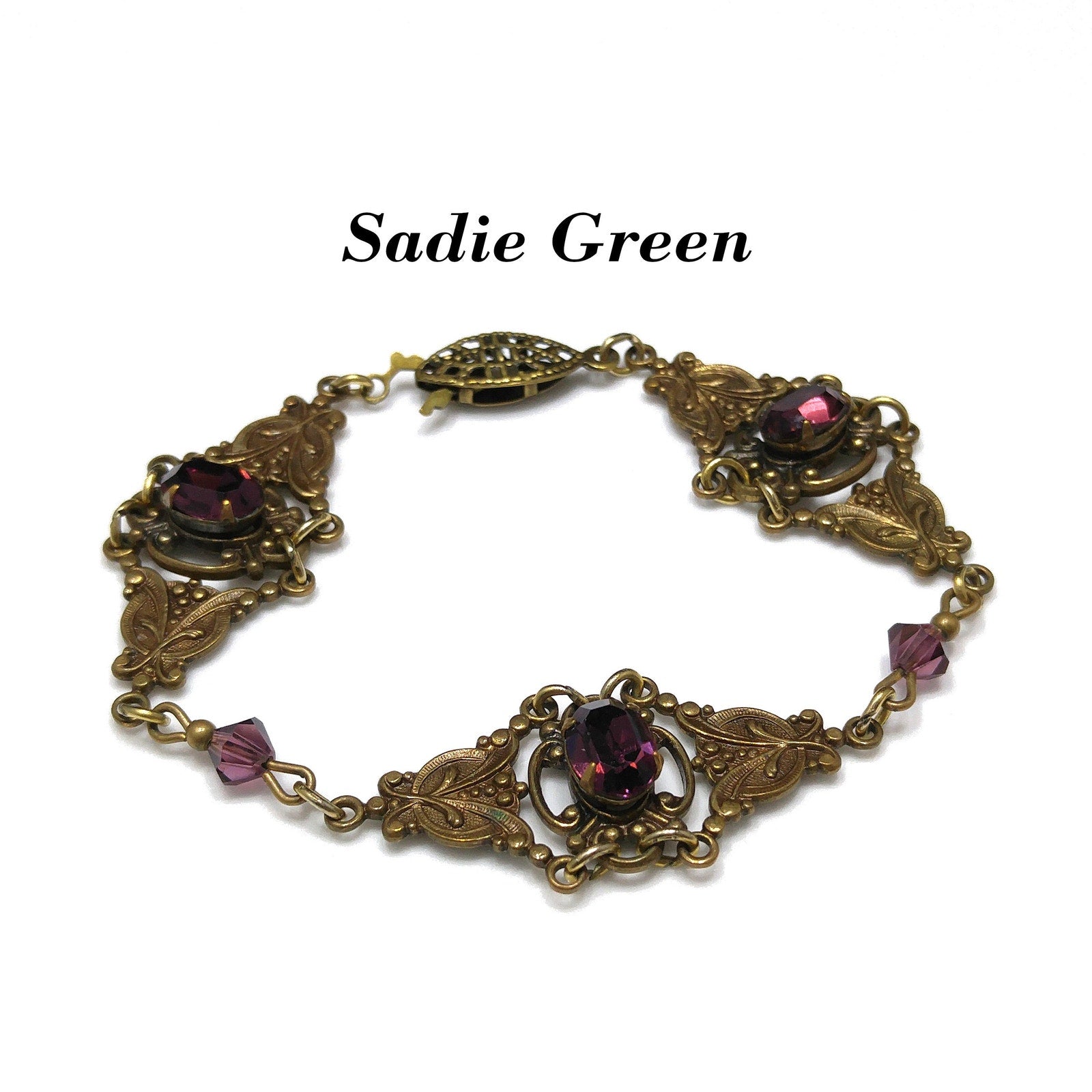*Description: This is a beautiful Sadie Green Art Nouveau bracelet with three diamond shaped links with a faux amethyst faceted glass stone, prong set, in the center of each. This is a smaller size at 6 3/4 Inches in length. This is a beautiful bracelet, light in weight, sparkling stones, and a designer look. This would be a great addition to your vintage jewelry collection or make a great vintage gift!