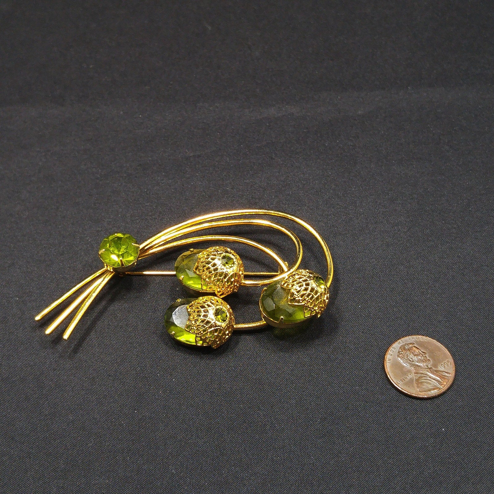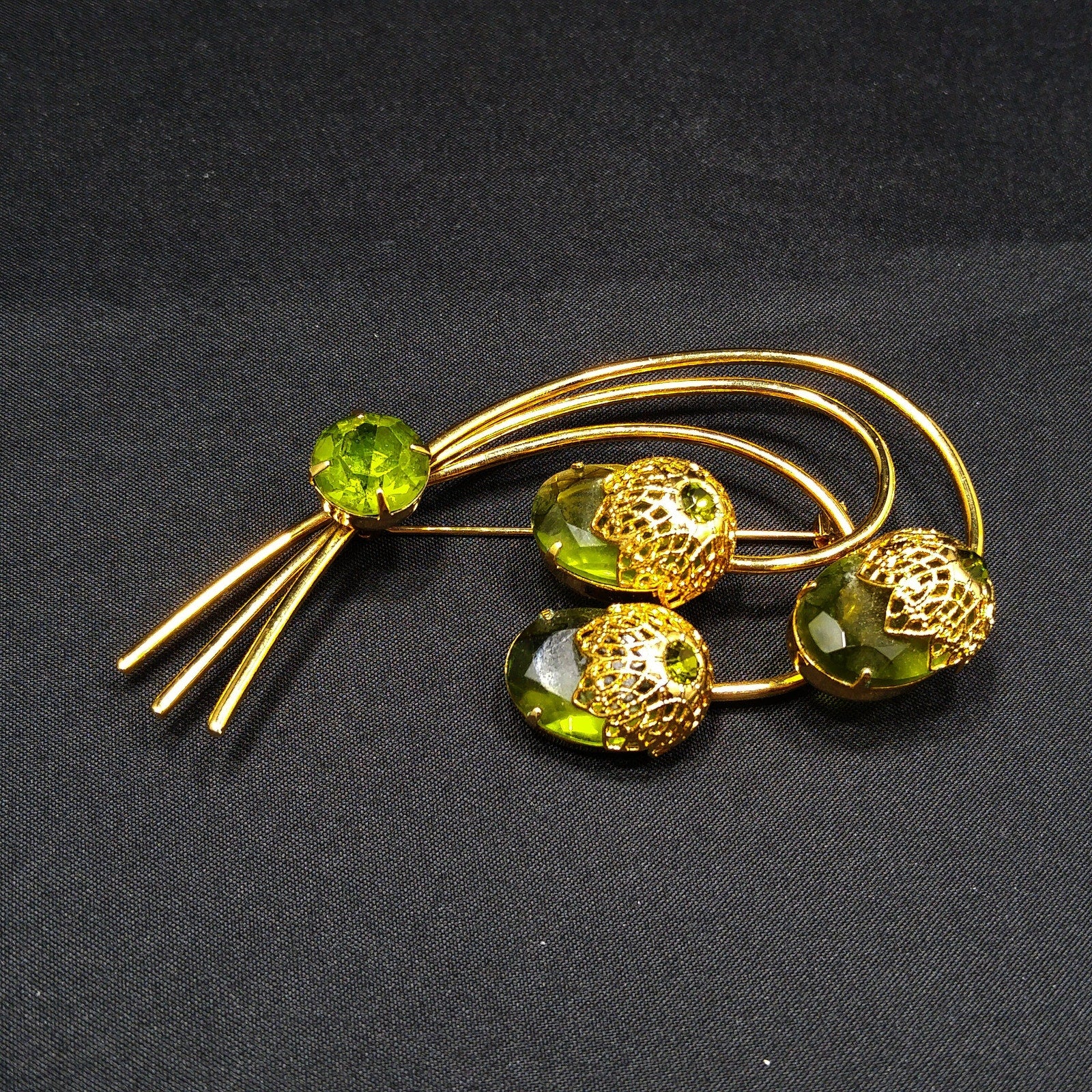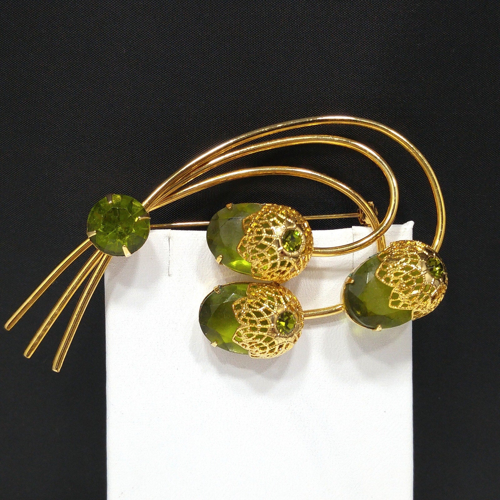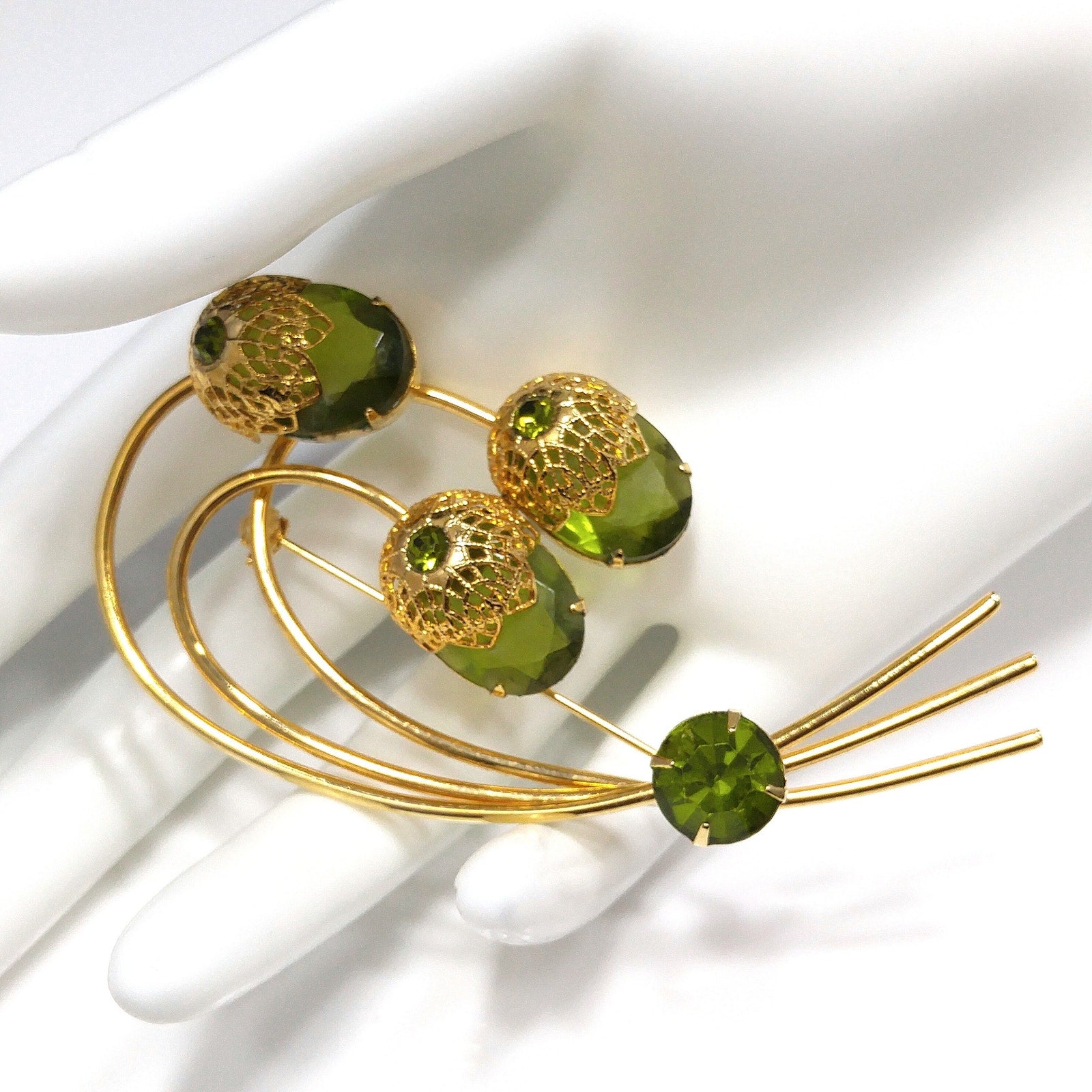 This is a stunning Sarah Coventry “Touch of Elegance” brooch from the 1970s, featuring three faceted green Austrian crystal ovals capped with gold tone filigree floral tops. Each floral cap is set with a small green rhinestone chaton, and another larger rhinestone sparkles at the base of the stem.