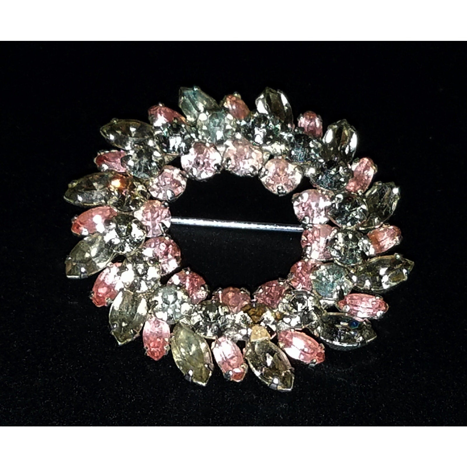 Sherman 1950s Pink & Smoky Gray Rhinestone Wreath Brooch | Rhodium Plated Mid-Century Signed Pin