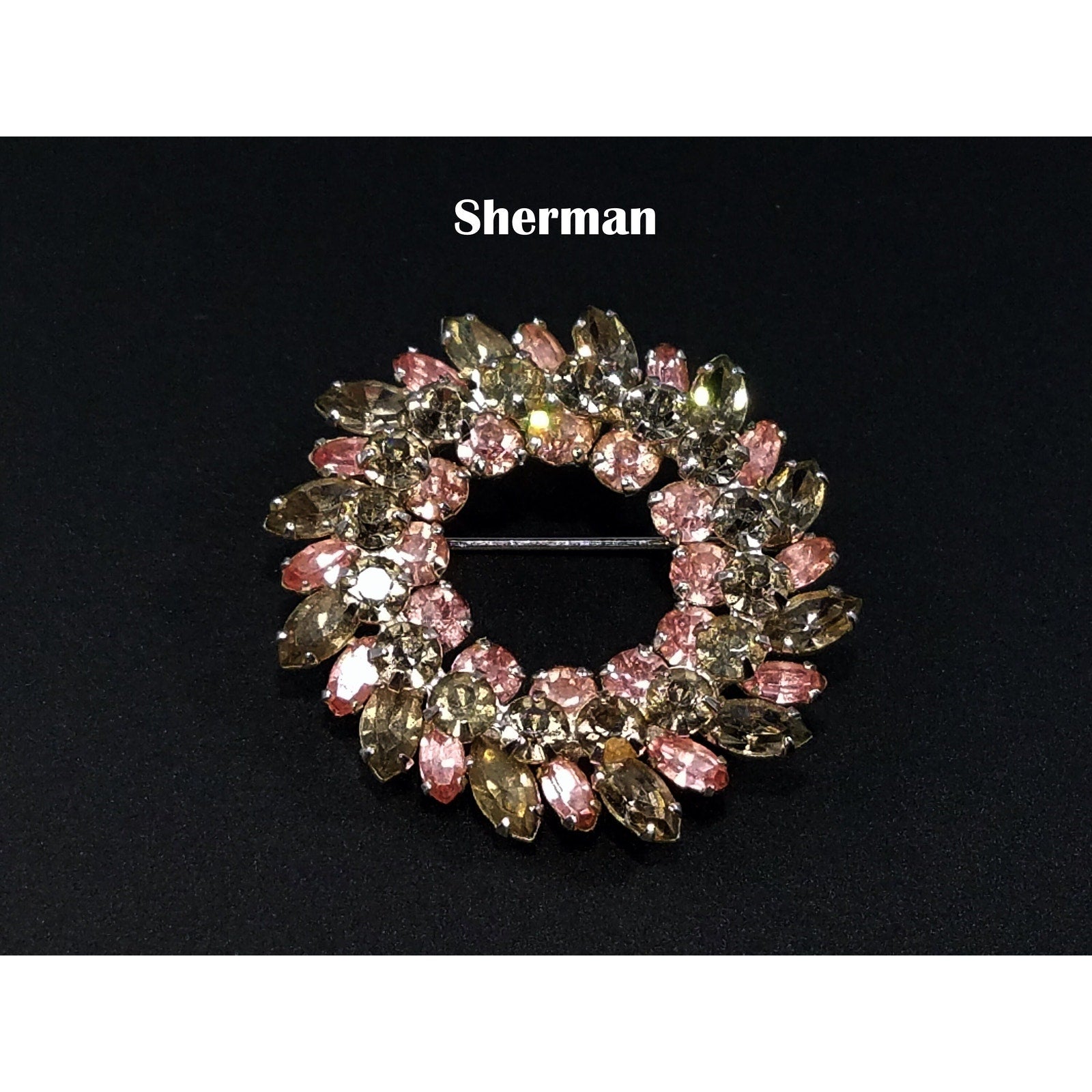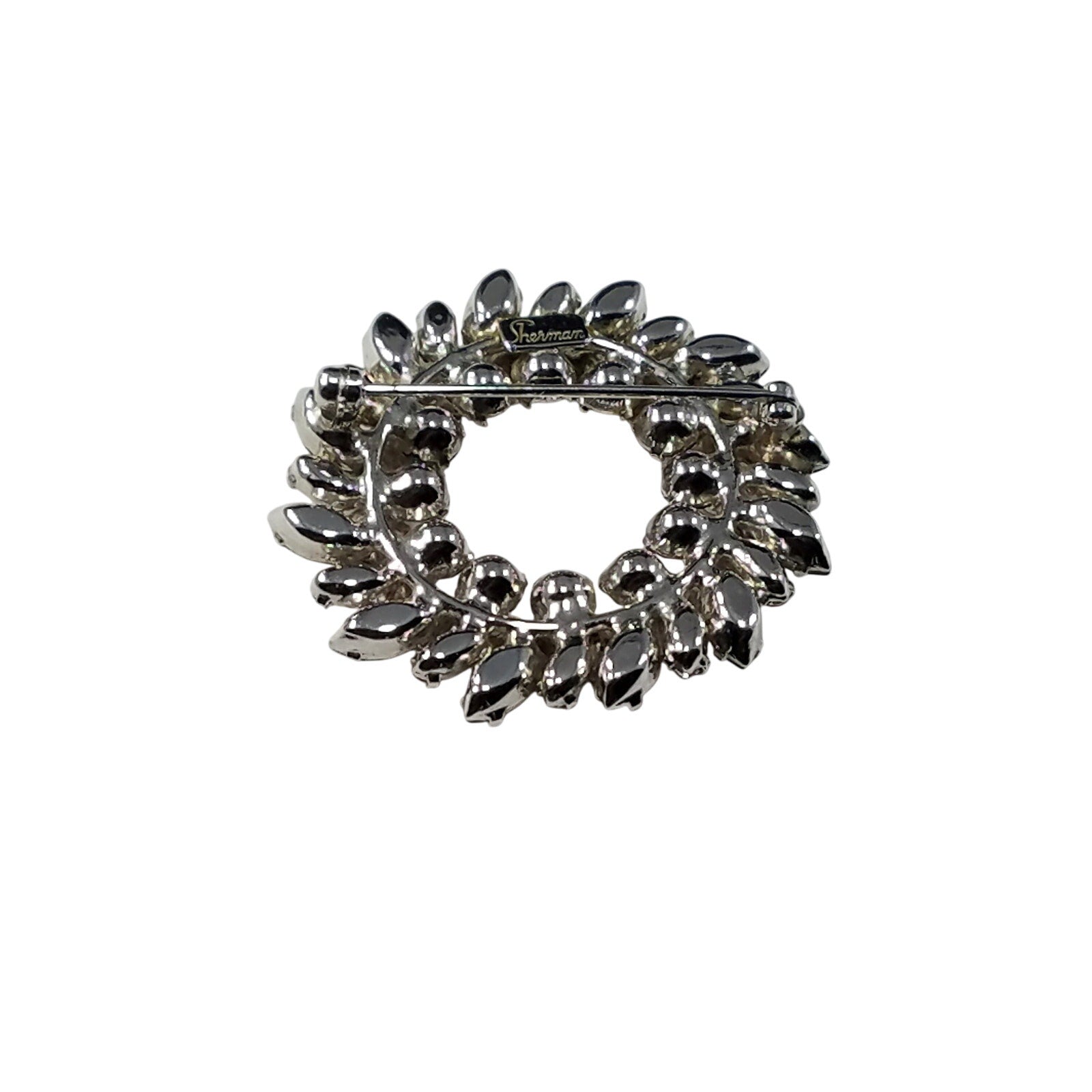 This mid-century Sherman rhinestone wreath brooch glimmers with quiet elegance. Designed in the 1950s and signed Sherman, it features layers of soft pink and smoky gray crystals arranged in a wreath-style motif. Each stone is prong-set in a brilliant rhodium-plated setting that enhances the cool, icy sparkle.