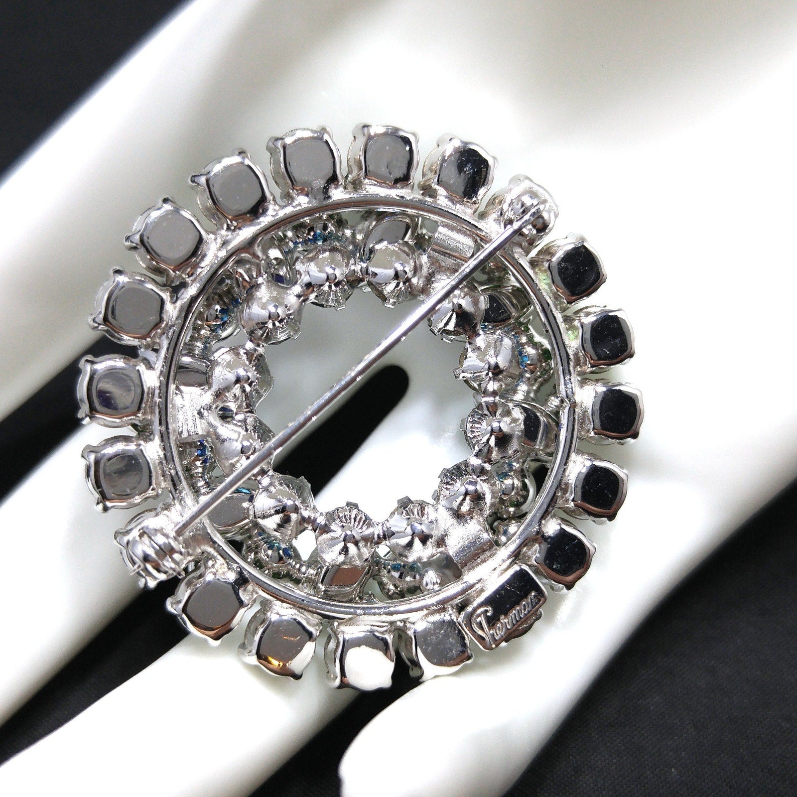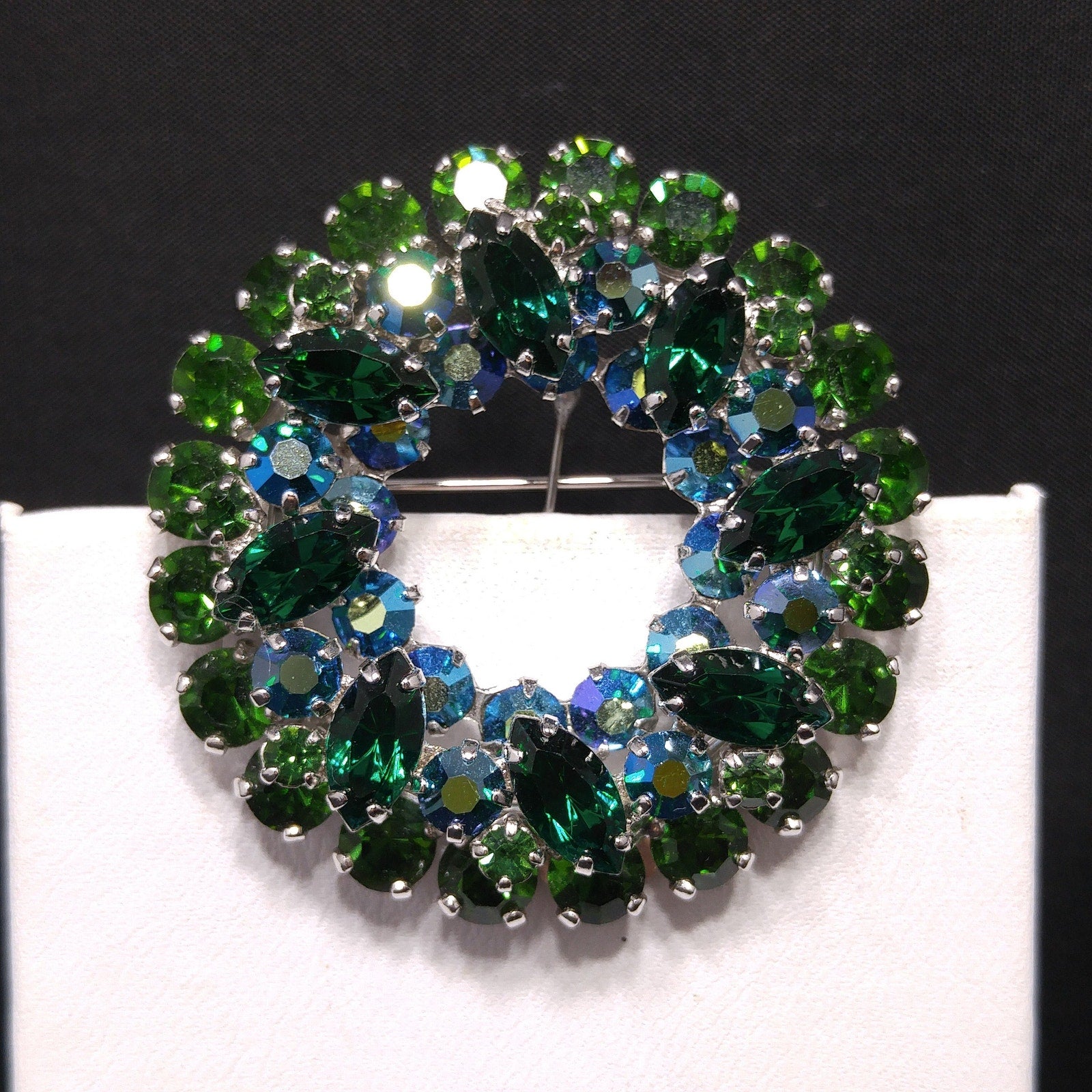 This stunning 1960s Sherman wreath brooch glows with deep emerald, bright leaf-green, and dazzling peacock-blue aurora borealis stones, creating a lush, layered circle of sparkle. Each rhinestone is prong-set in brilliant rhodium plating, a hallmark of Sherman’s world-class craftsmanship and eye for luxury detail.