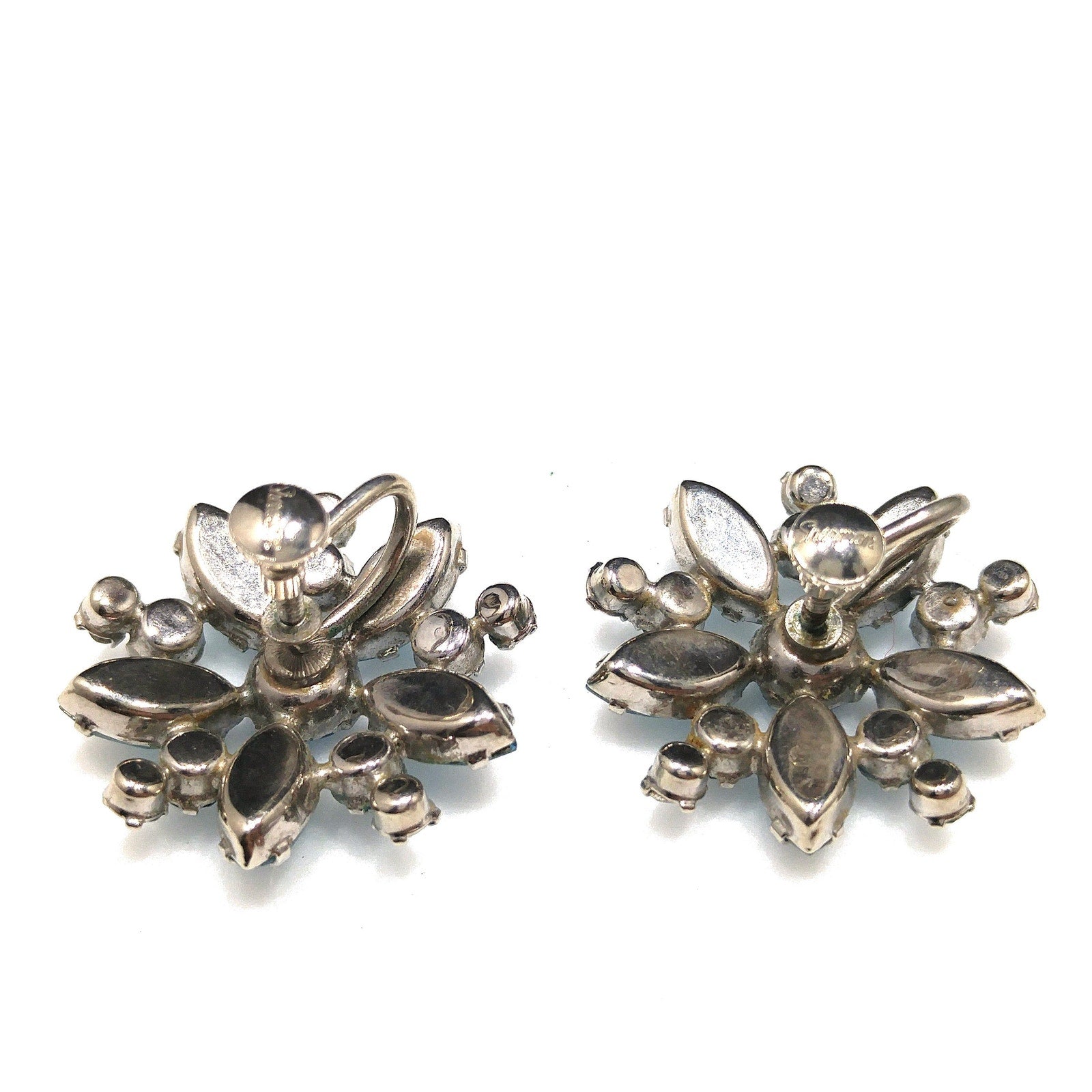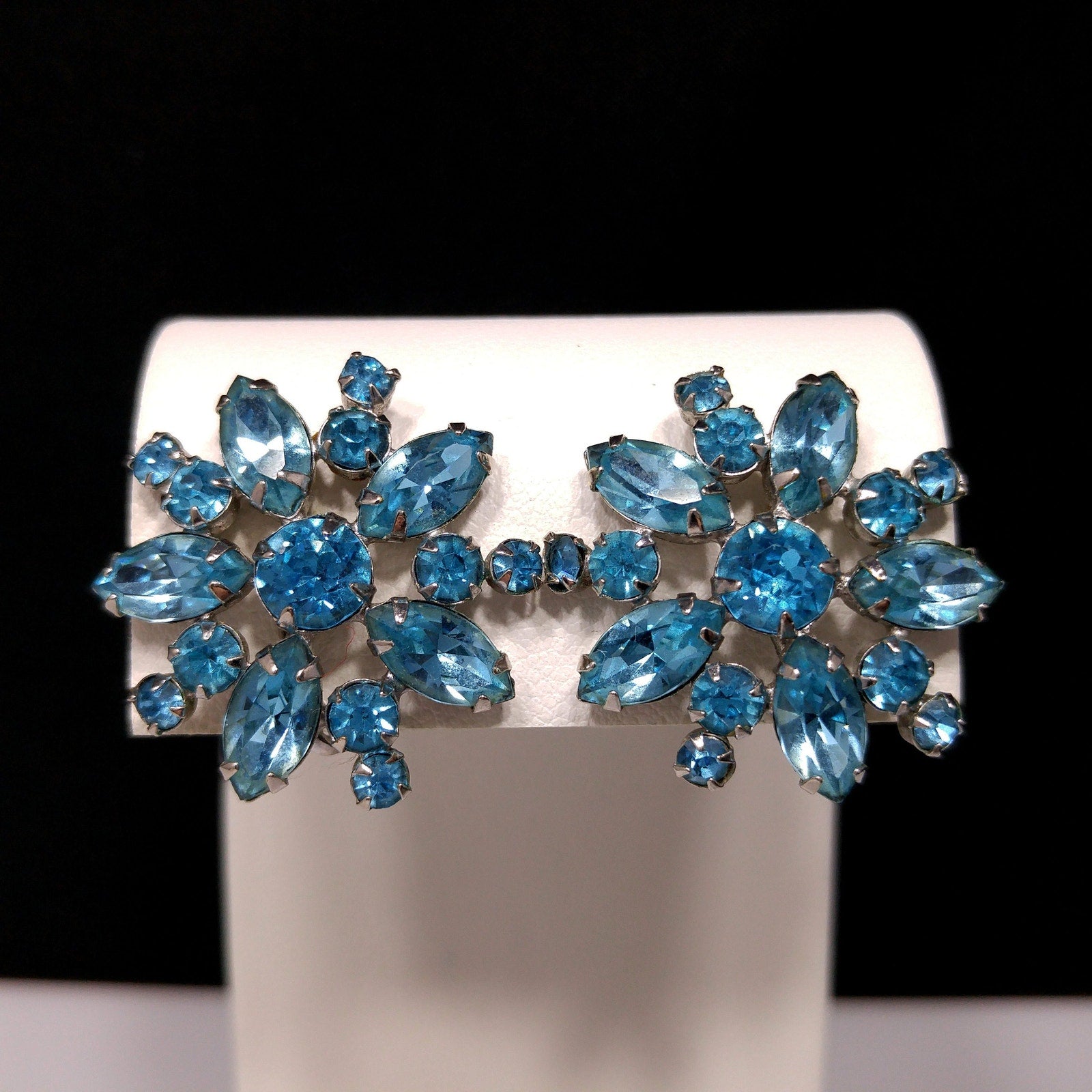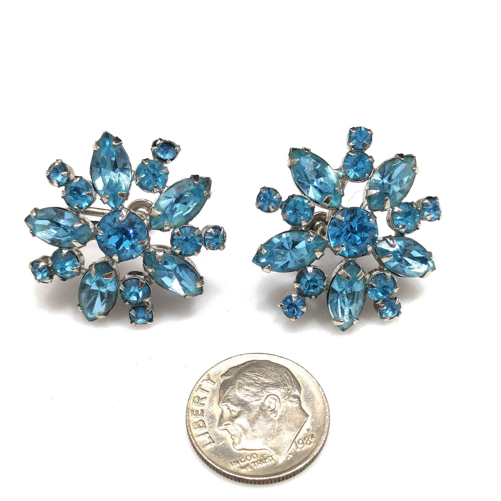 *Description: This is a beautiful pair of turquoise rhinestone Sherman screw back earrings with rhodium plating from the 1950s. Each earring has a combination of chaton and marquise cut rhinestones and are all prong set. This would be a great addition to your vintage jewelry collection or make a great vintage gift!