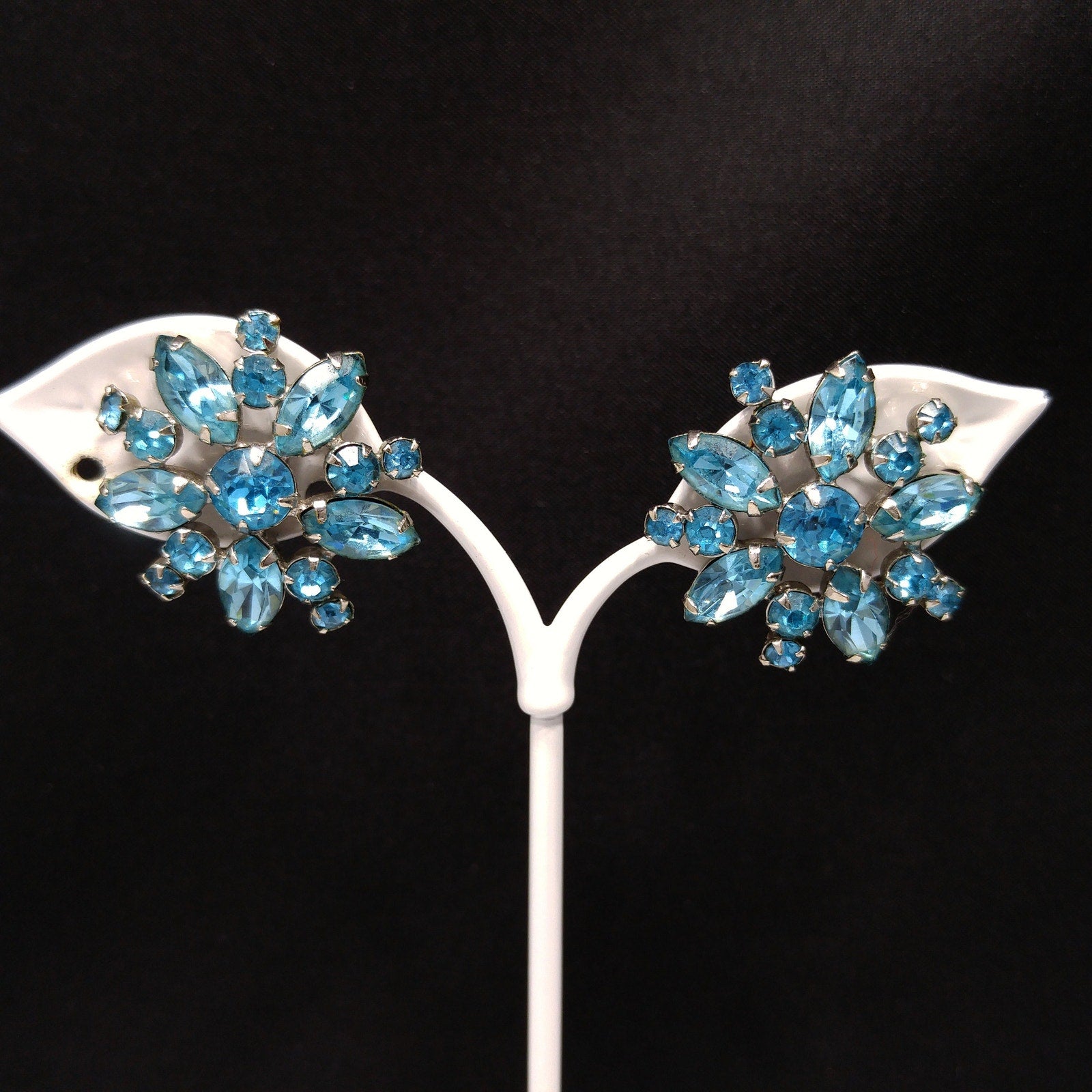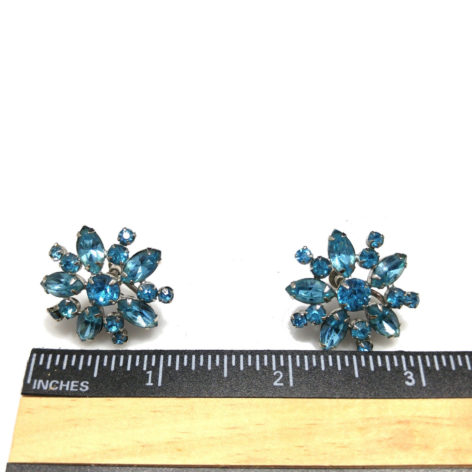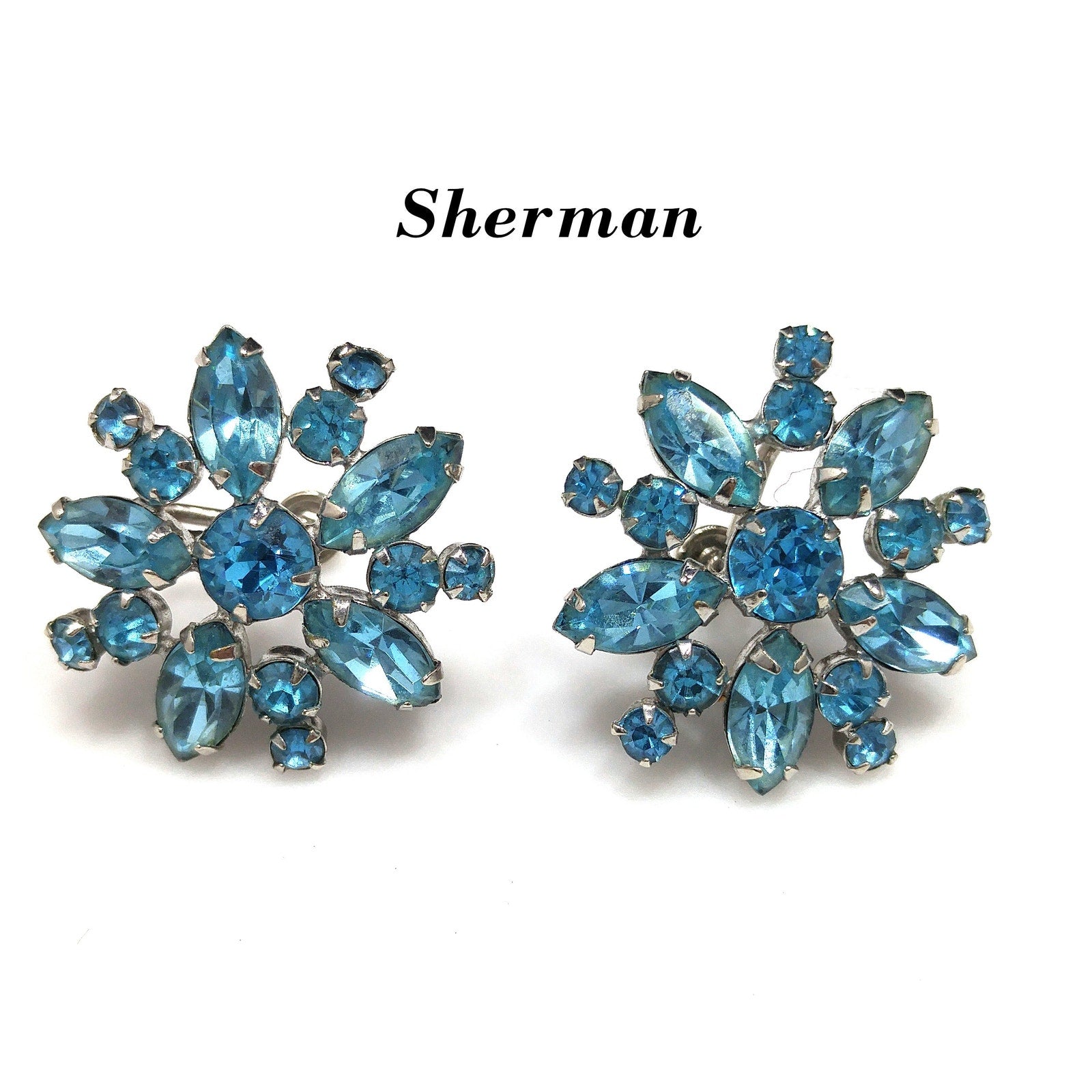 *Description: This is a beautiful pair of turquoise rhinestone Sherman screw back earrings with rhodium plating from the 1950s. Each earring has a combination of chaton and marquise cut rhinestones and are all prong set. This would be a great addition to your vintage jewelry collection or make a great vintage gift!