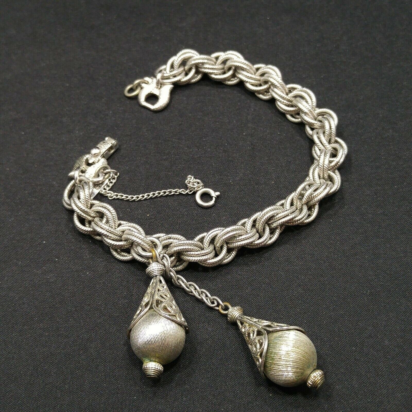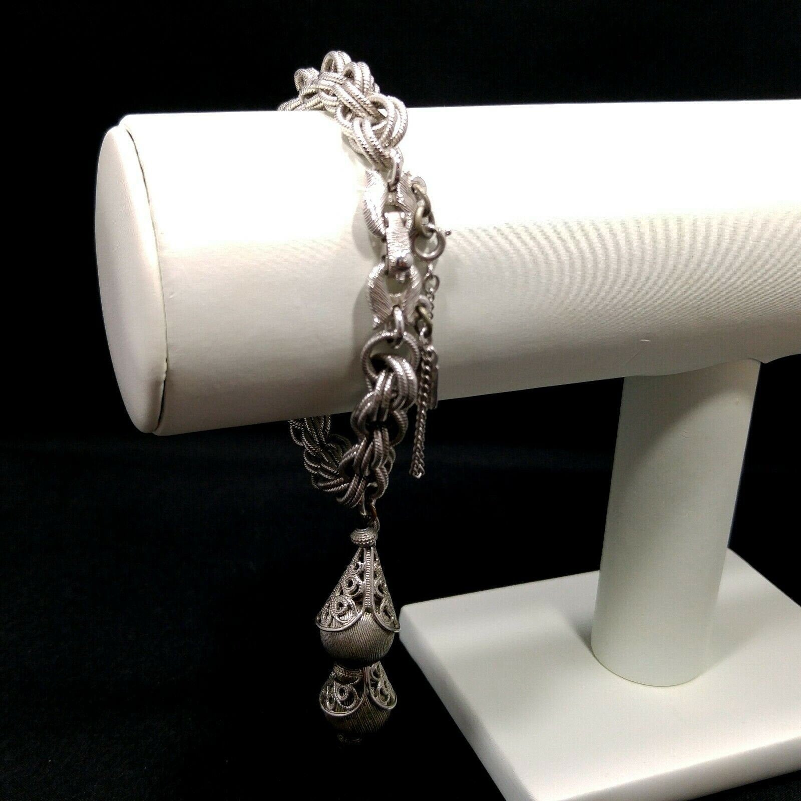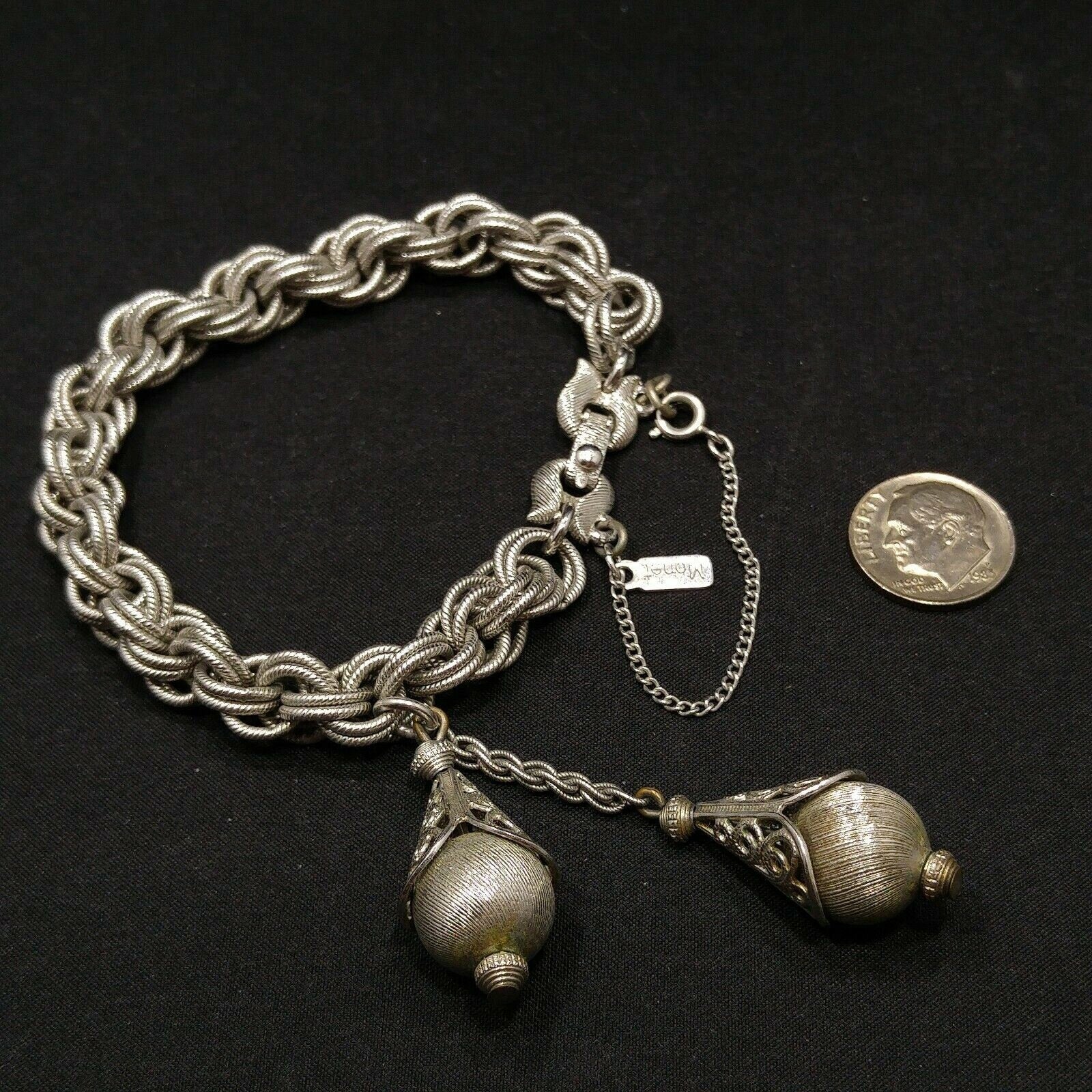 *Description: This is a beautiful vintage Monet silver toned bracelet that was part of the "Bolero Series" with two dangling tassels from the 1960s. This is a book piece and is found in "Monet, the Master Jewelers" by Alice Vega, on page 191. The silver tone is probably rhodium plating. It is a unique style and is a great Monet vintage design. This would be a great addition to your vintage jewelry collection or make a great vintage gift!