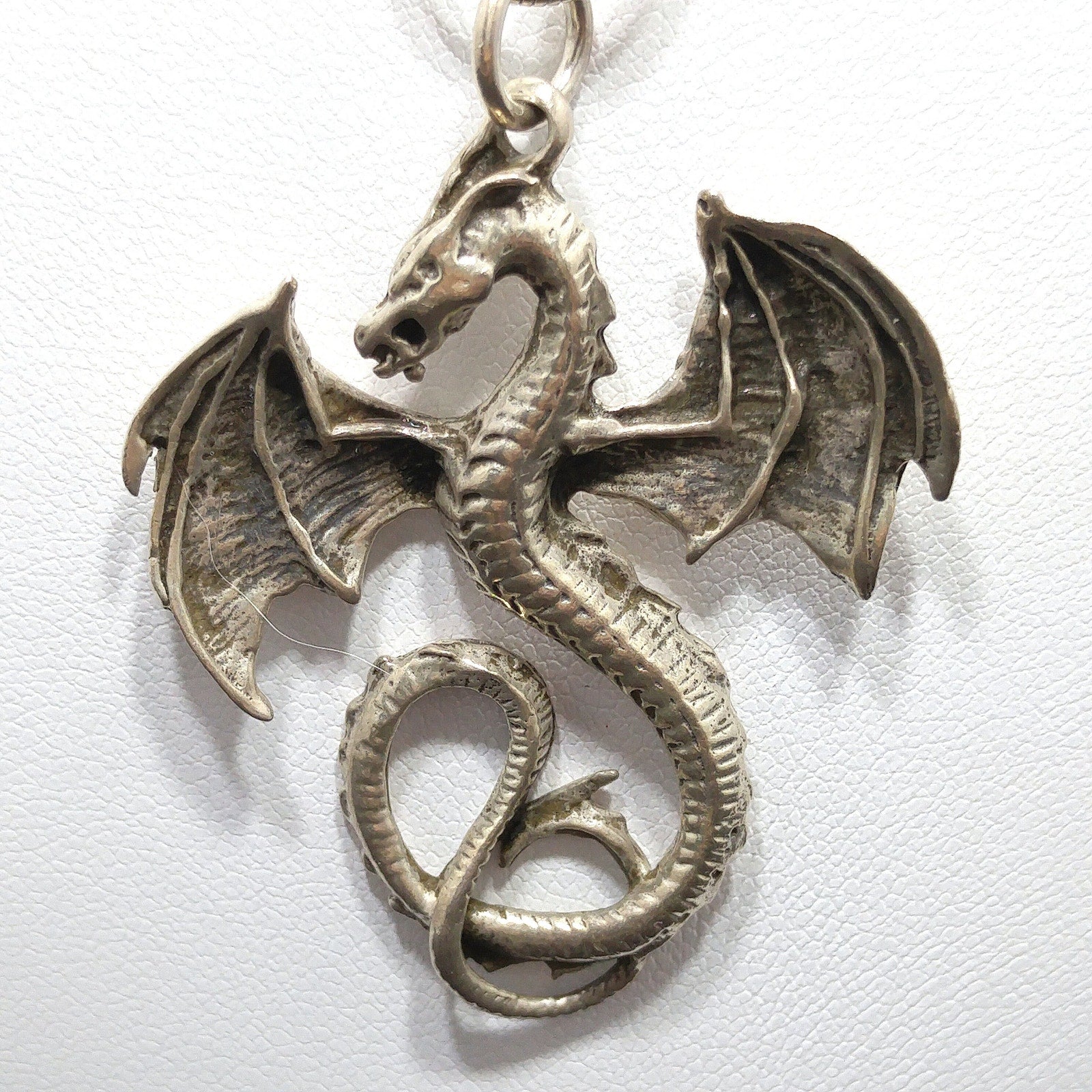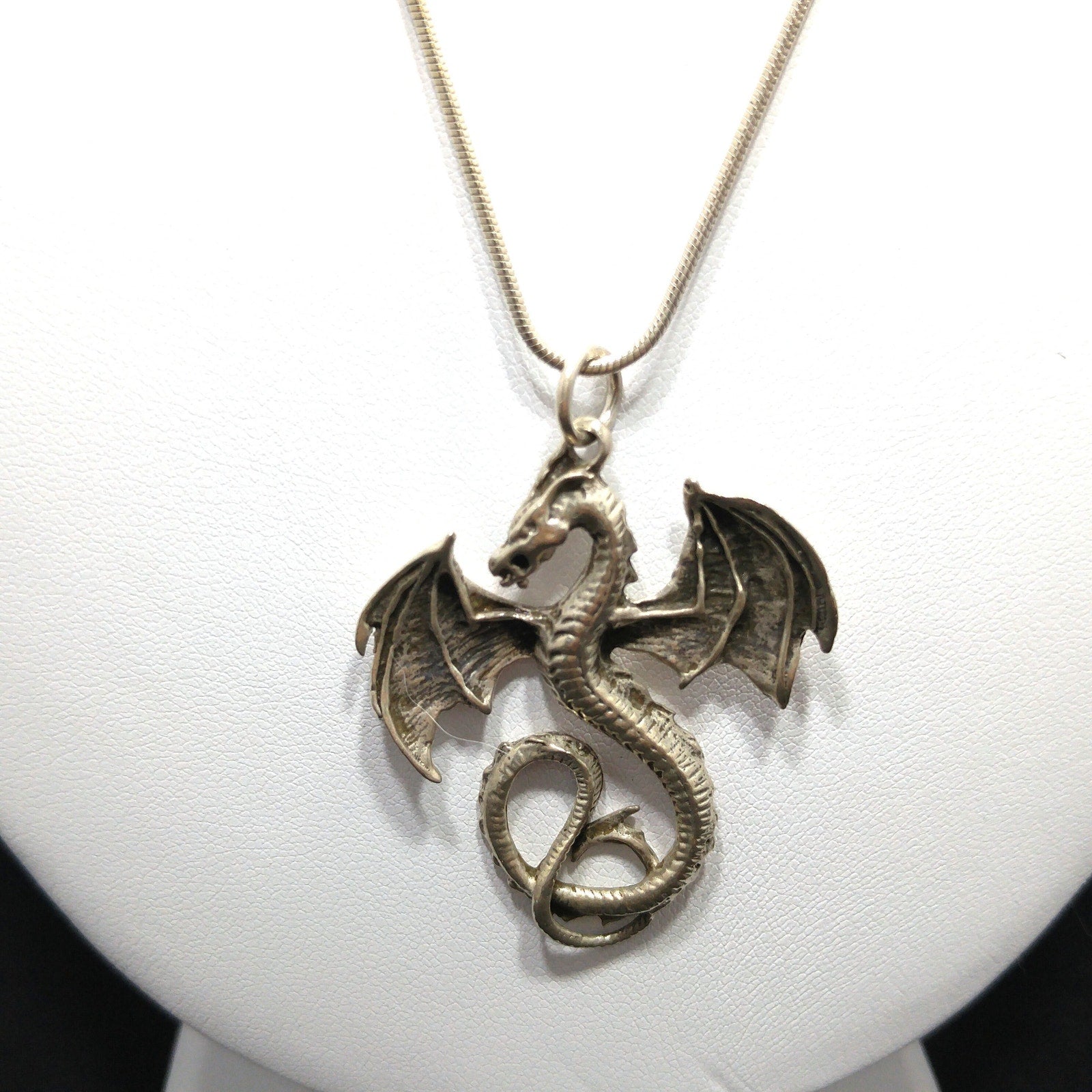 *Description: This is a great vintage silver dragon pendant necklace from the 1970s. The necklace is a snake chain marked Italy 925 and may be a little newer than the pendant. The pendant is a winged dragon mythical creature stamped 925 on the back and possibly an additional marking which is unreadable. I dipped the pendant and chain in silver polish liquid briefly and the silver brightened up. It could be polished more or left with the natural patina. The front of the dragon pendant may have had a tiny bit of black enamel rubbed into the creases, as the back, which is smooth, has more of a silver colored finish. This would be a great addition to your vintage jewelry collection or make a great vintage gift!