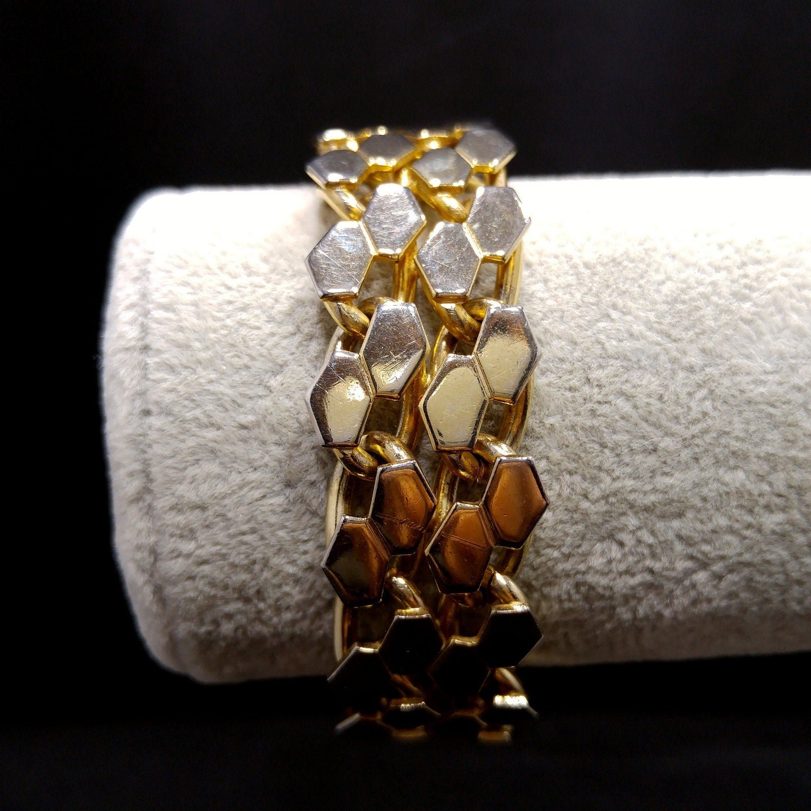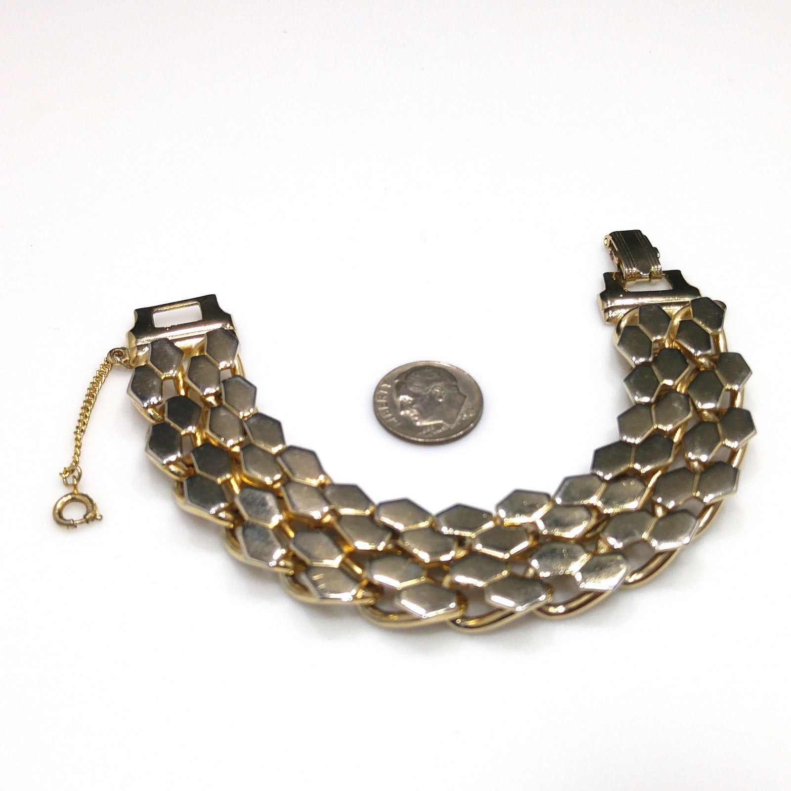 *Description: This is a beautiful gold plated snake chain pattern bracelet from the 1960s. Each scale is on top of curb chain, strengthening the bracelet for years to come. The bracelet has a safety chain and fold over hinged clasp. It has all of the characteristics of a designer bracelet without the hallmark. Great quality bracelet which would be a great addition to your vintage jewelry collection or make a great vintage gift!